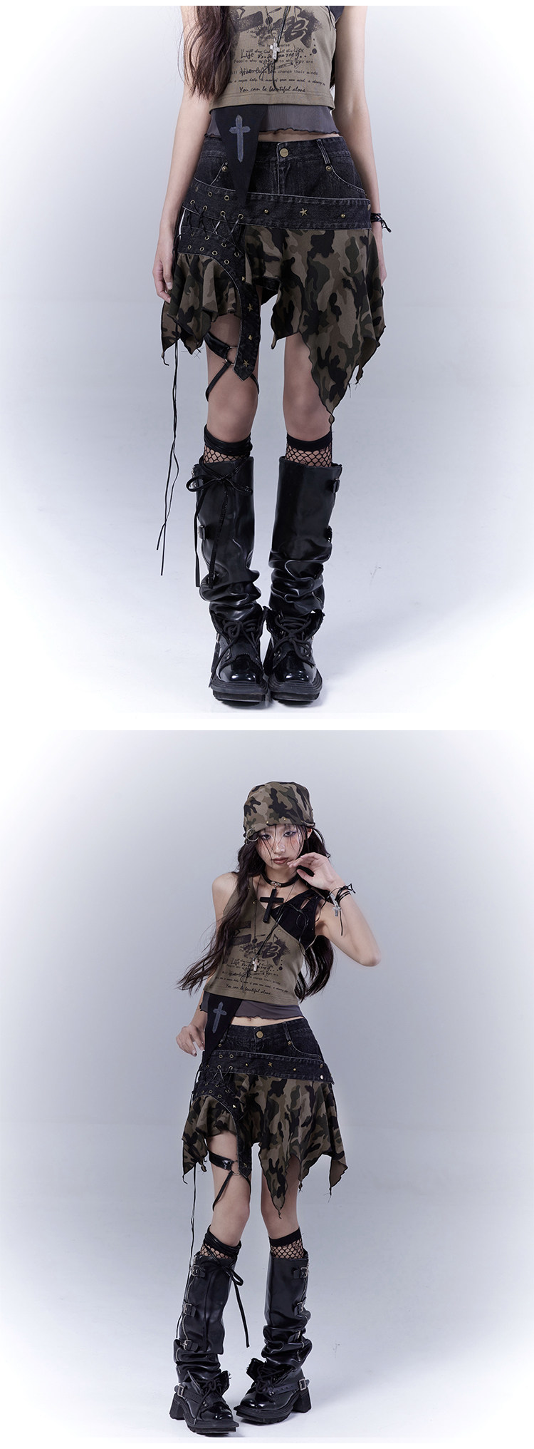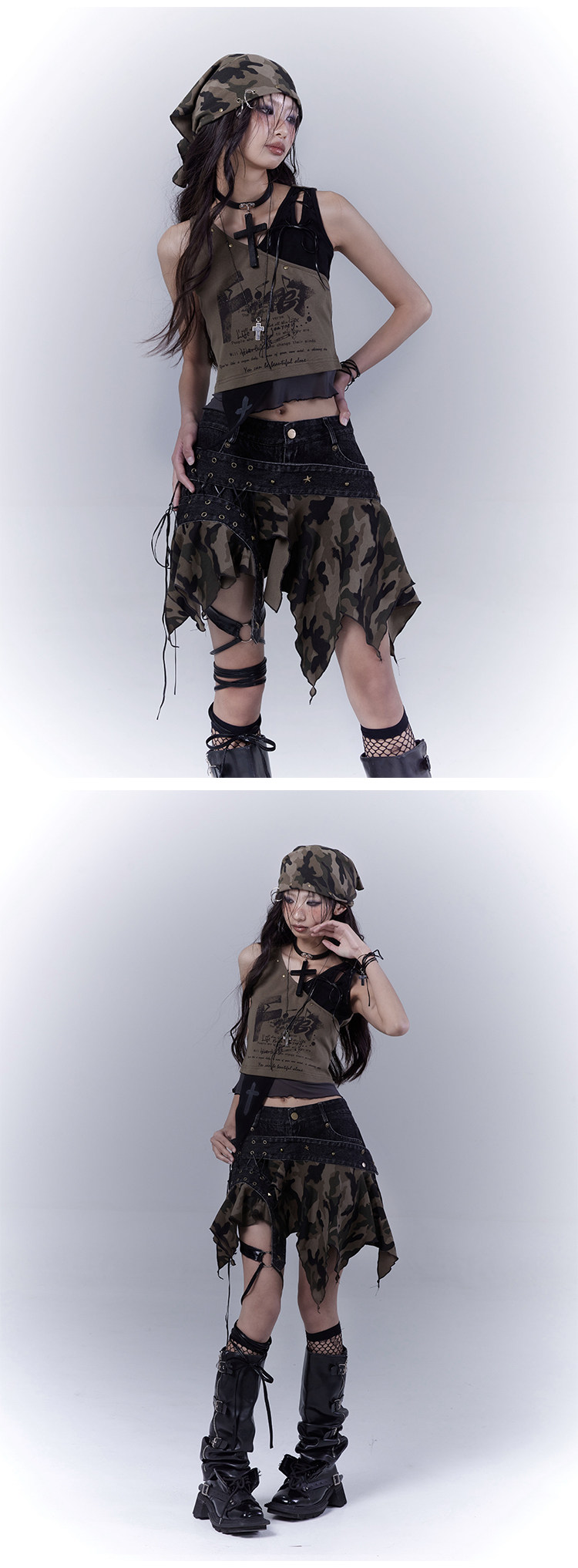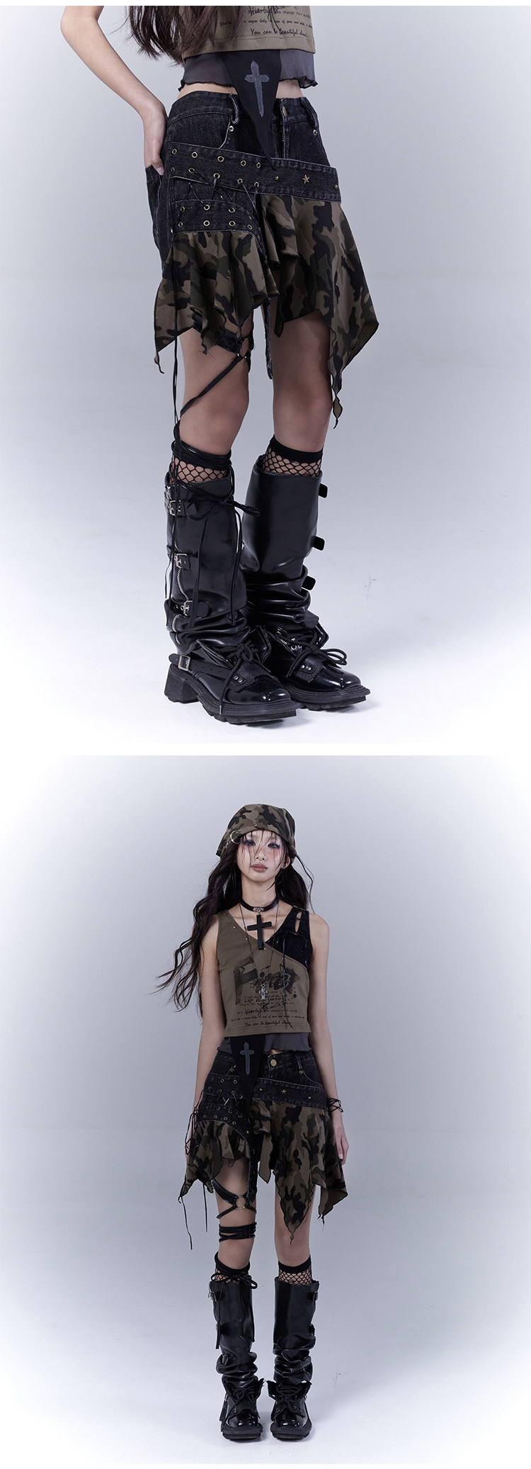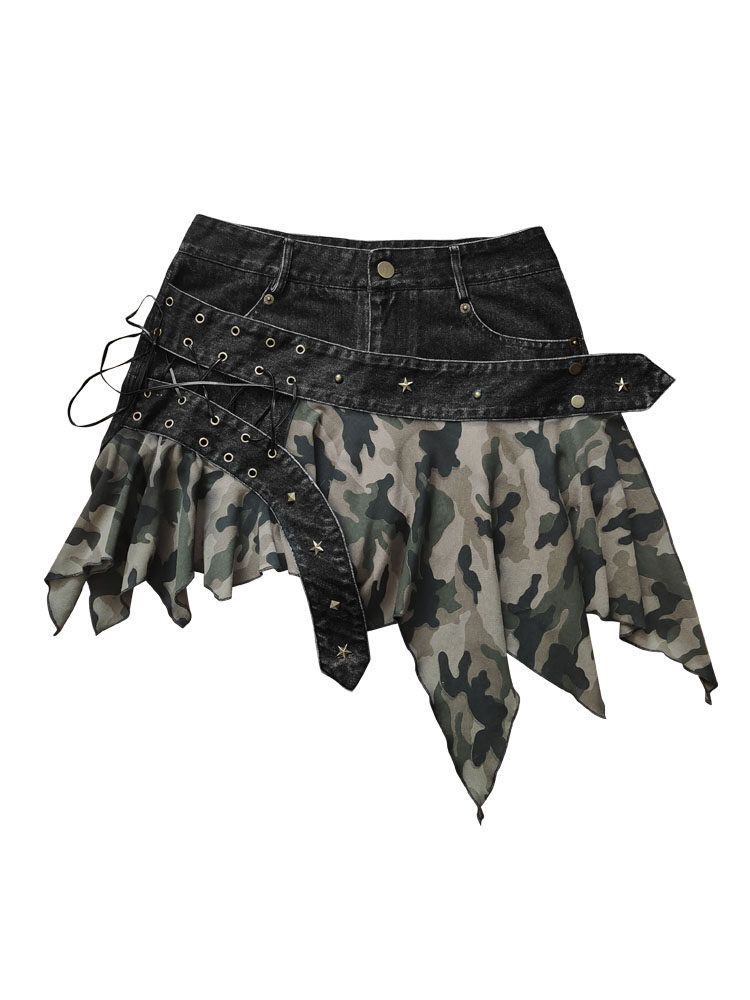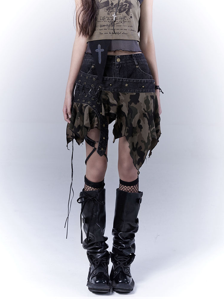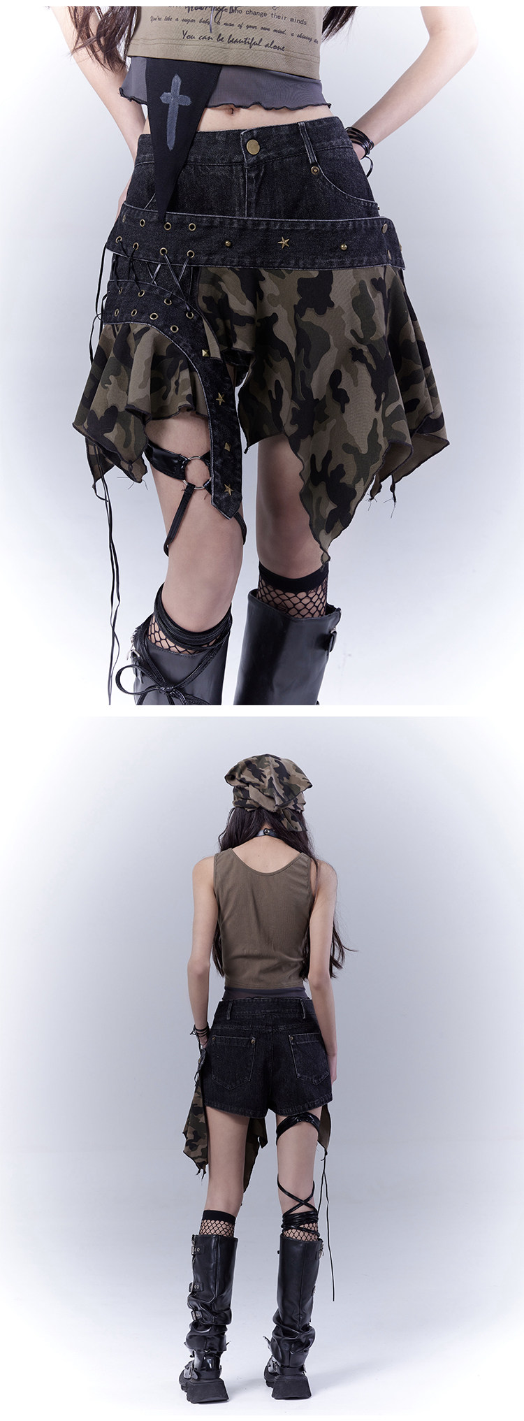 Original Design Damage Camouflage Lace-Up Short Denim Skirt NA8543