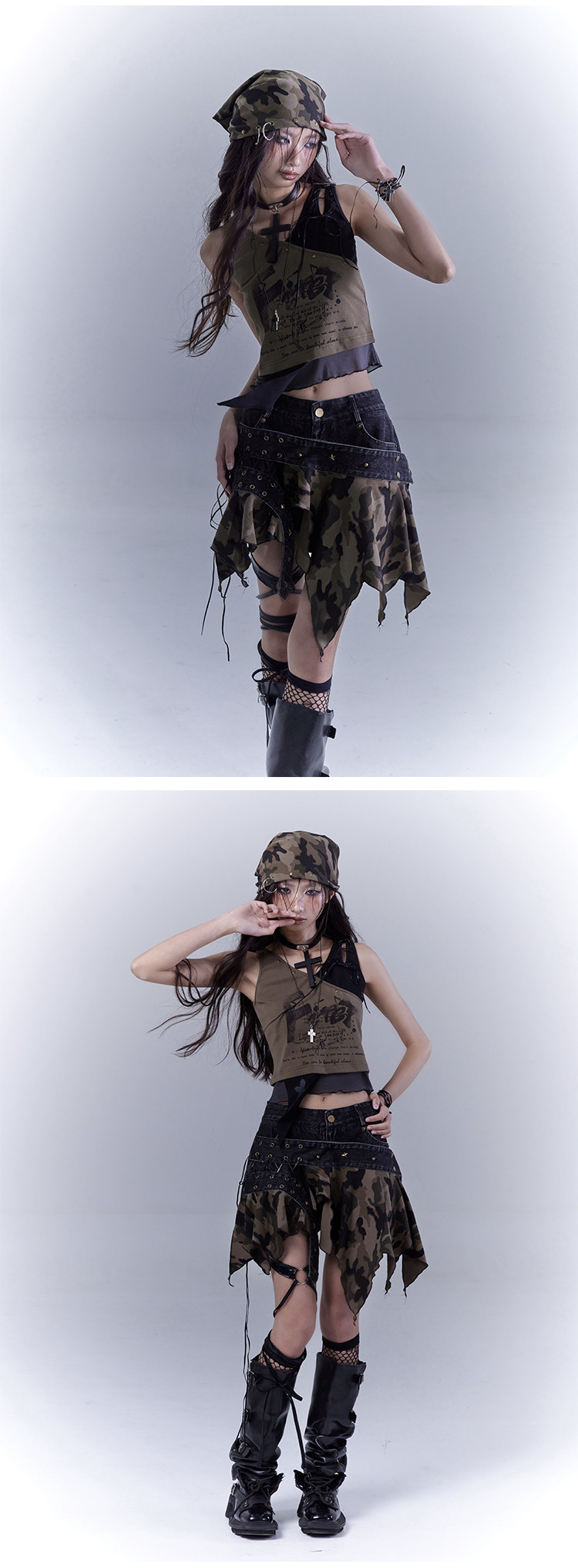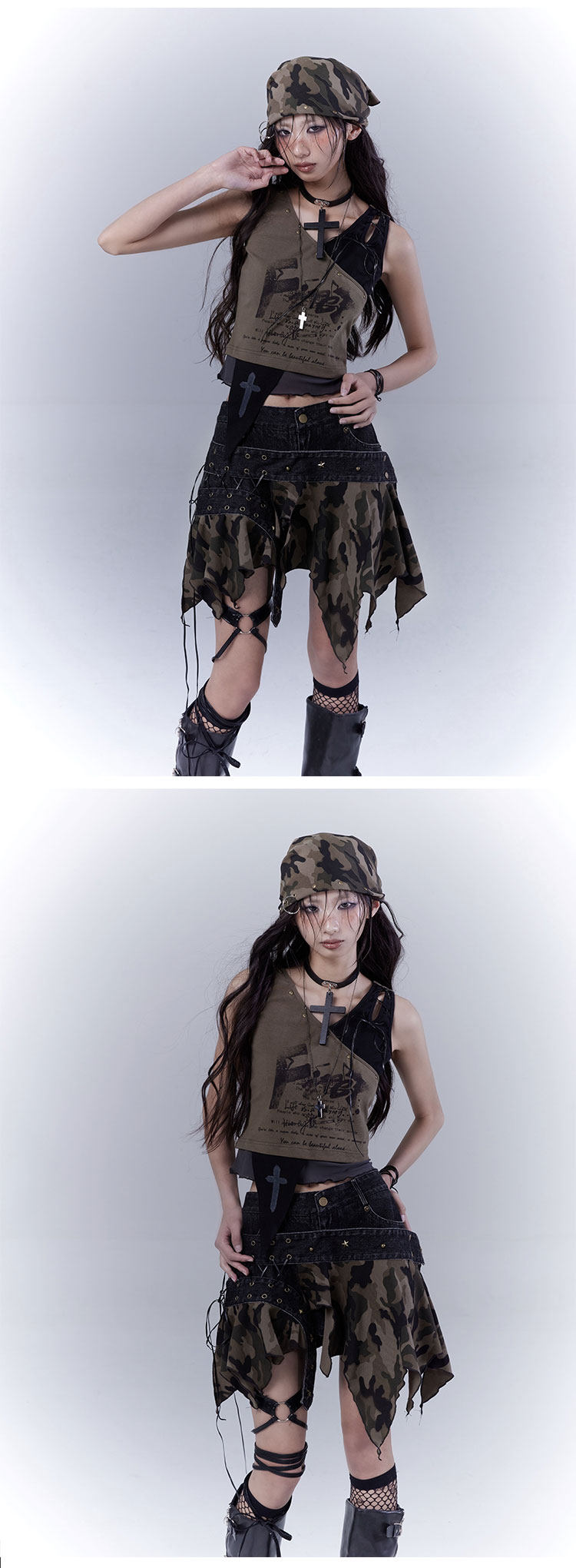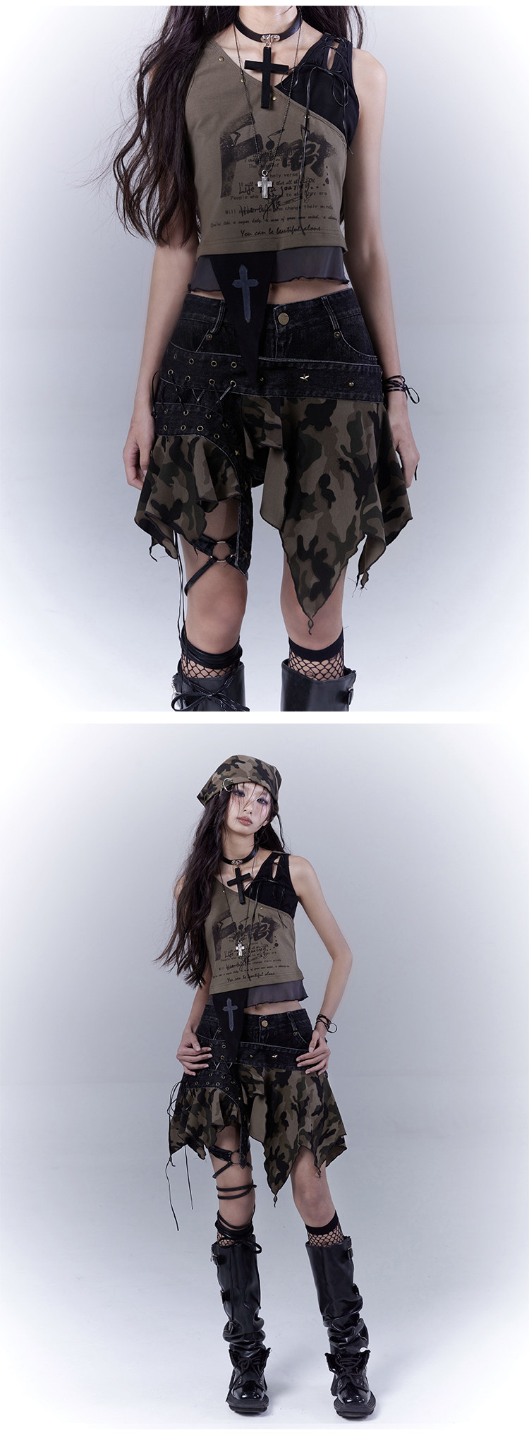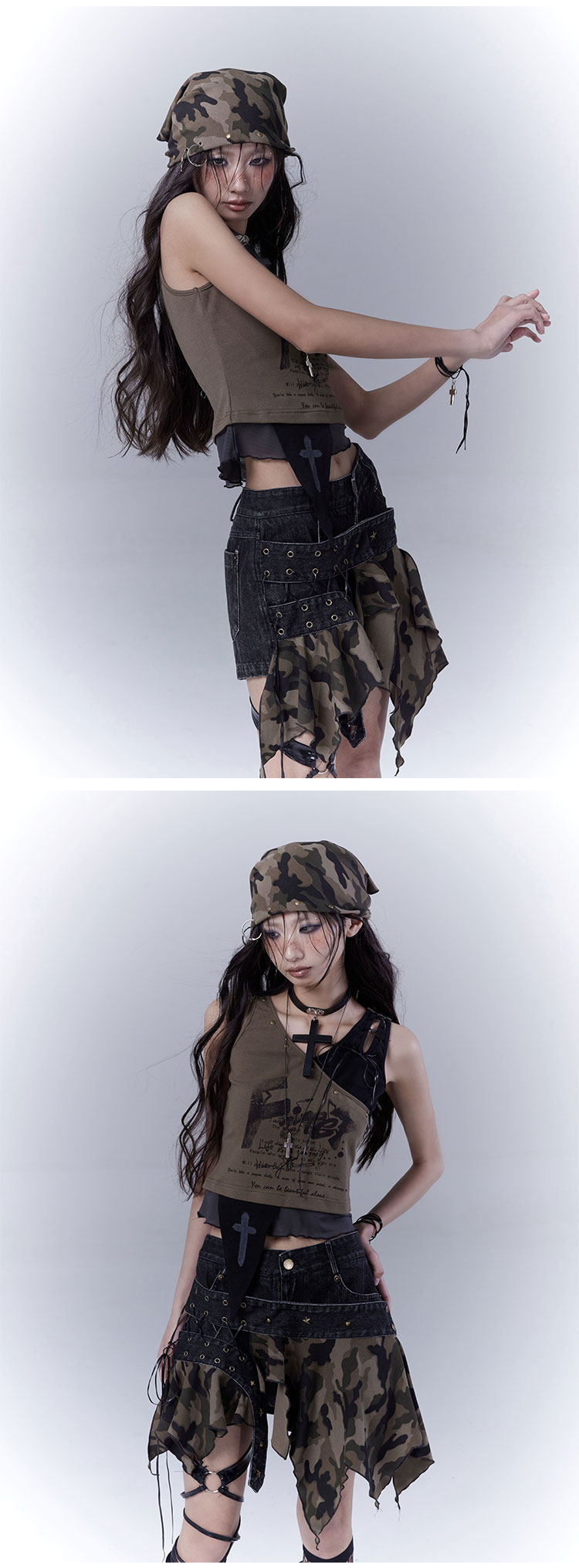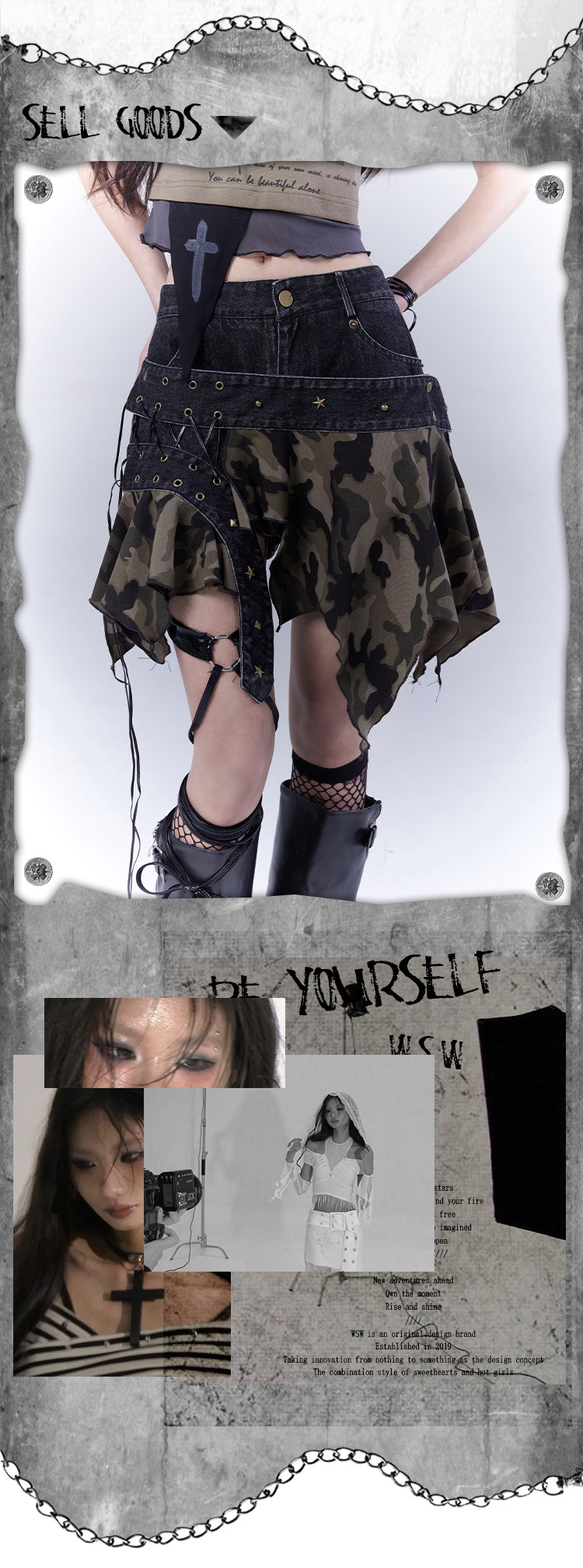 Original Design Damage Camouflage Lace-Up Short Denim Skirt NA8543