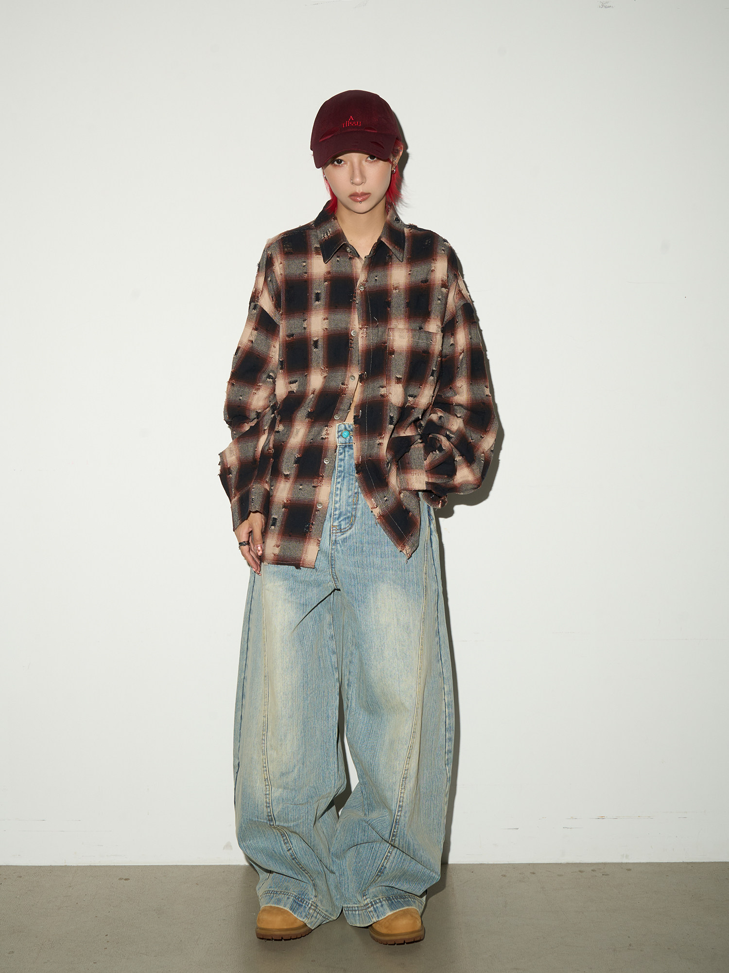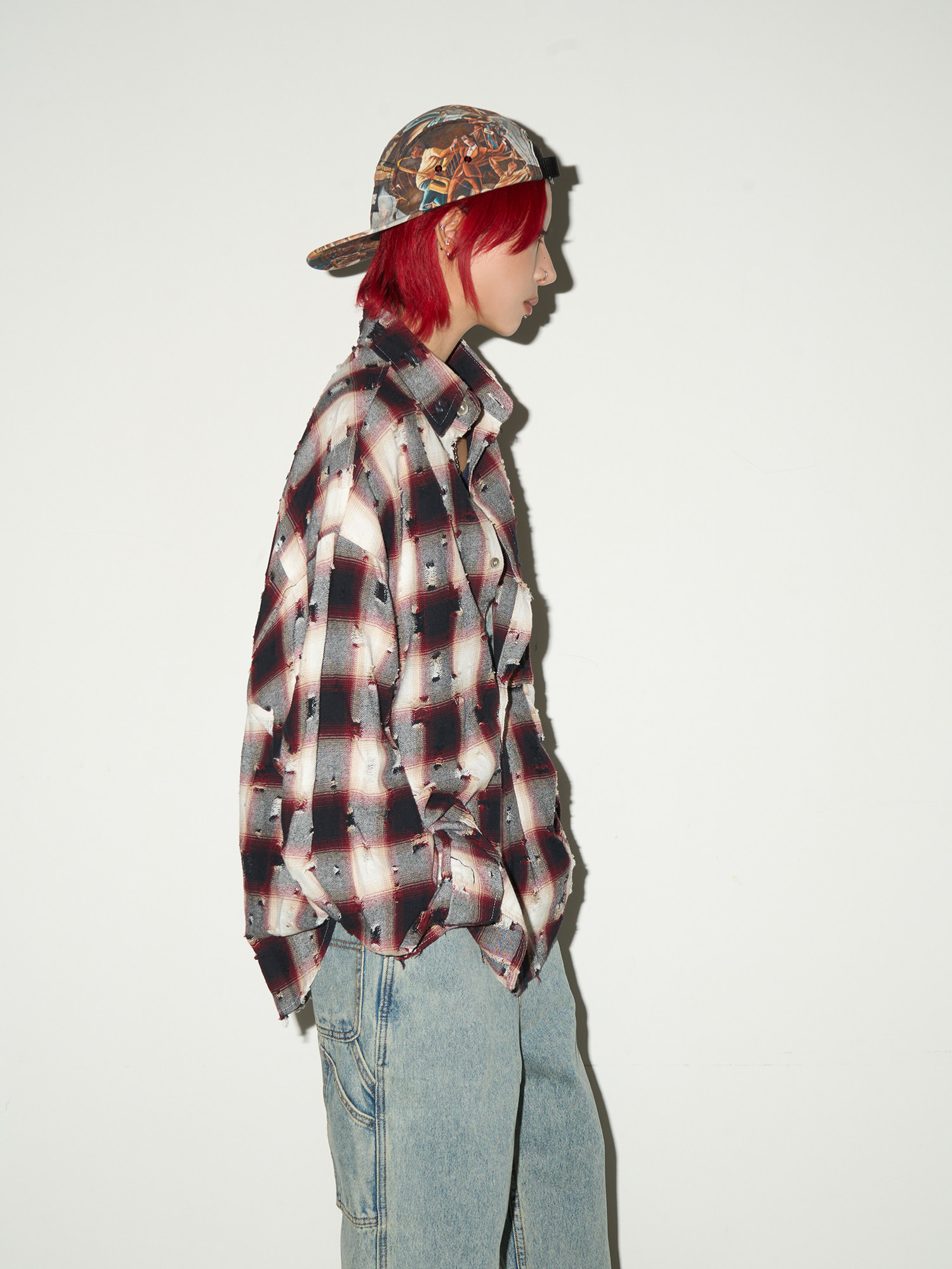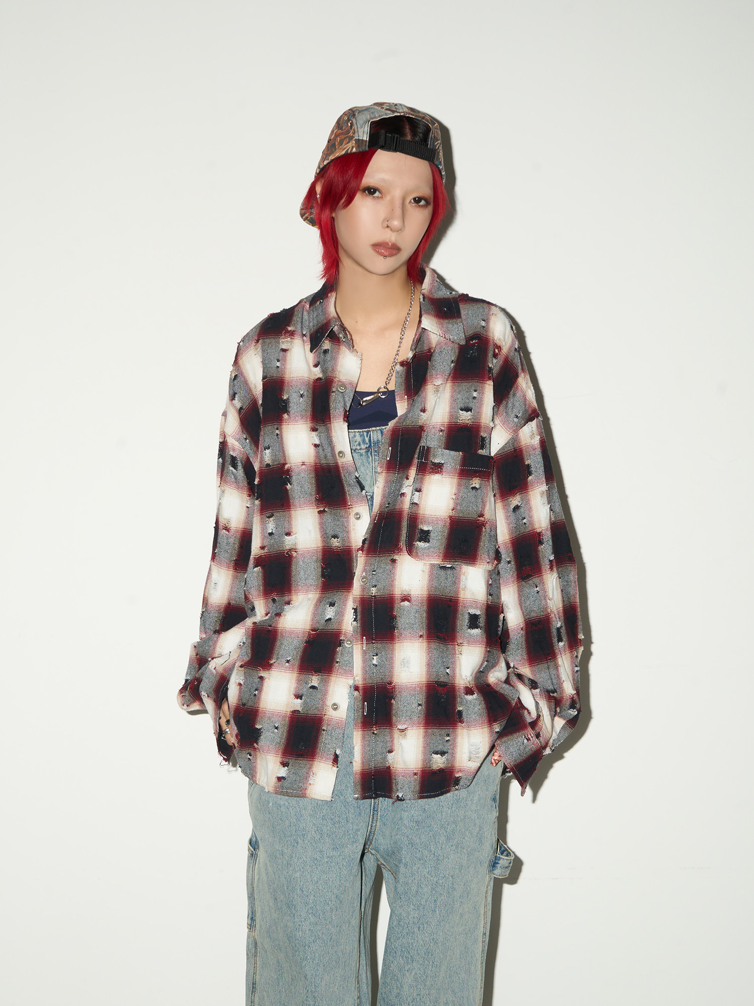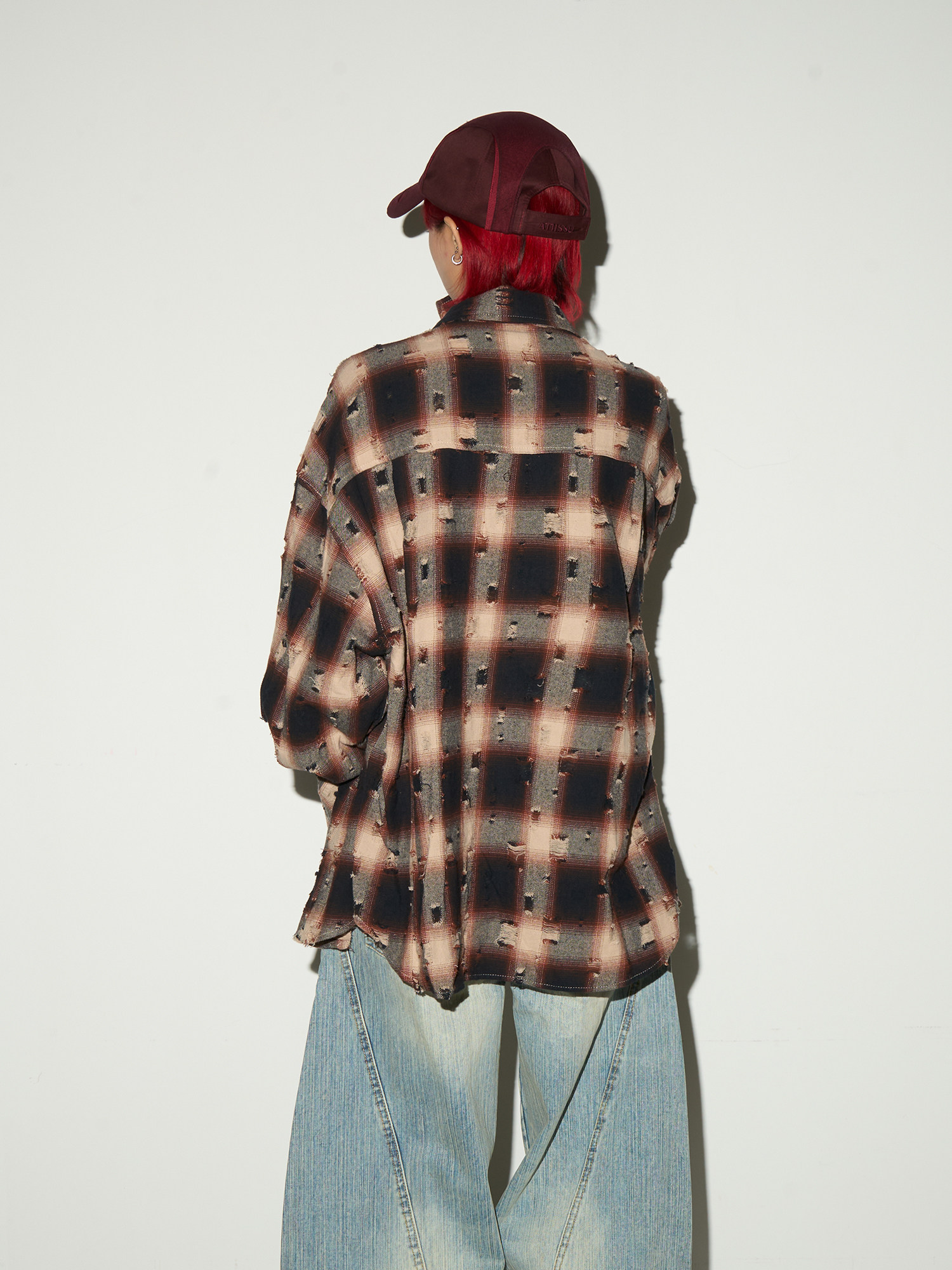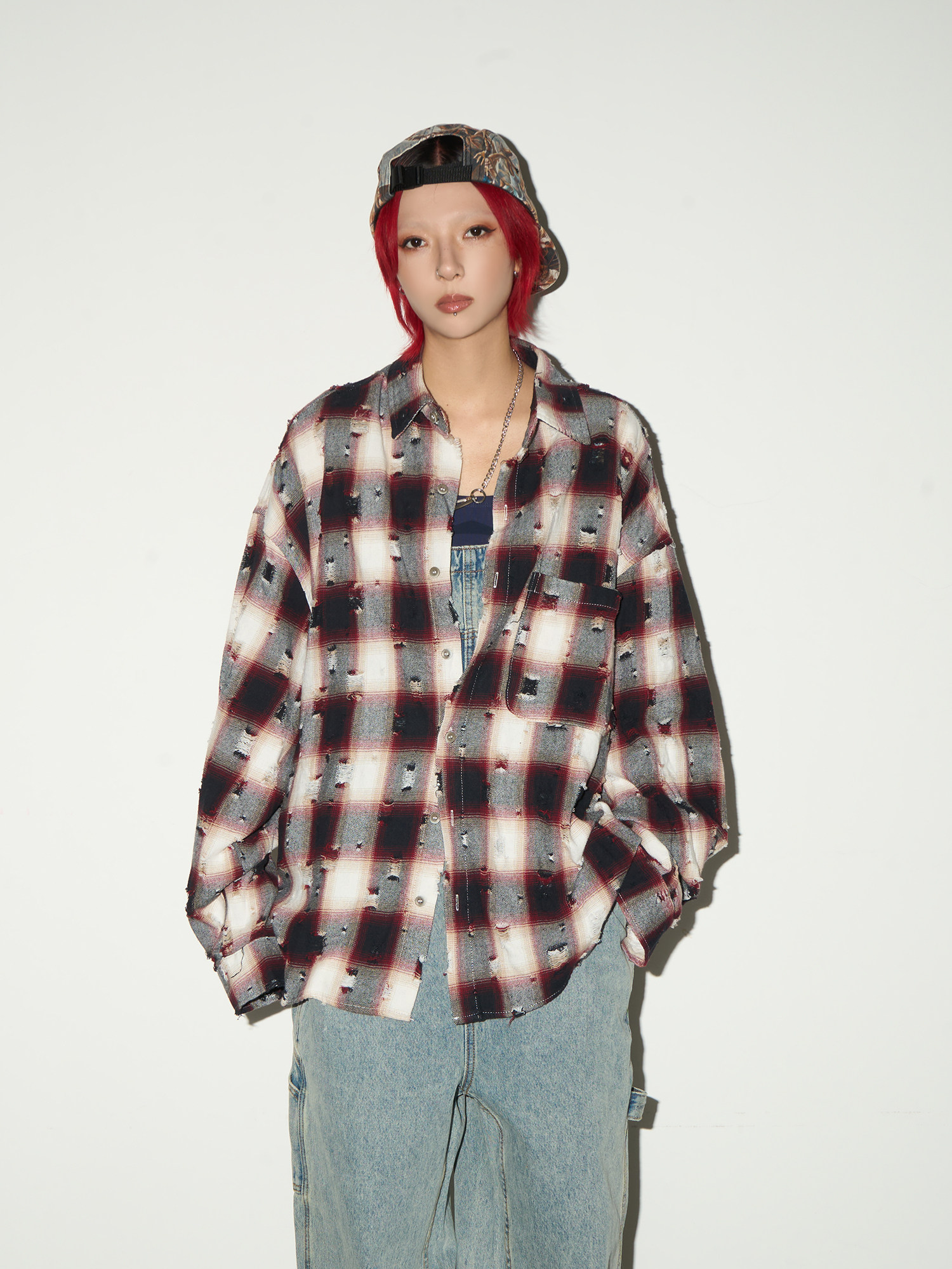 Ripped Plaid Oversize Long Sleeve Shirt NA9149