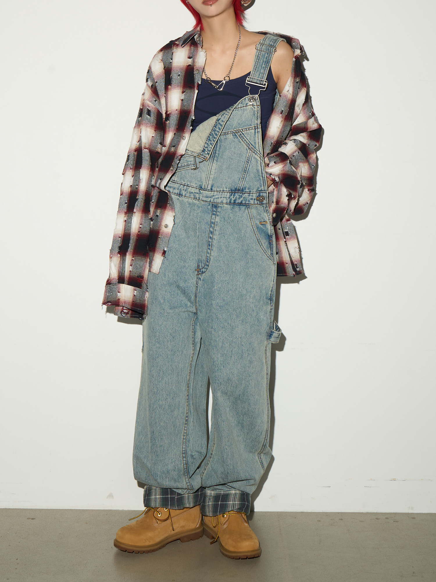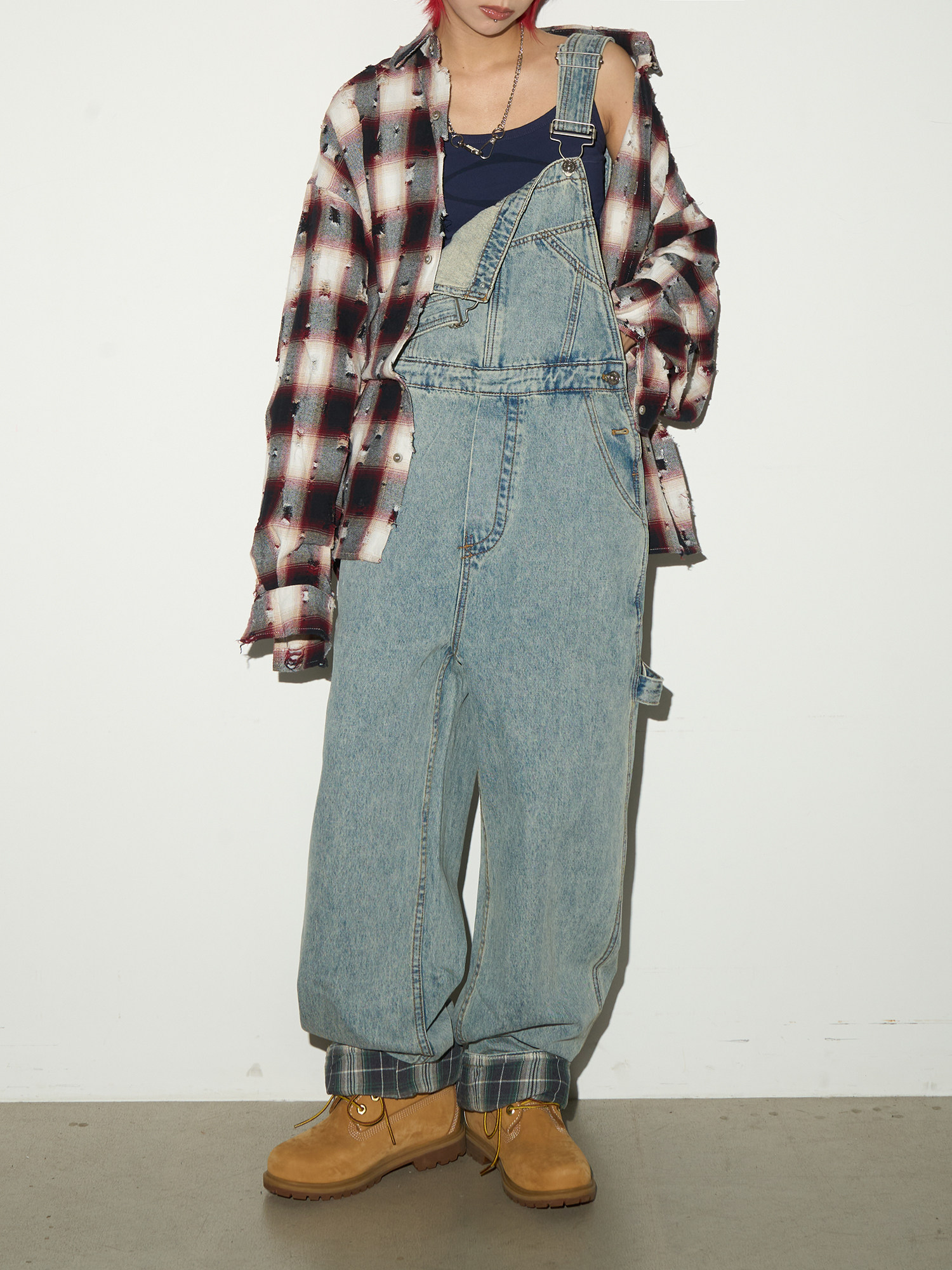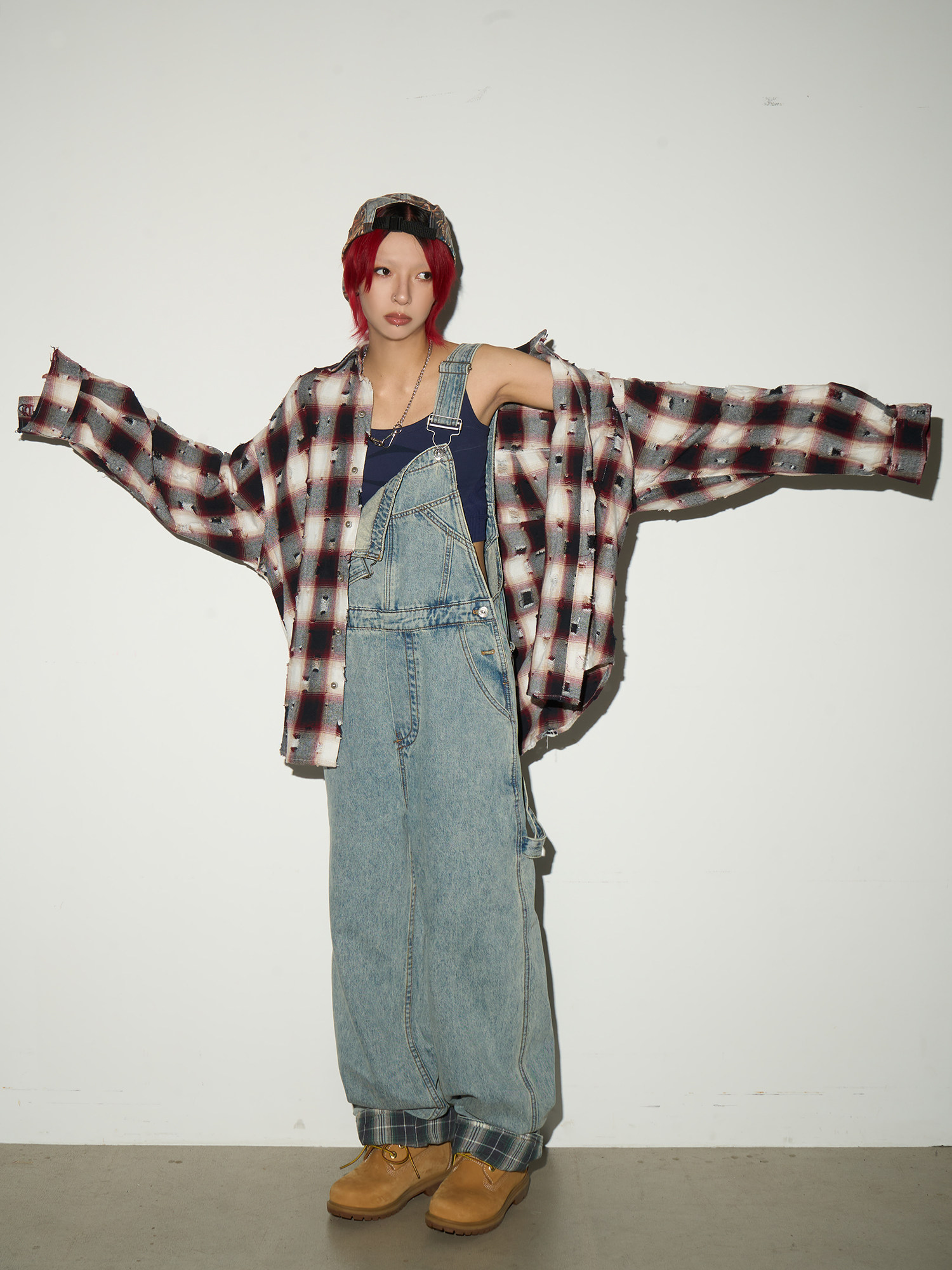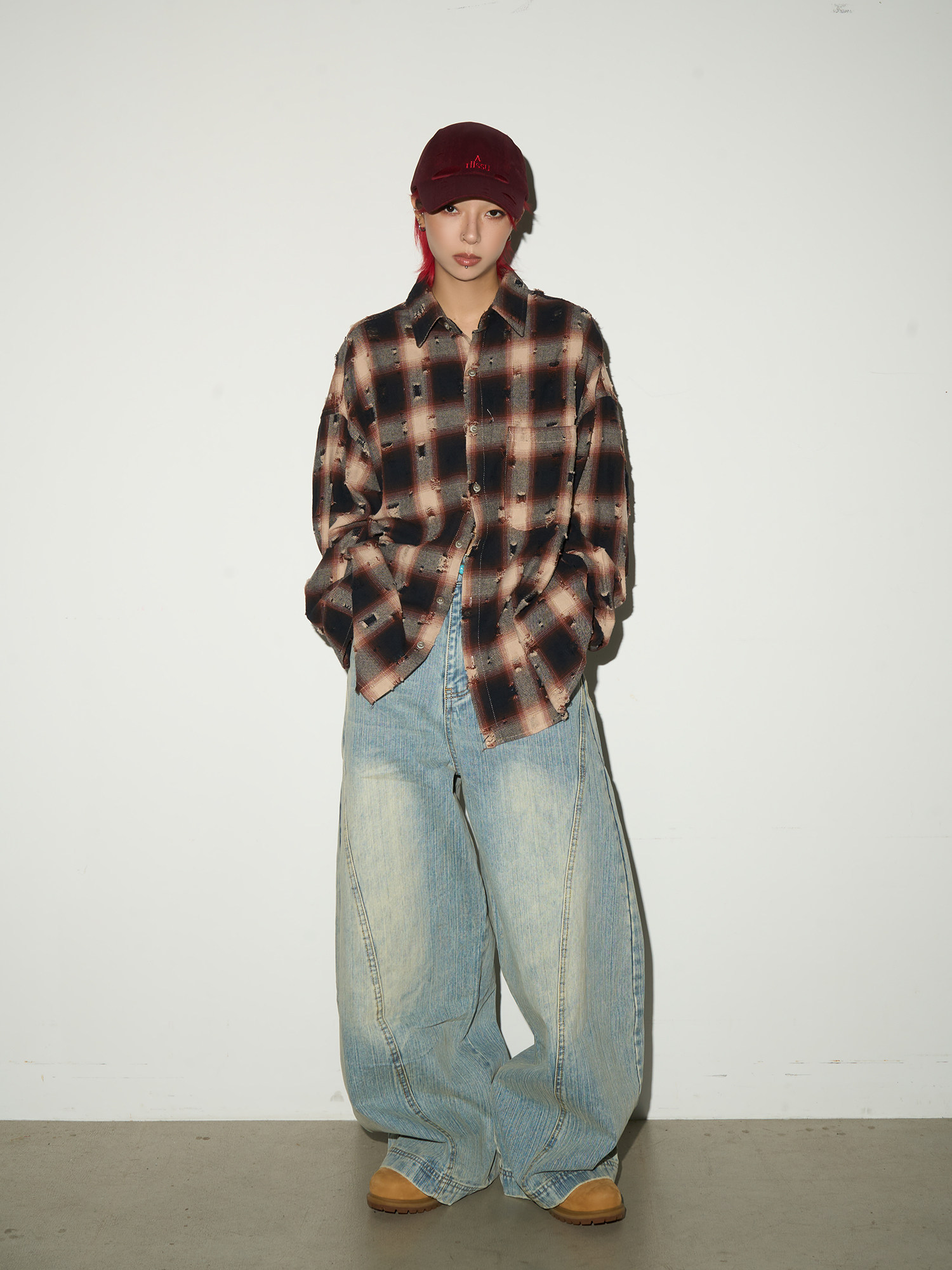 Ripped Plaid Oversize Long Sleeve Shirt NA9149