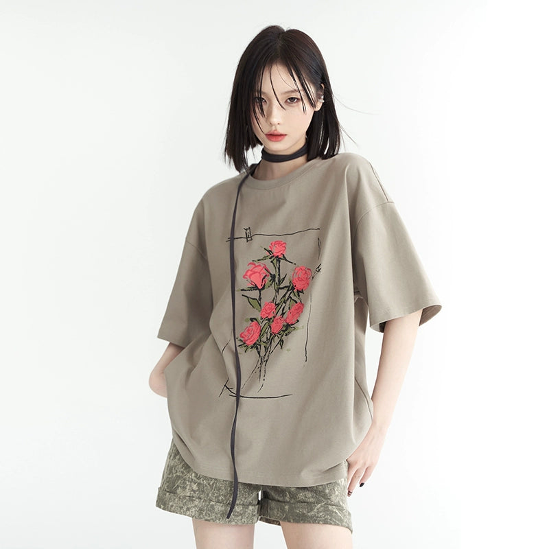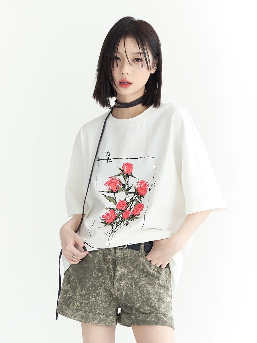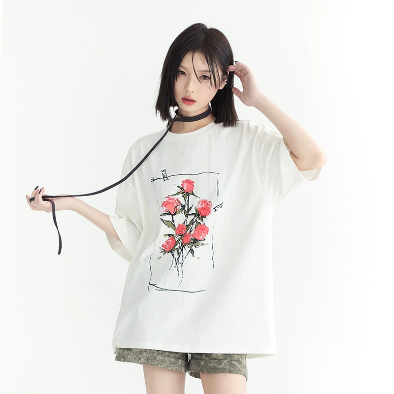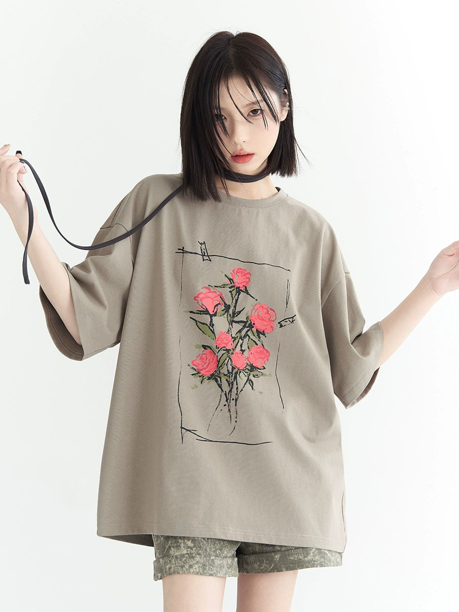 Rose Print Oversize Short Sleeve T-Shirt NA2741