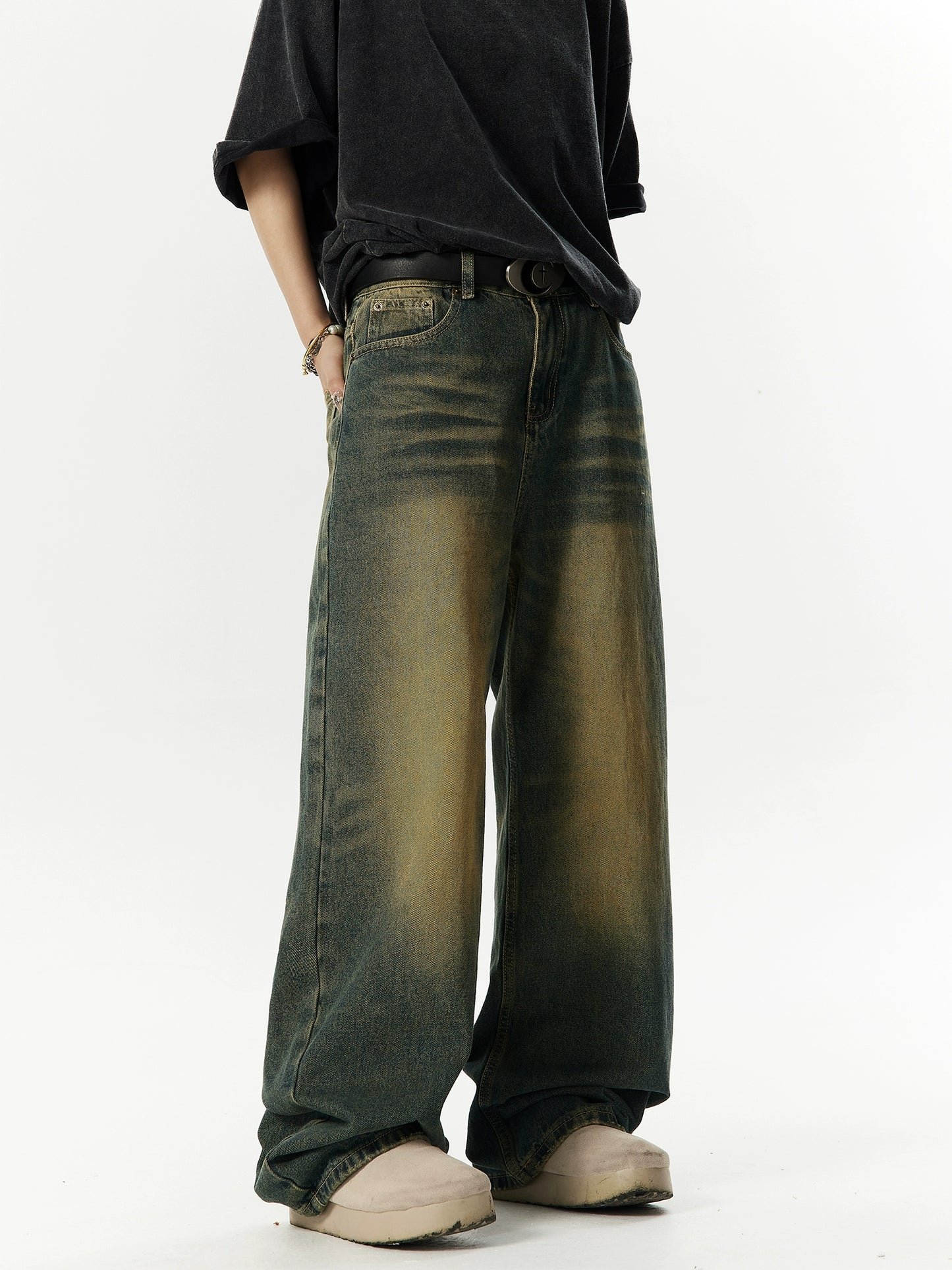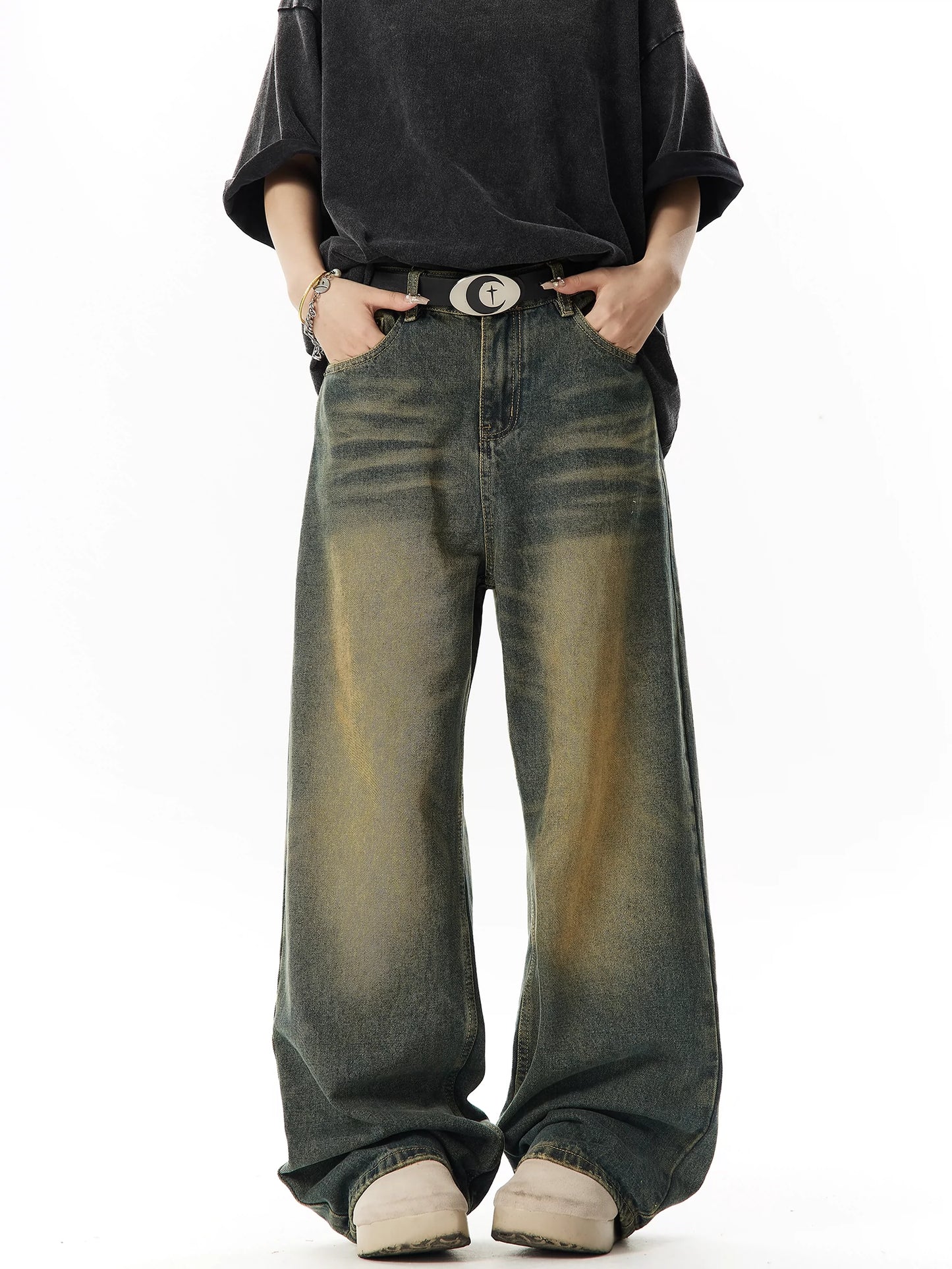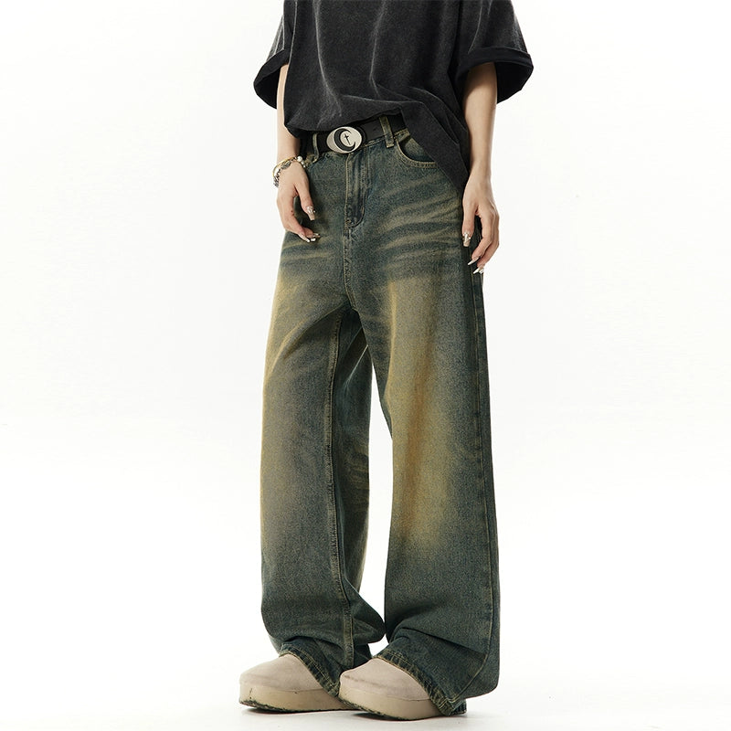 Washed Yellow Mud Dyed Wide Leg Denim Jeans NA3009