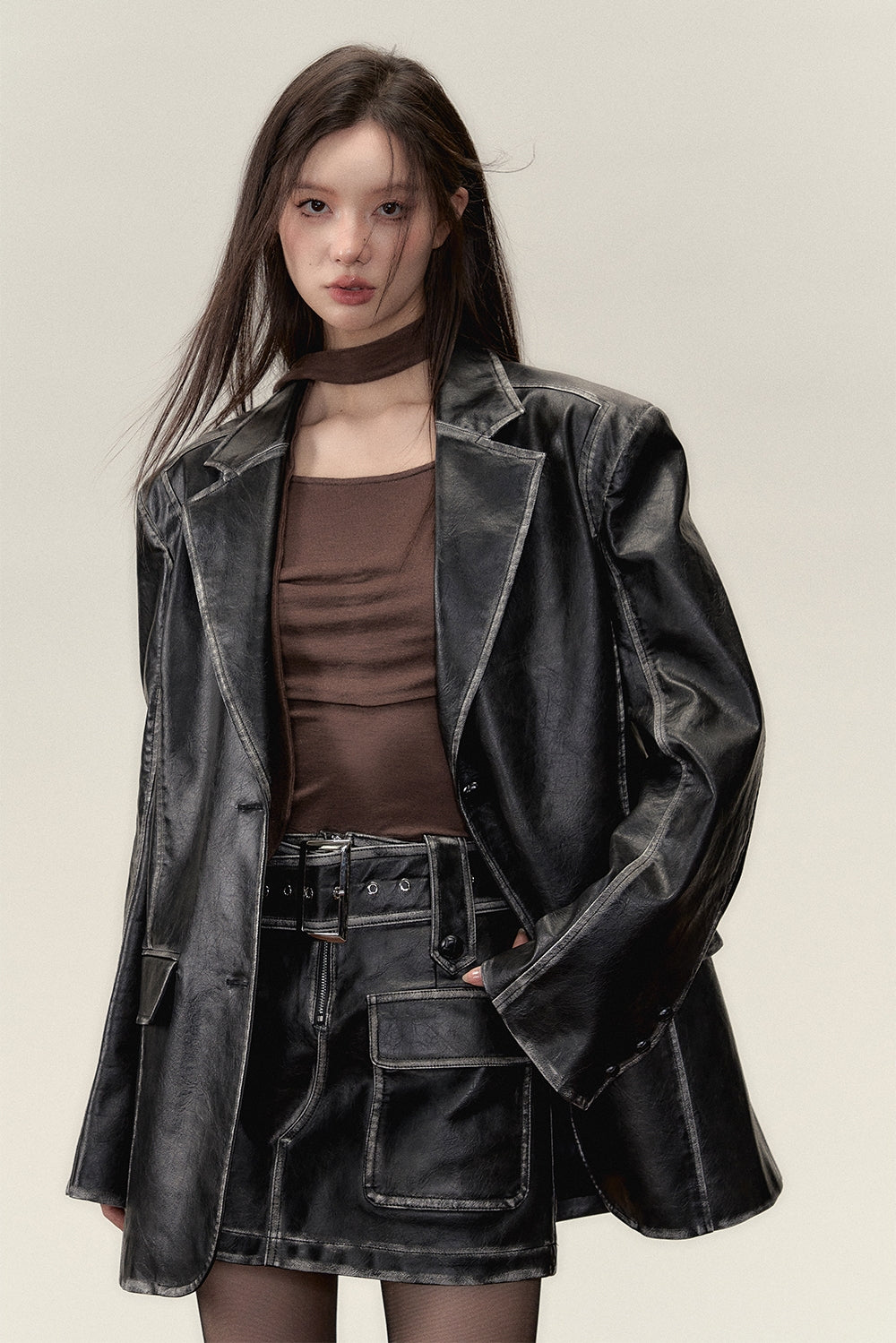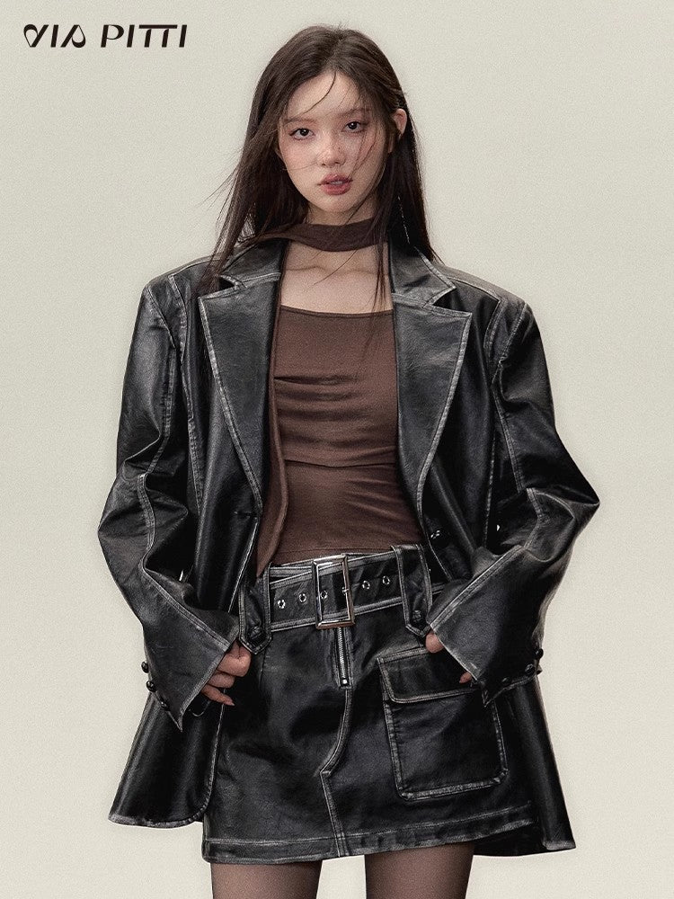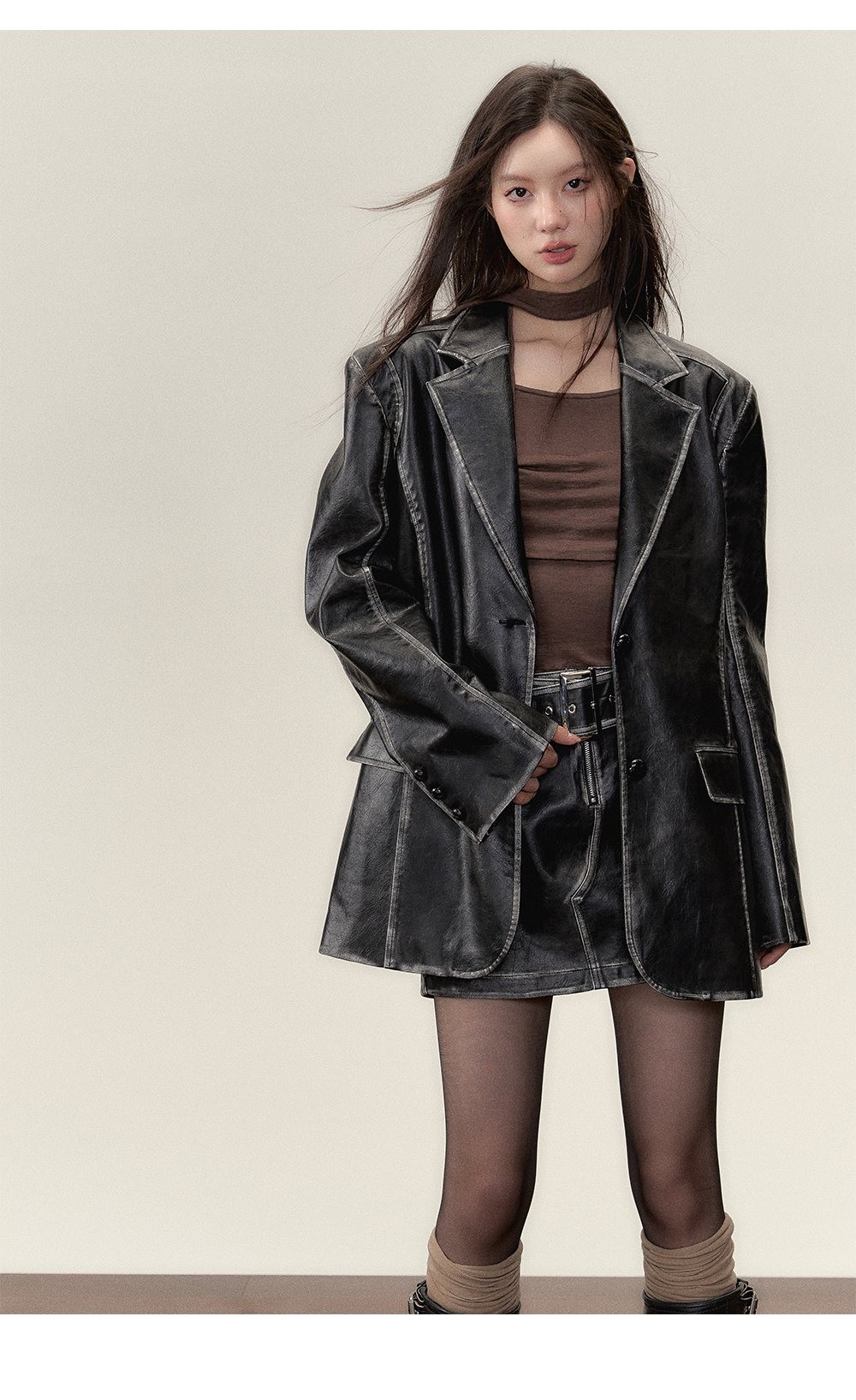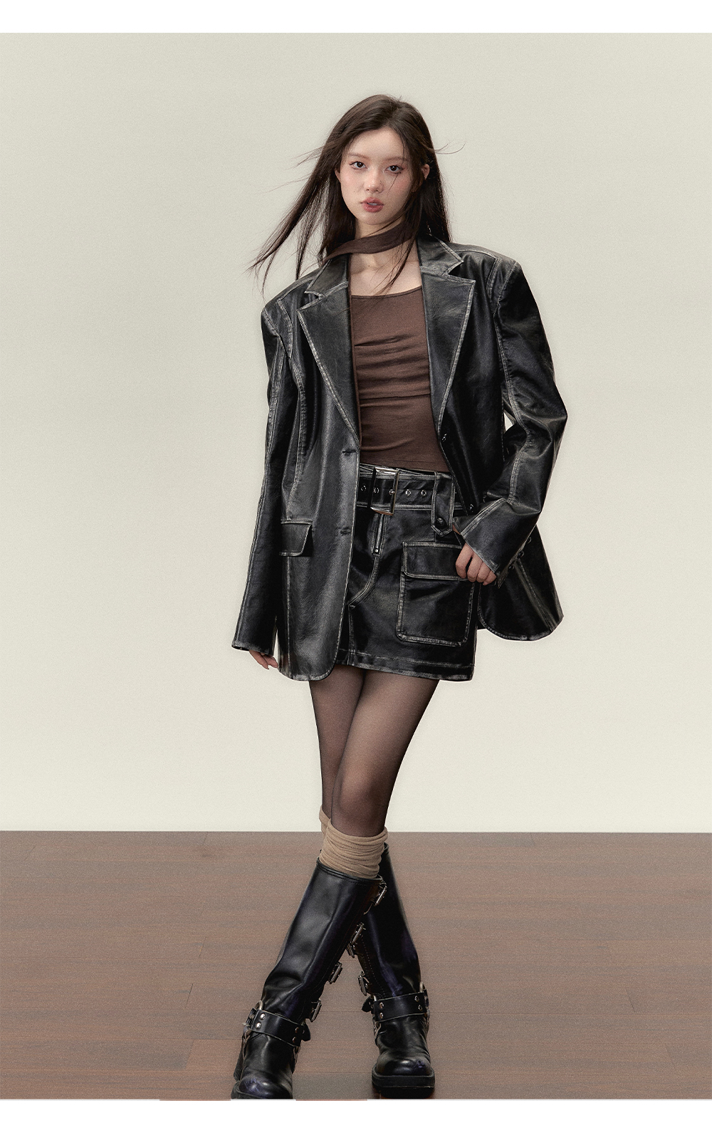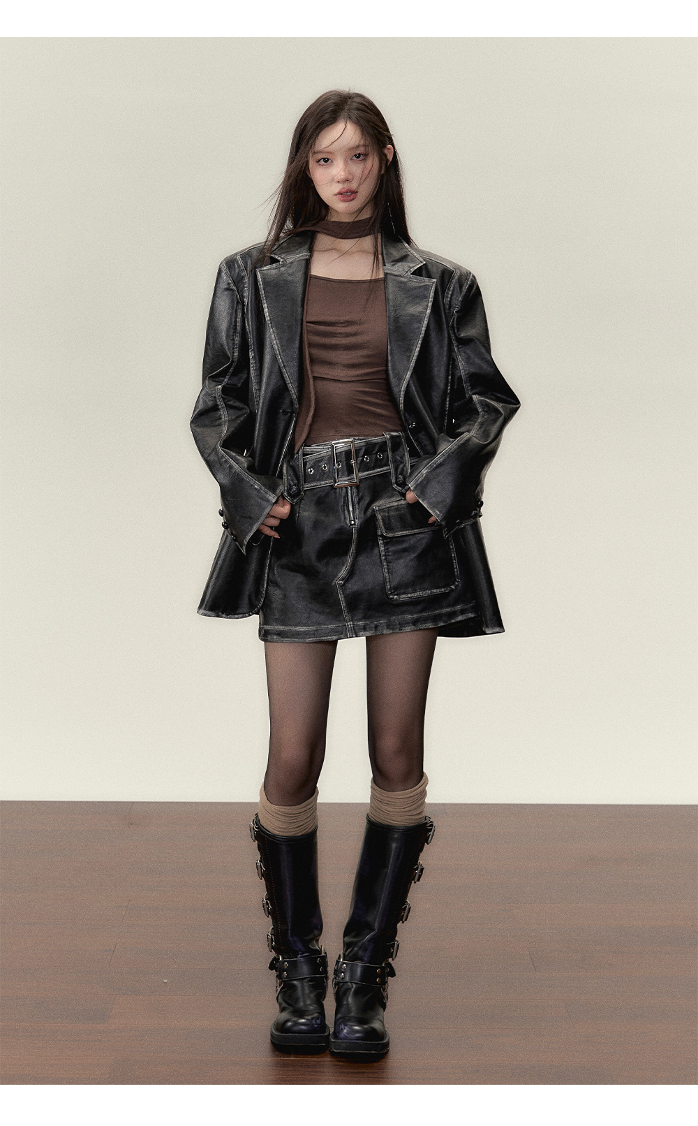PU Leather Jacket & PU Leather Belted Skirt Setup NA4671