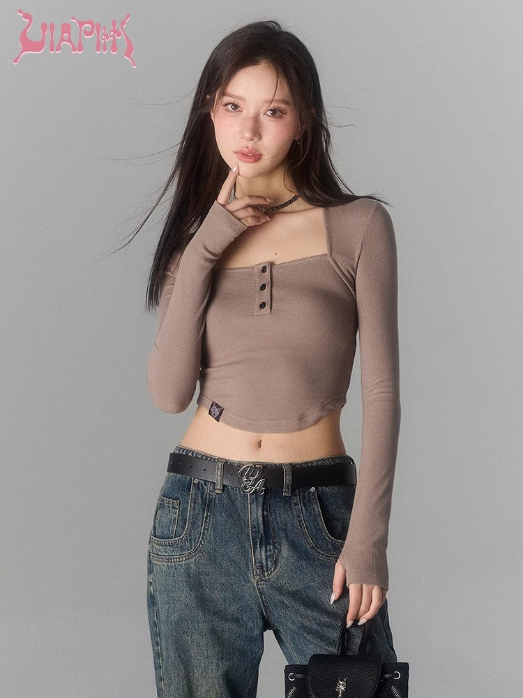 Button Decoration Square Neckline Long Sleeve T-shirt NA4800