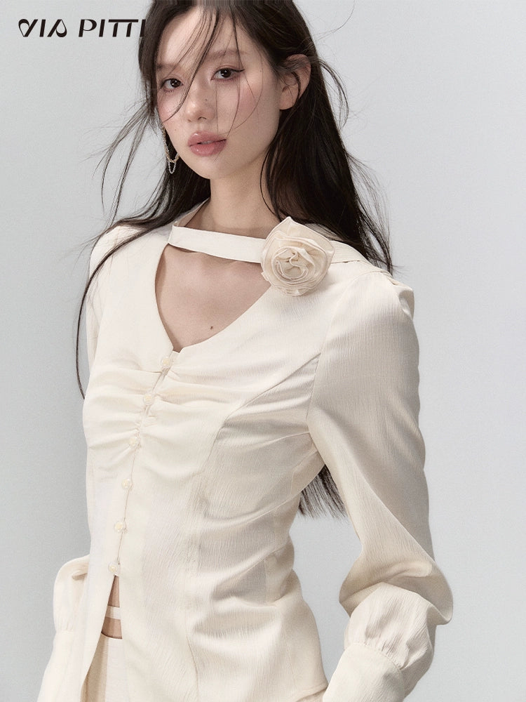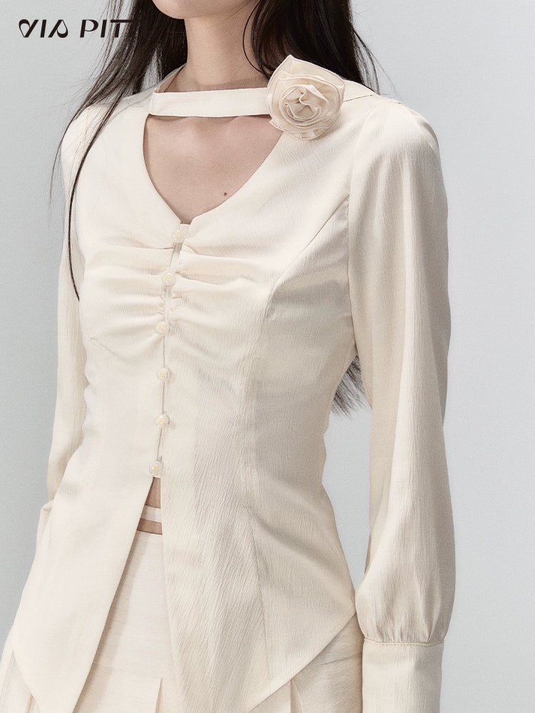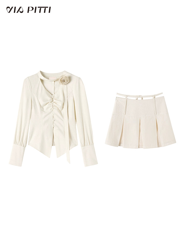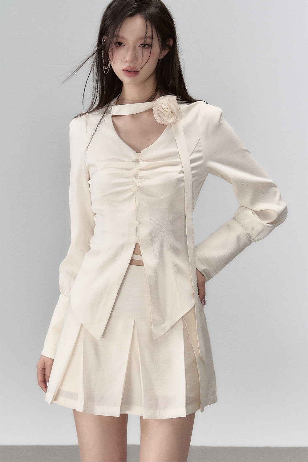 Drape V-neck Button Up Long Sleeve Shirt & Pleats Skirt Setup NA4815