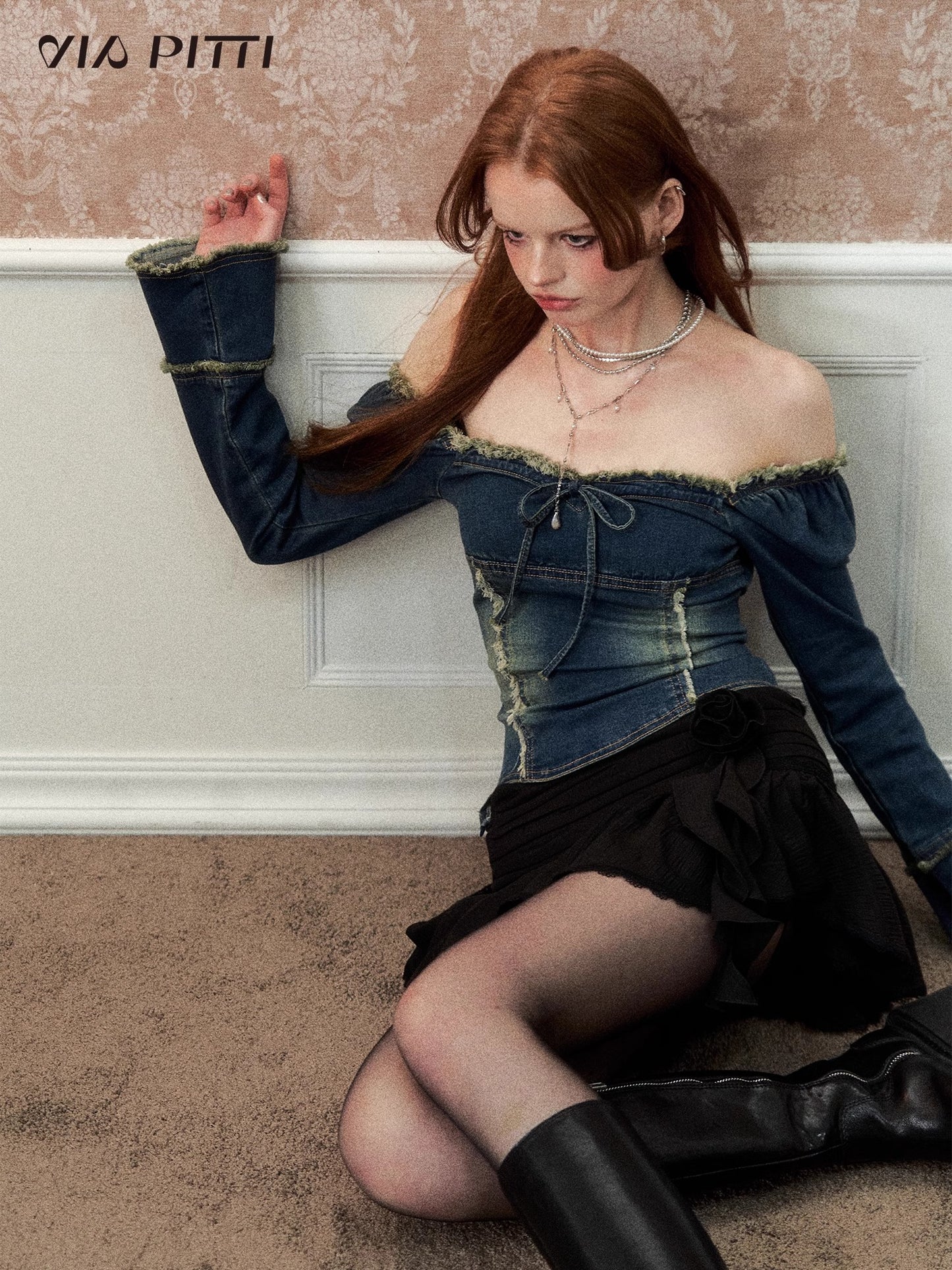One Shoulder Denim Long Sleeve T-shirt NA4869