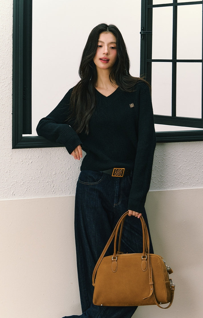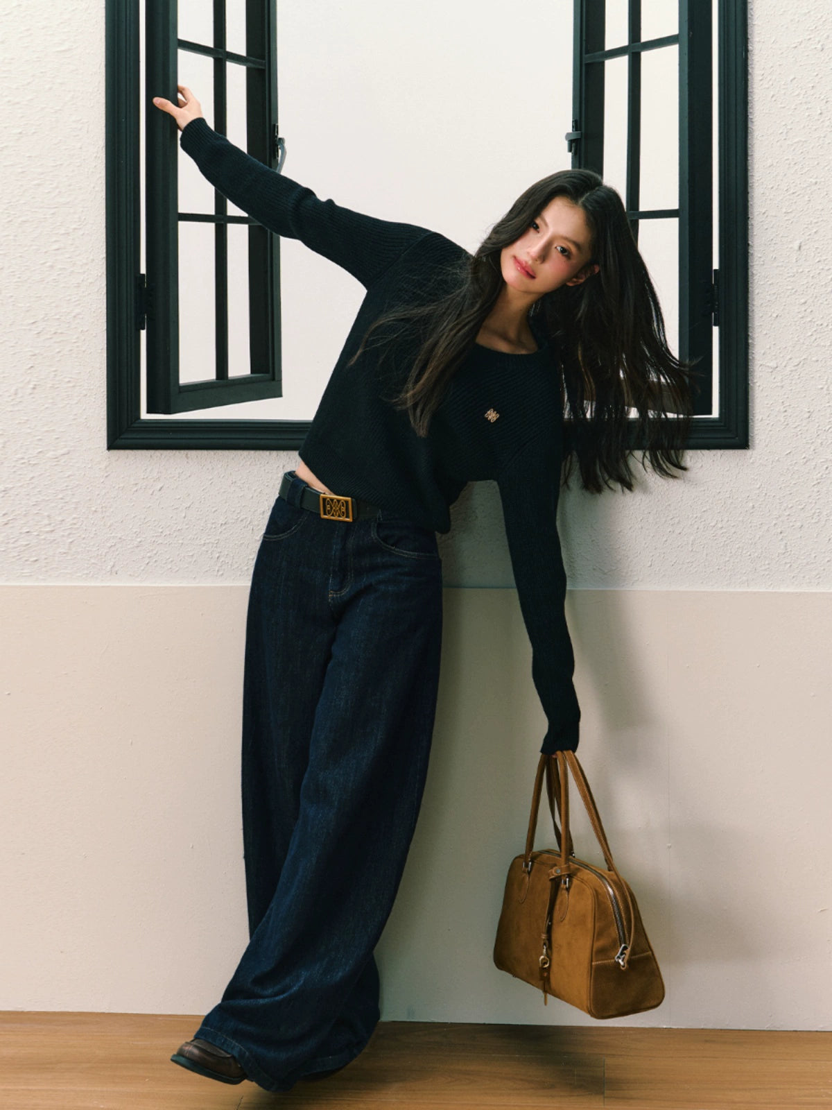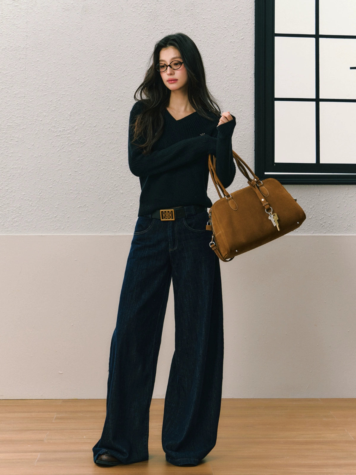 V-neck Knit Sweater & Wide Leg Denim Jeans NA5801