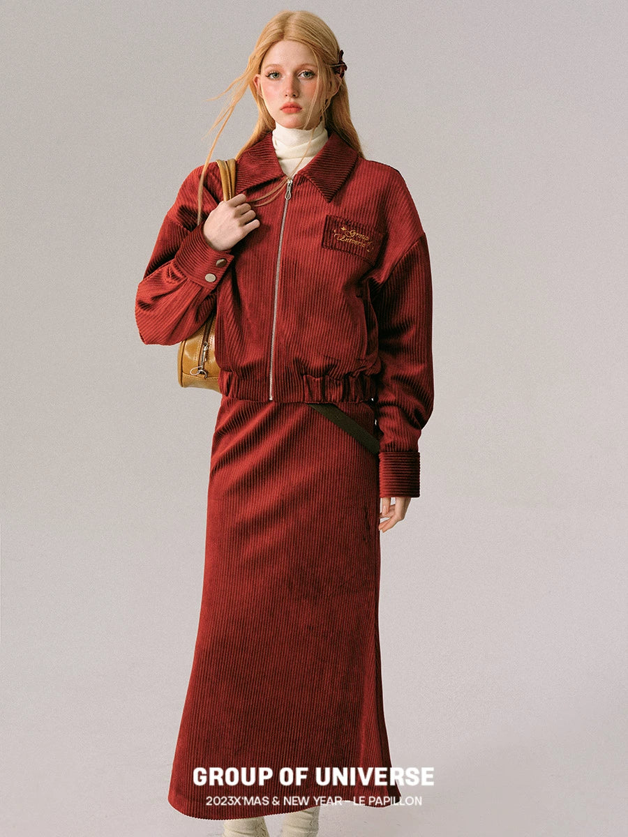 Velvet Zipper Jacket & Pleated Short Skirt & Mermaid Skirt Setup NA5913