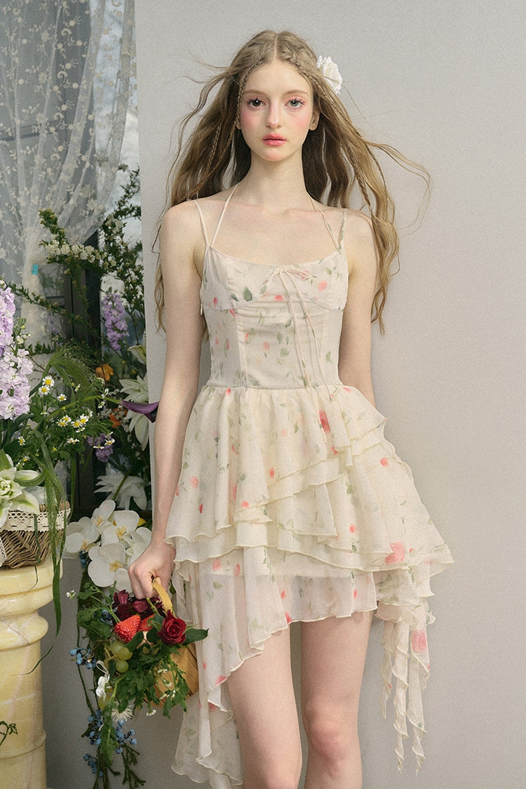 Irregular Hem Length Rose Print Hanging Neck Strap Dress NA5929