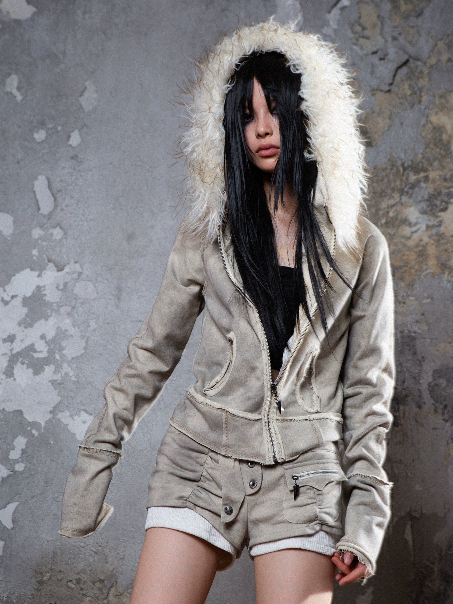 Fake Fur Collar Distressed Short Jacket NA6191