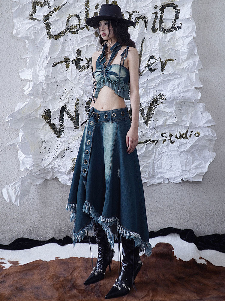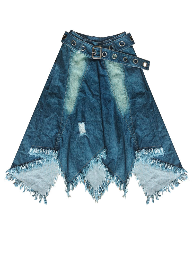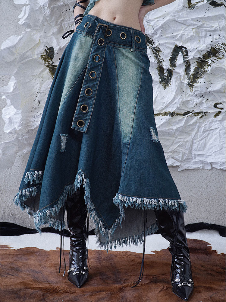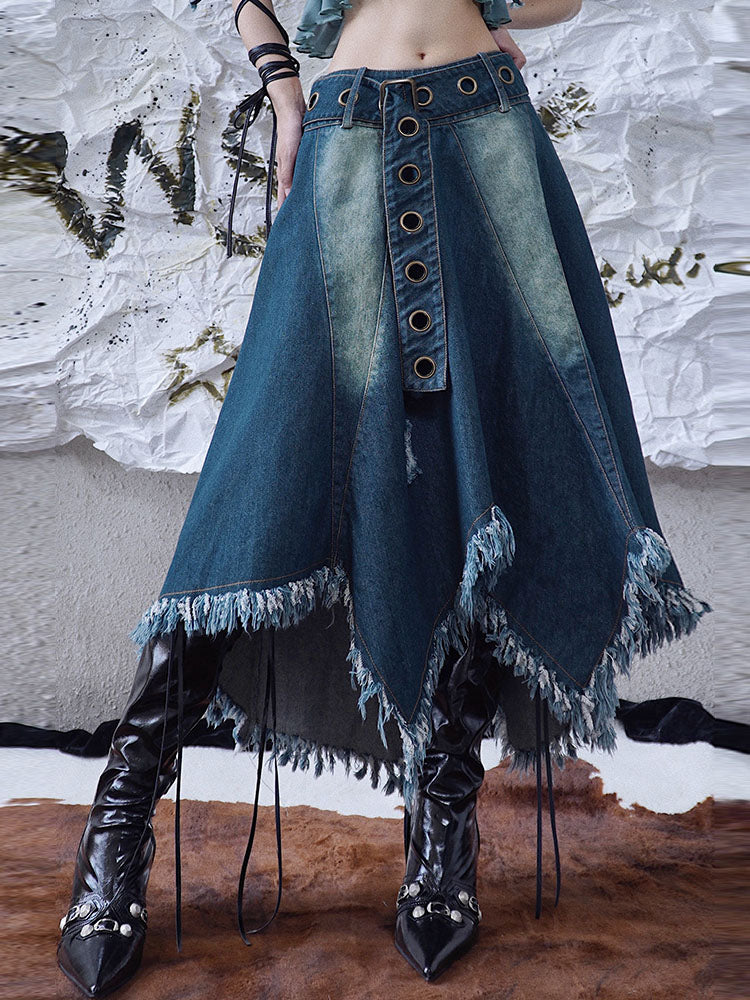 Fringe Raw Edge Heavy Denim Skirt NA7731