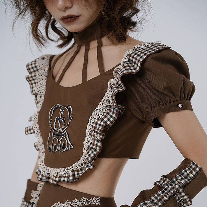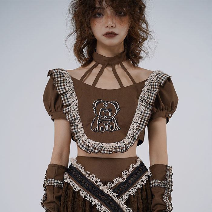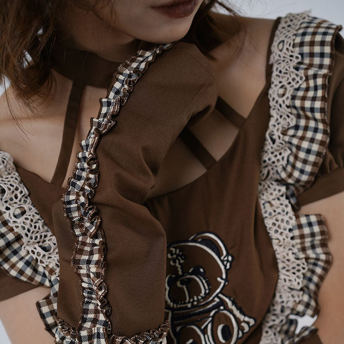 Bear Embroidery Ruffle Lace Short Sleeve Blouse NA7740