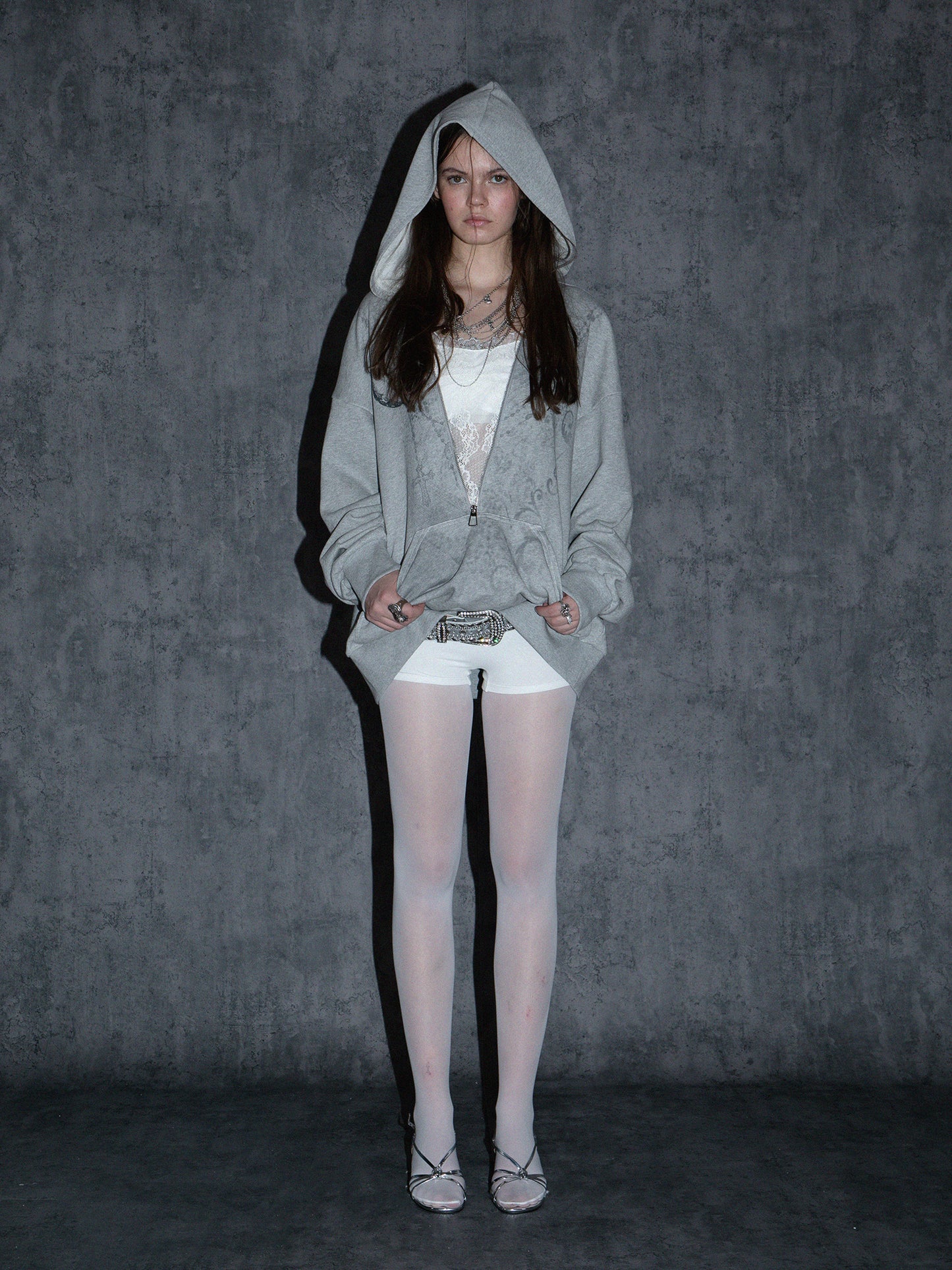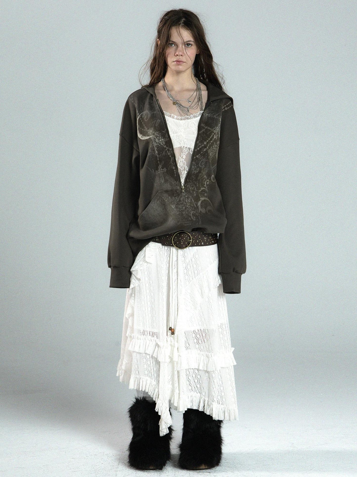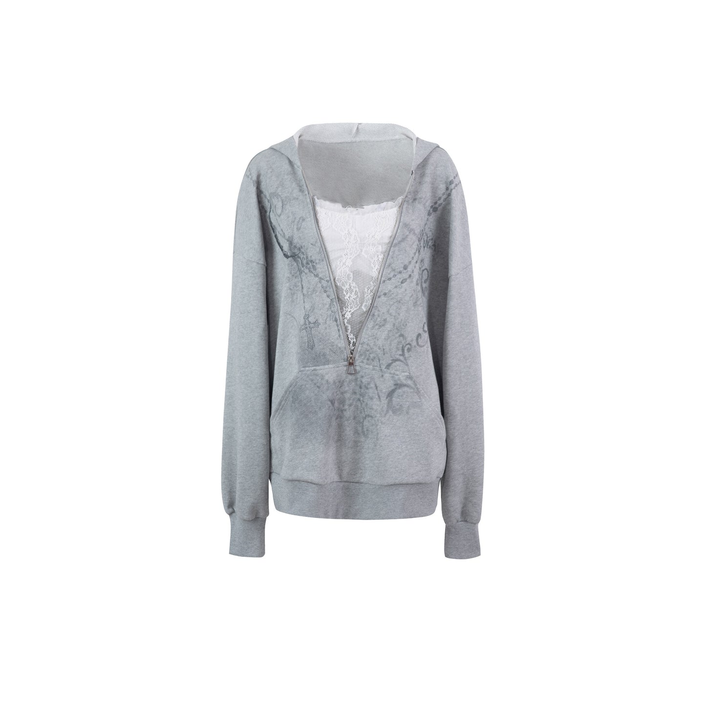 Fake Layered Lace Zipper Batwing Sleeve Pullover Hoodie NA7825