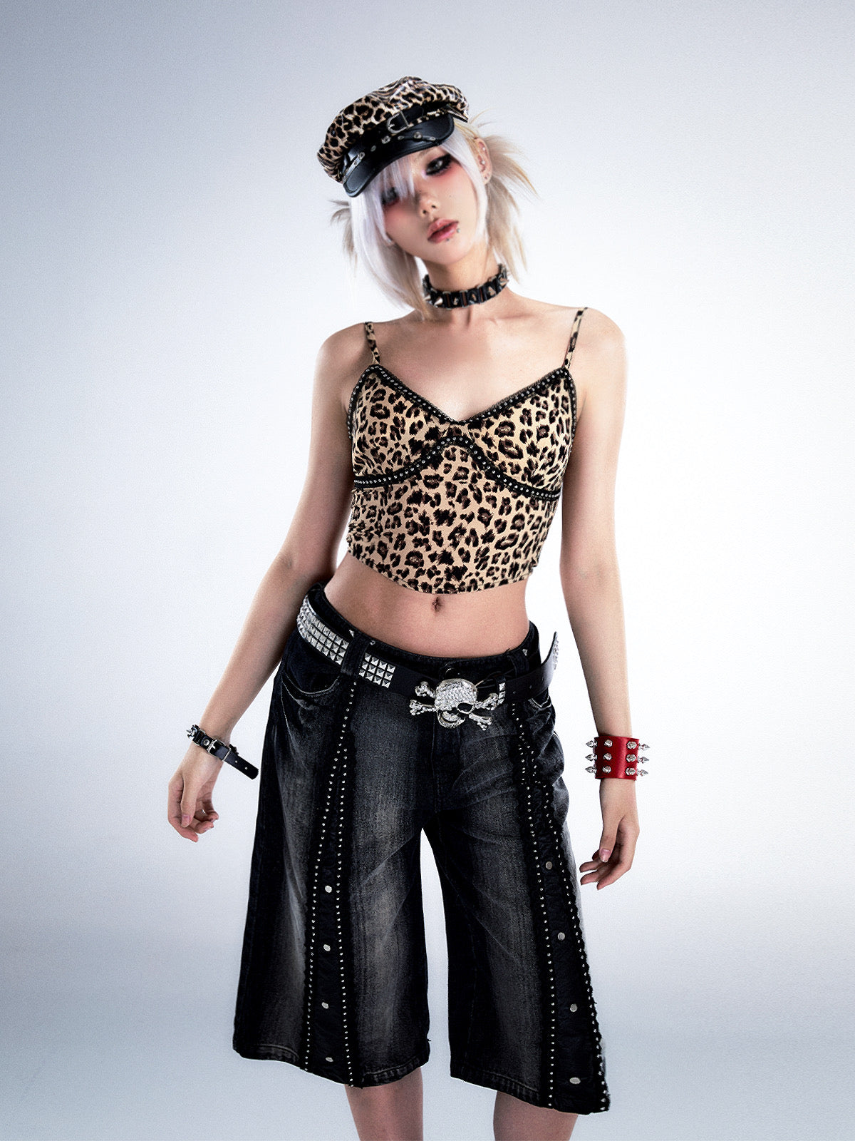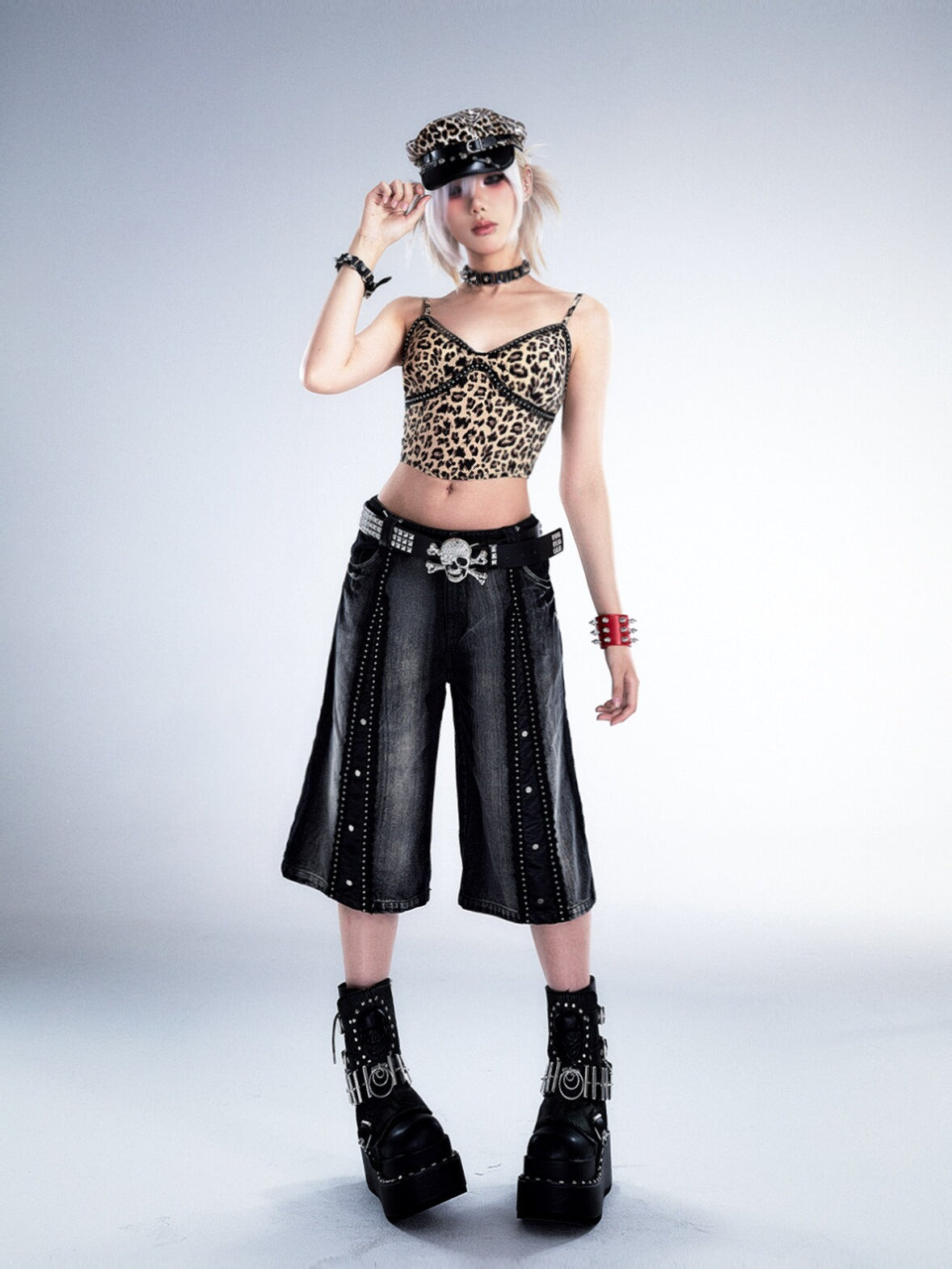 Studs Patchwork Washed Wide-Leg Cropped Denim Jeans NA8124