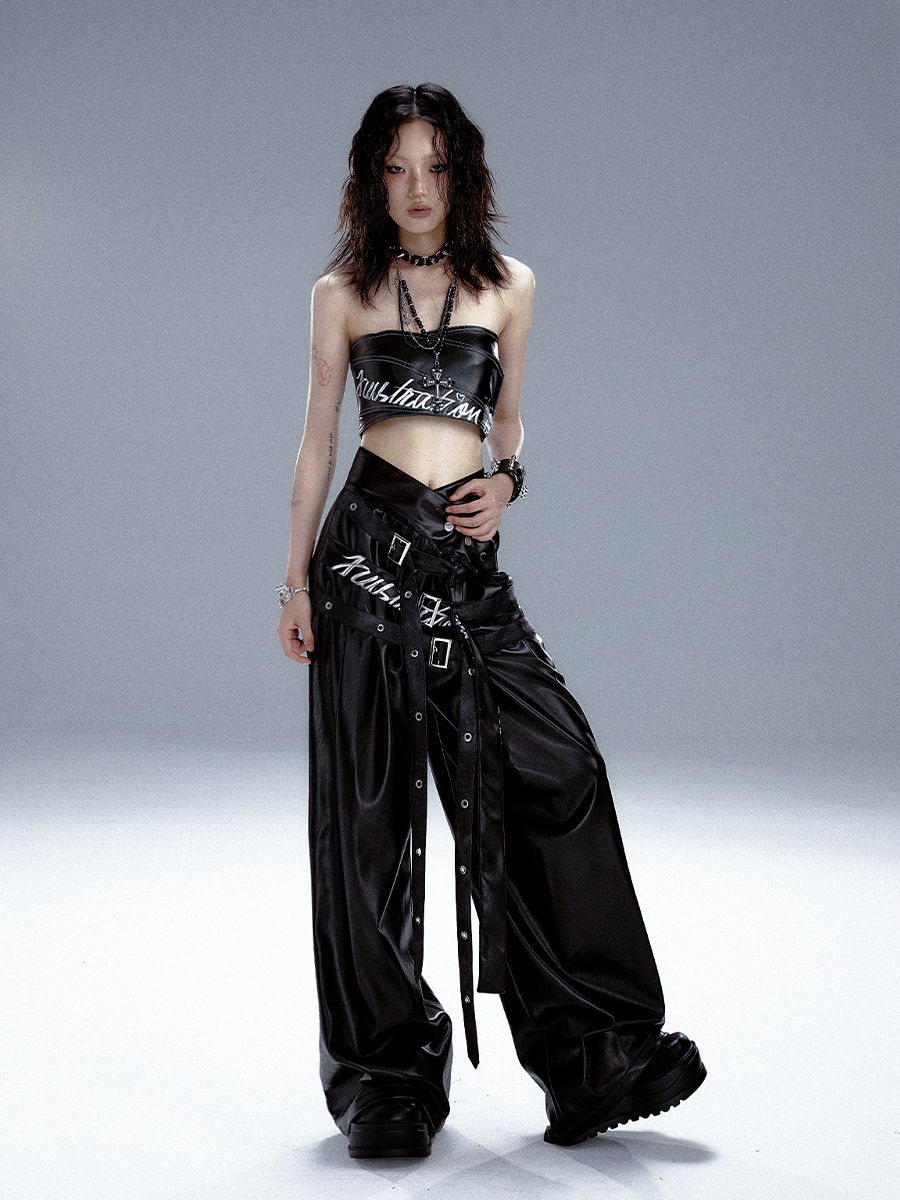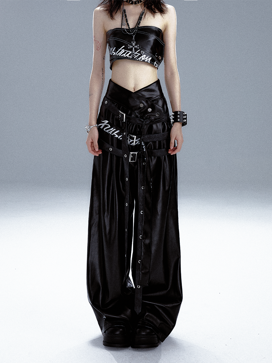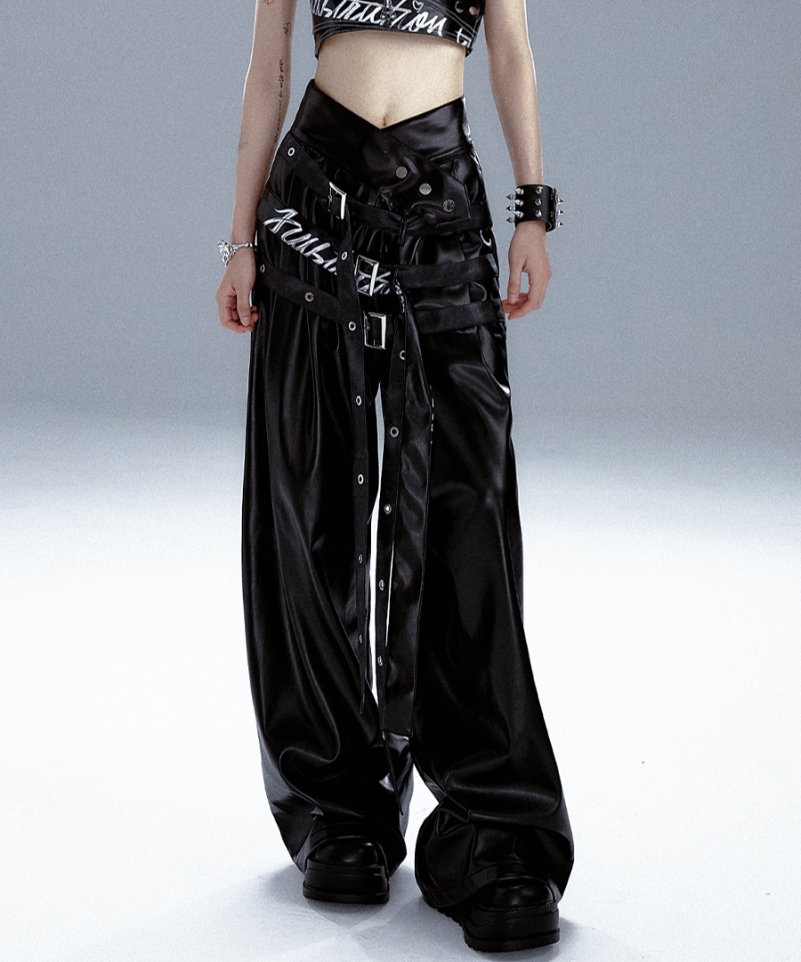 High-Waist V-Cut Graffiti Print Belted Black PU Leather Pants NA8133