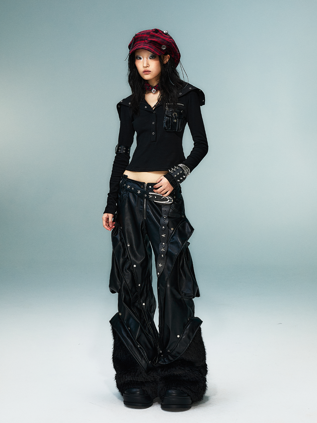 Studded Multi-Pocket Patchwork Fuzzy Wide-Leg PU Leather Pants NA8164