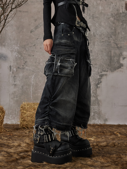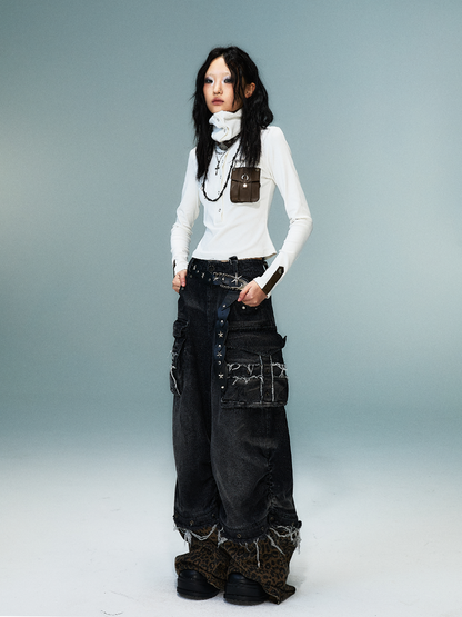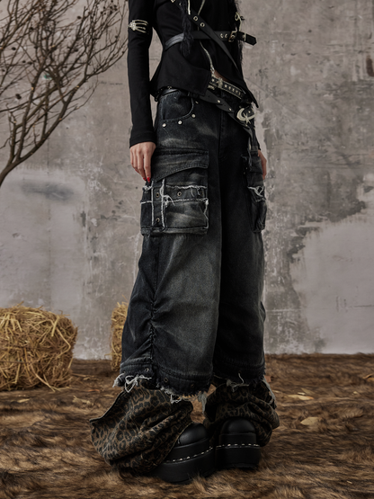 Washed Detachable Leopard Patchwork Wide-Leg Denim Jeans NA8170