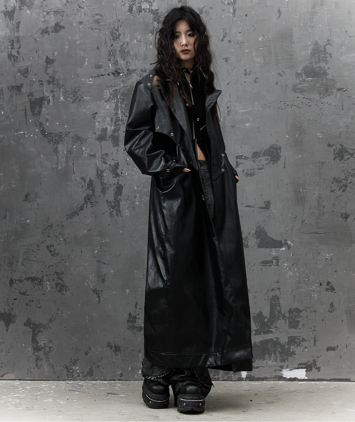 Cutout Patchwork Long PU Leather Trench Coat NA8173