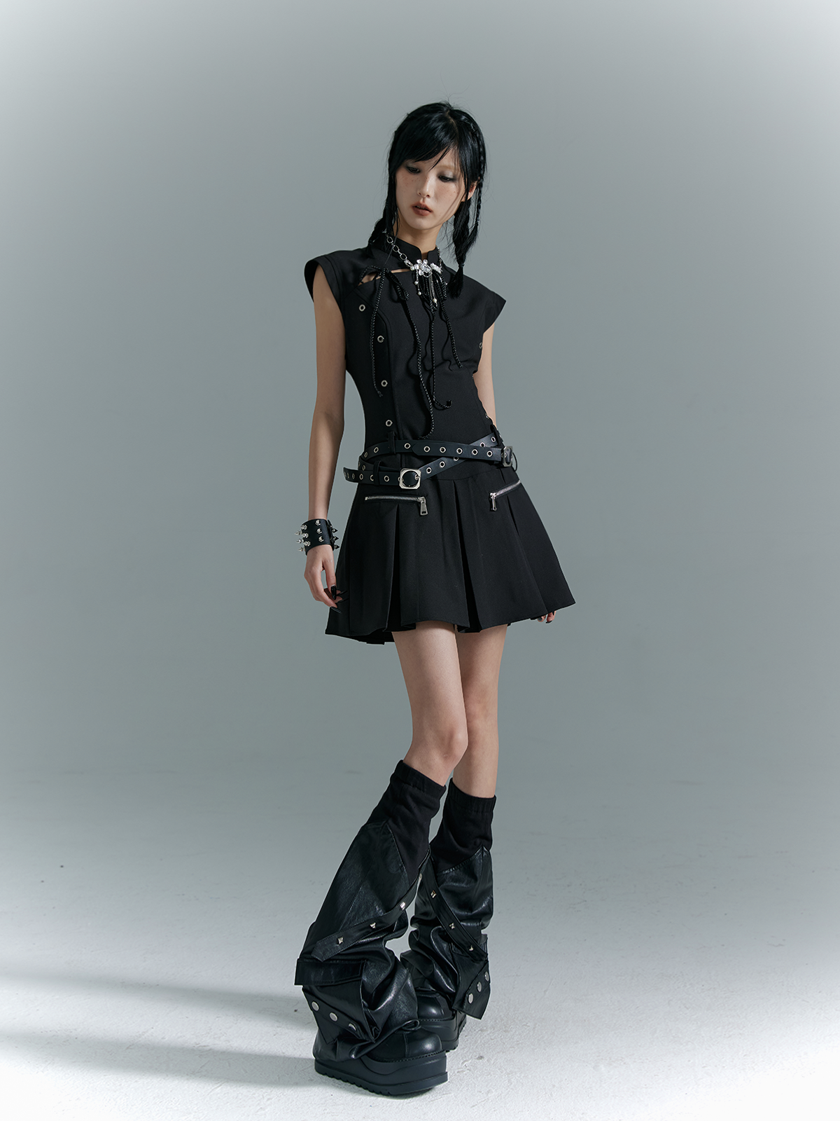 Cutout Pleats Qipao Sleeveless Dress with Belt NA8177
