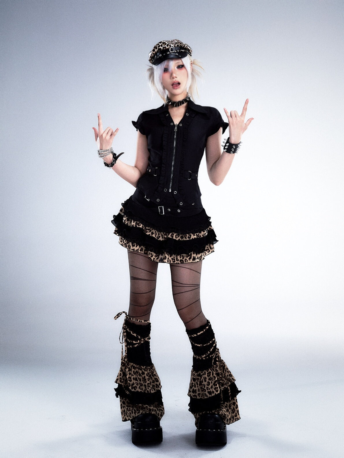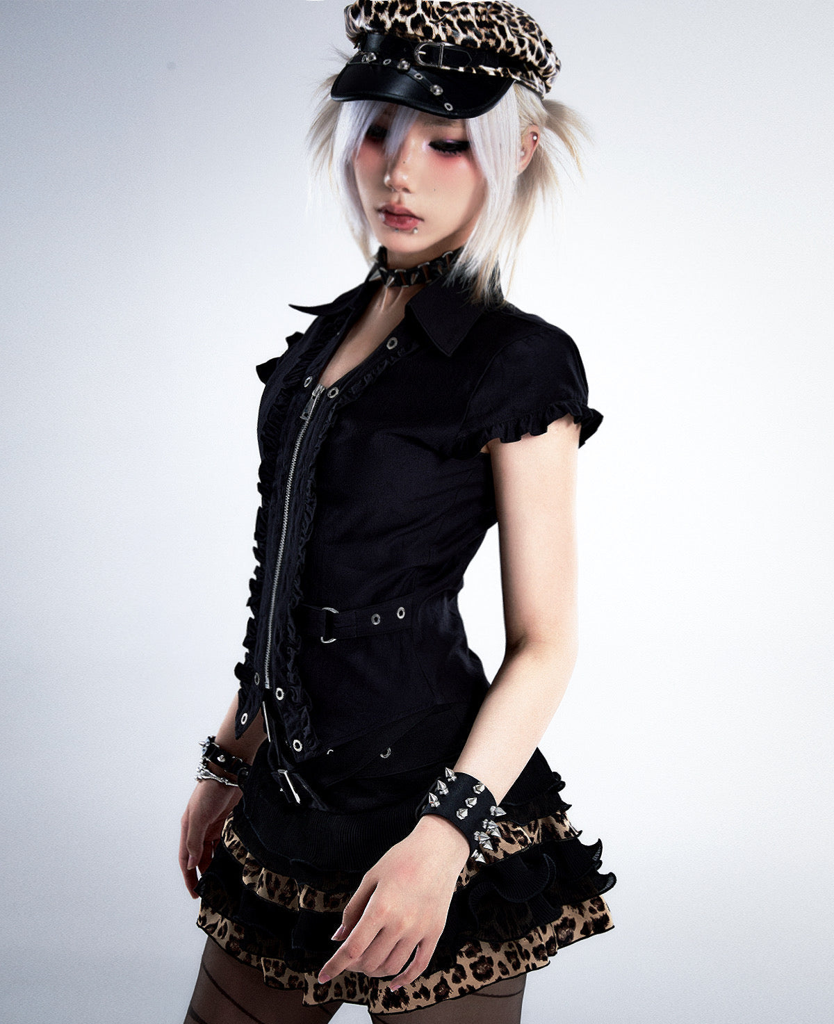 Ruffle Trim Waist-Cinching Short Zipper Shirt NA8178