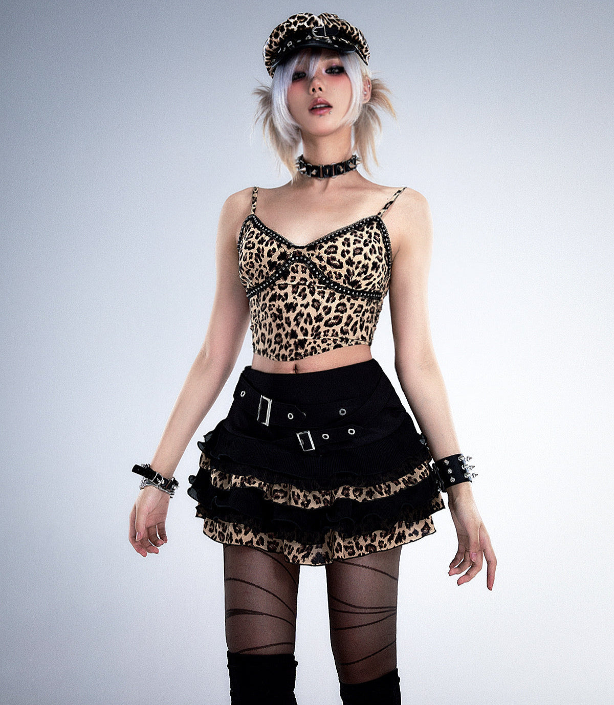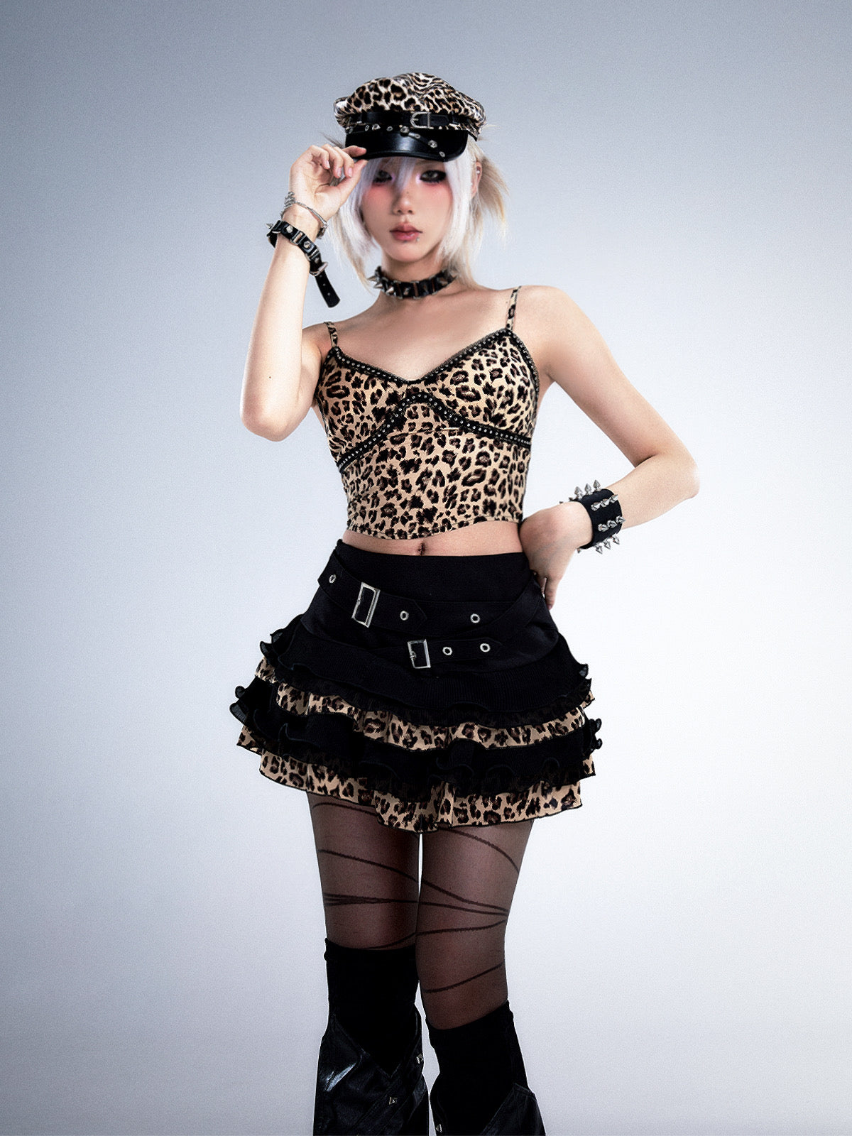 Leopard Patchwork Belted Tiered A-Line Skirt NA8182