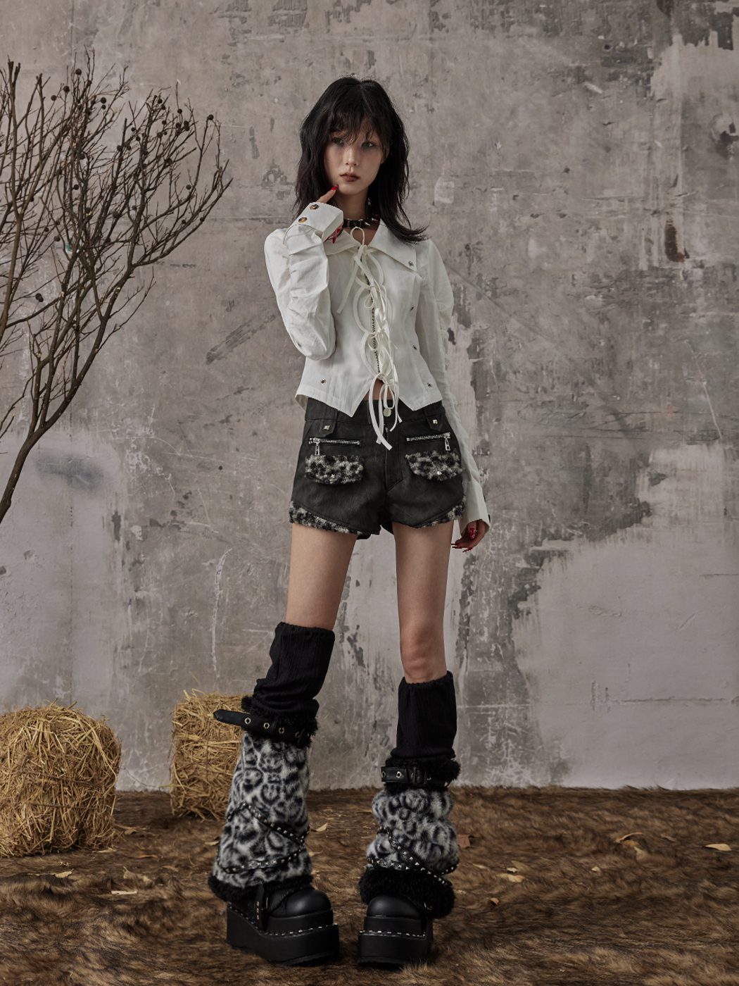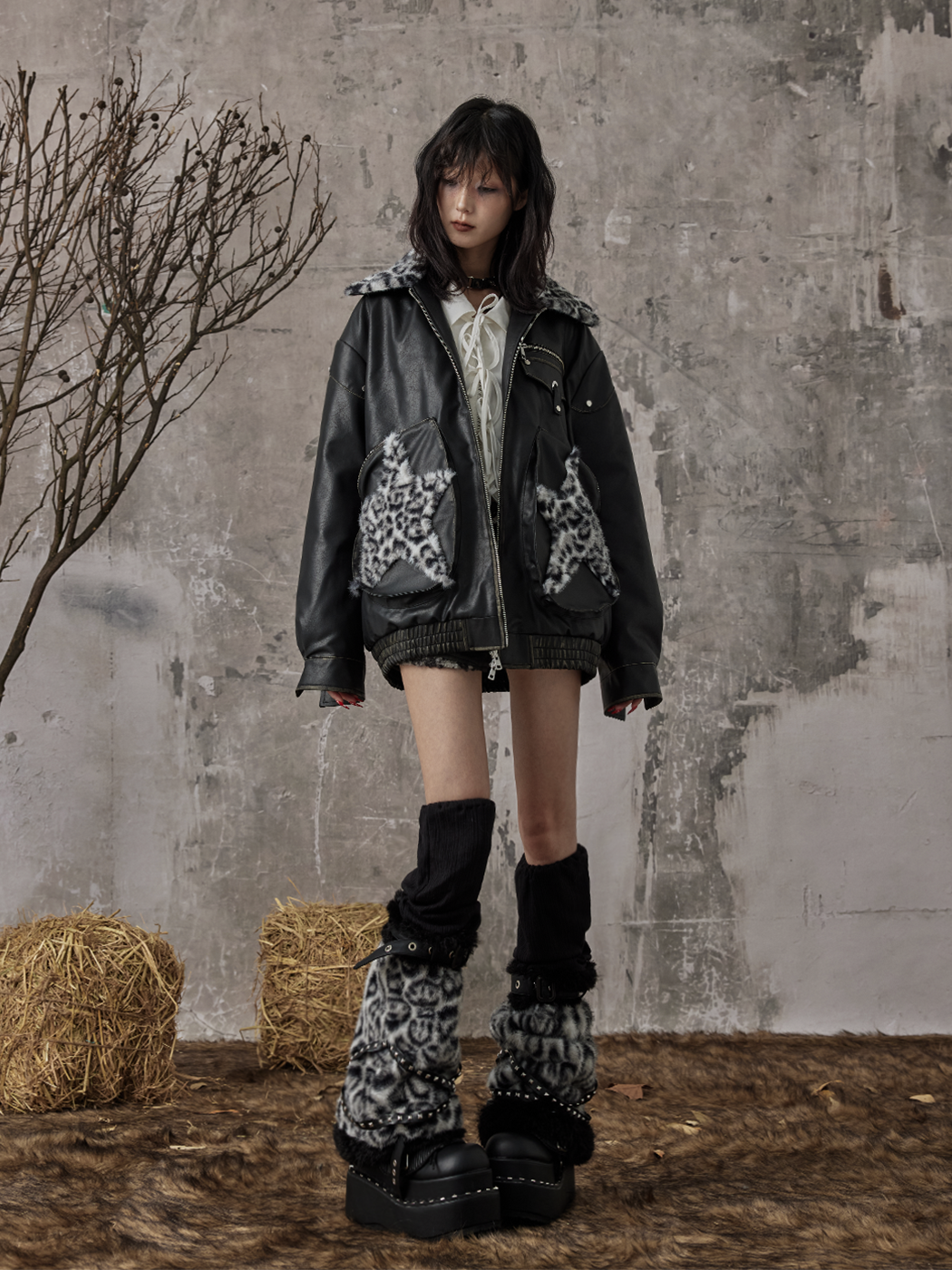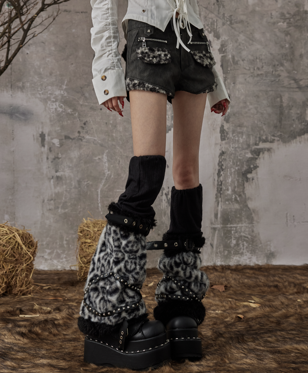 Leopard Patchwork Studs Fuzzy Leg Warmers NA8188