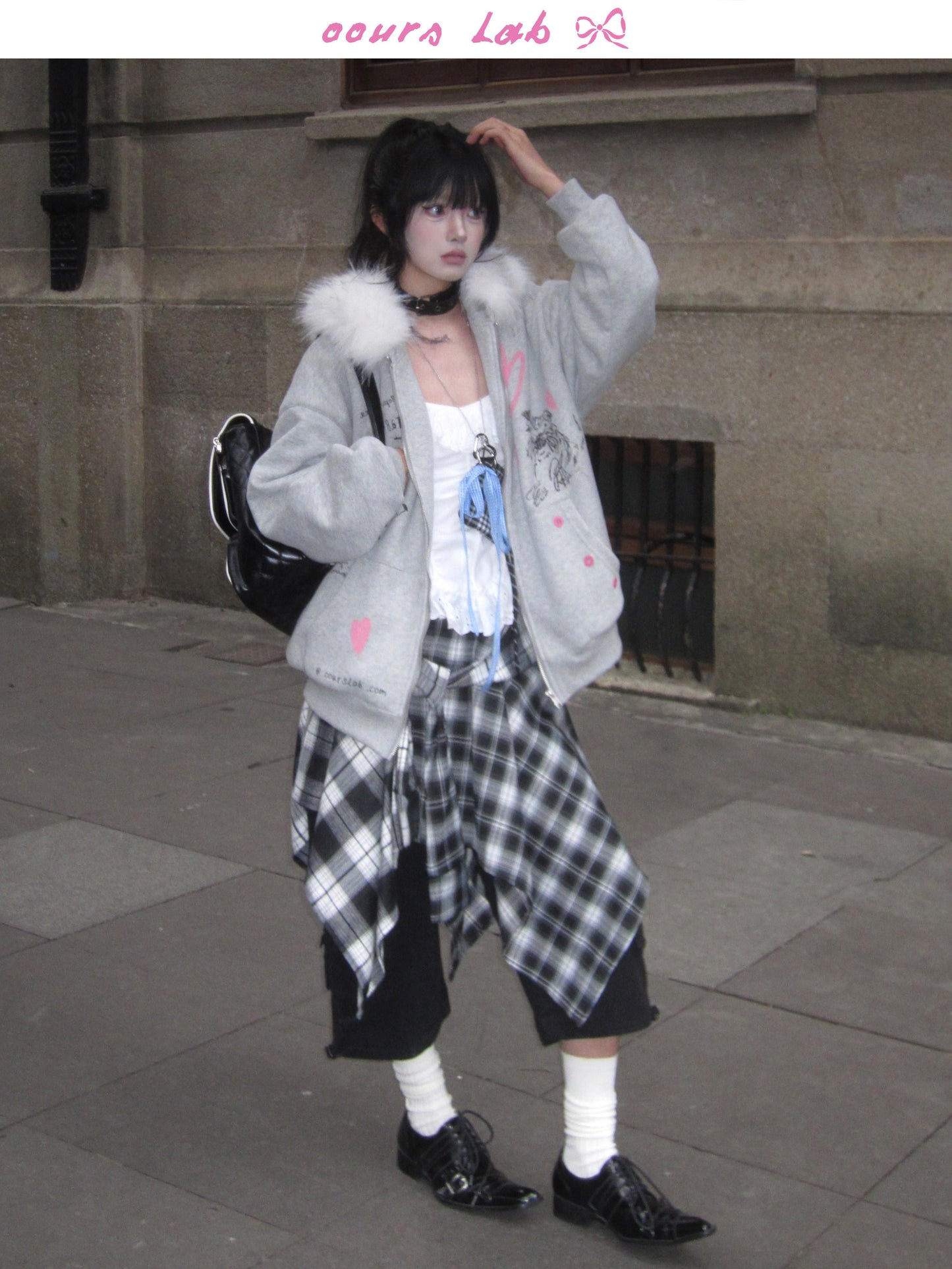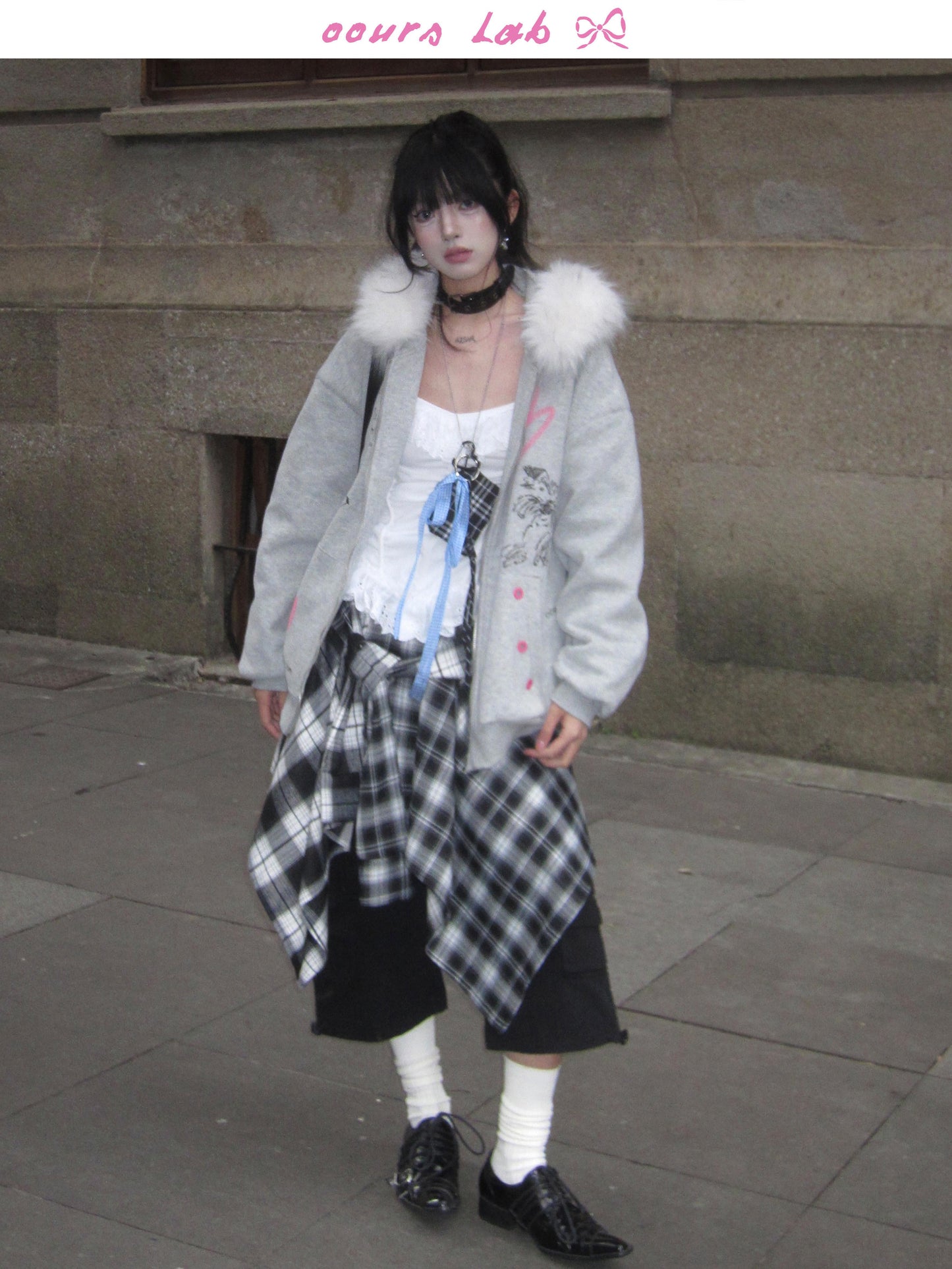 Detachable Fake Fur Collar Graffiti Print Sweatshirt Jacket NA8216