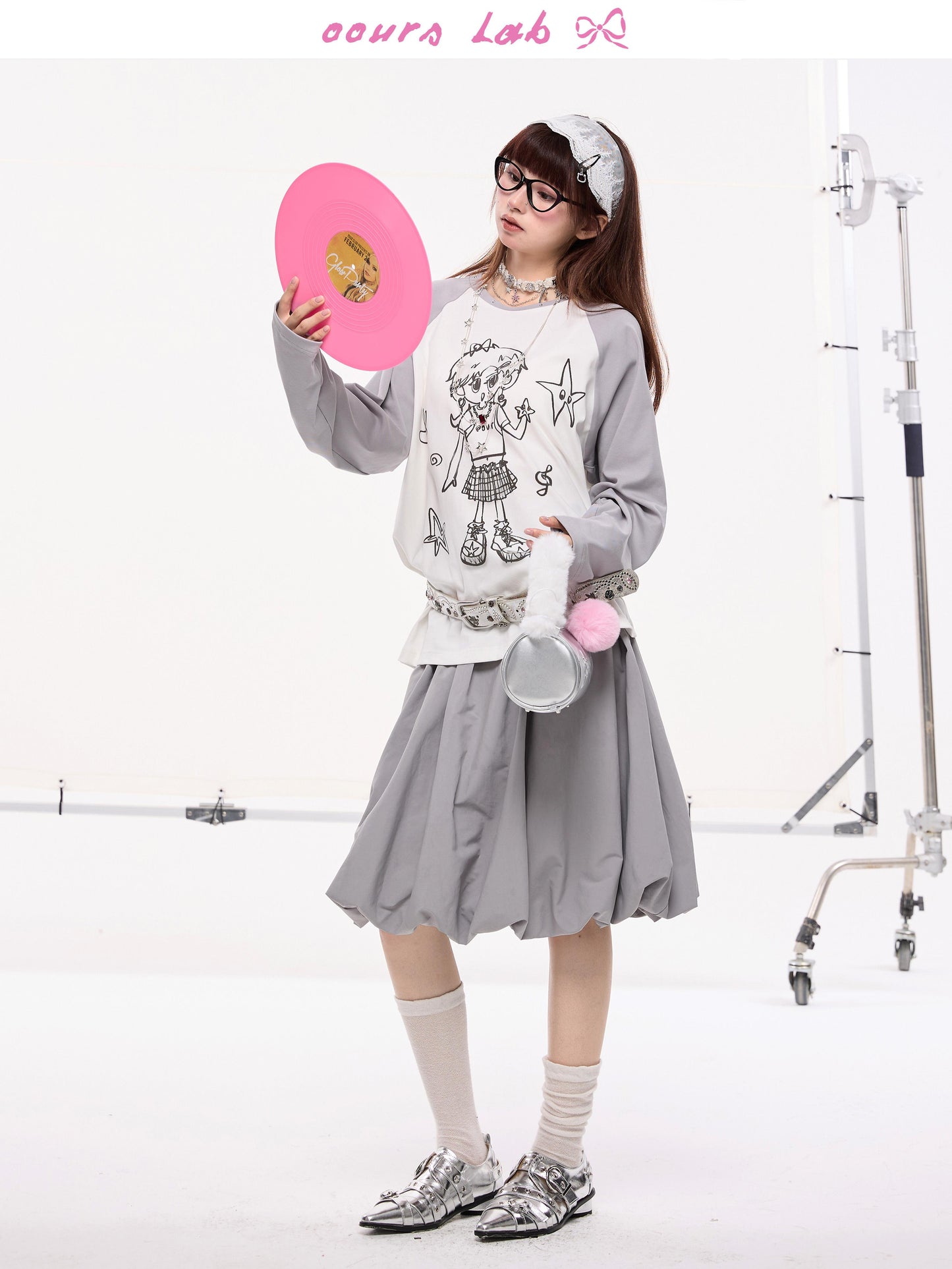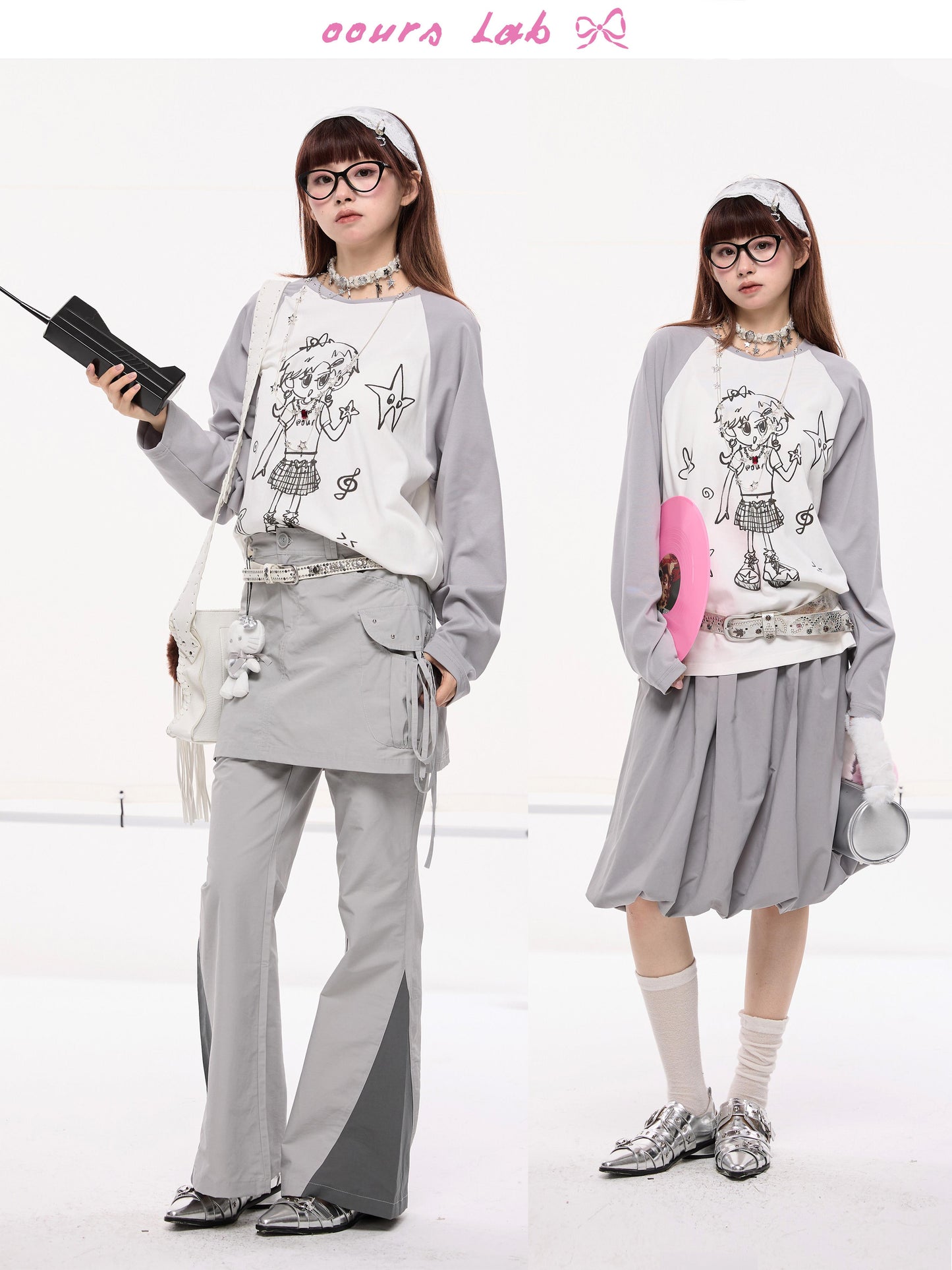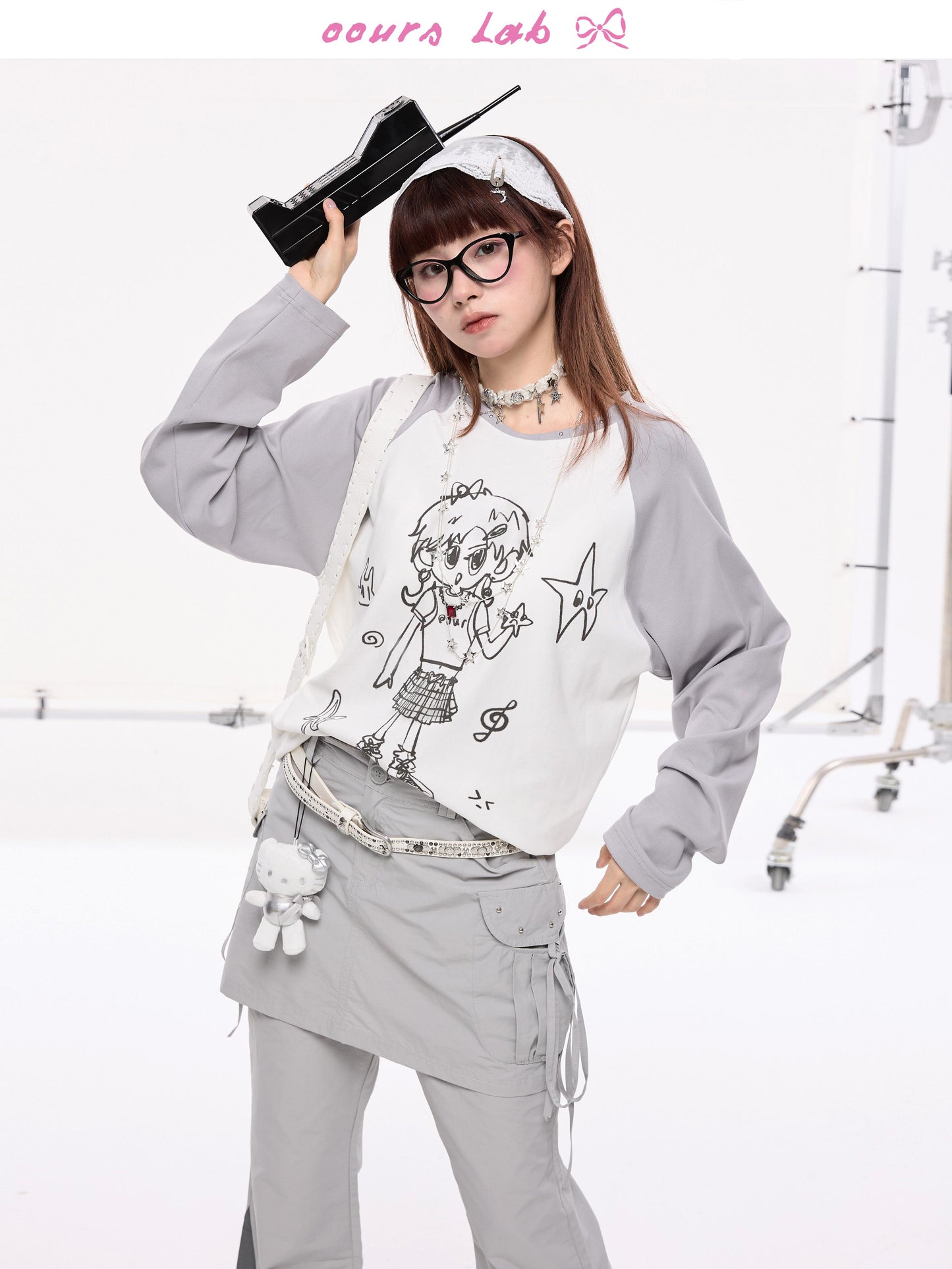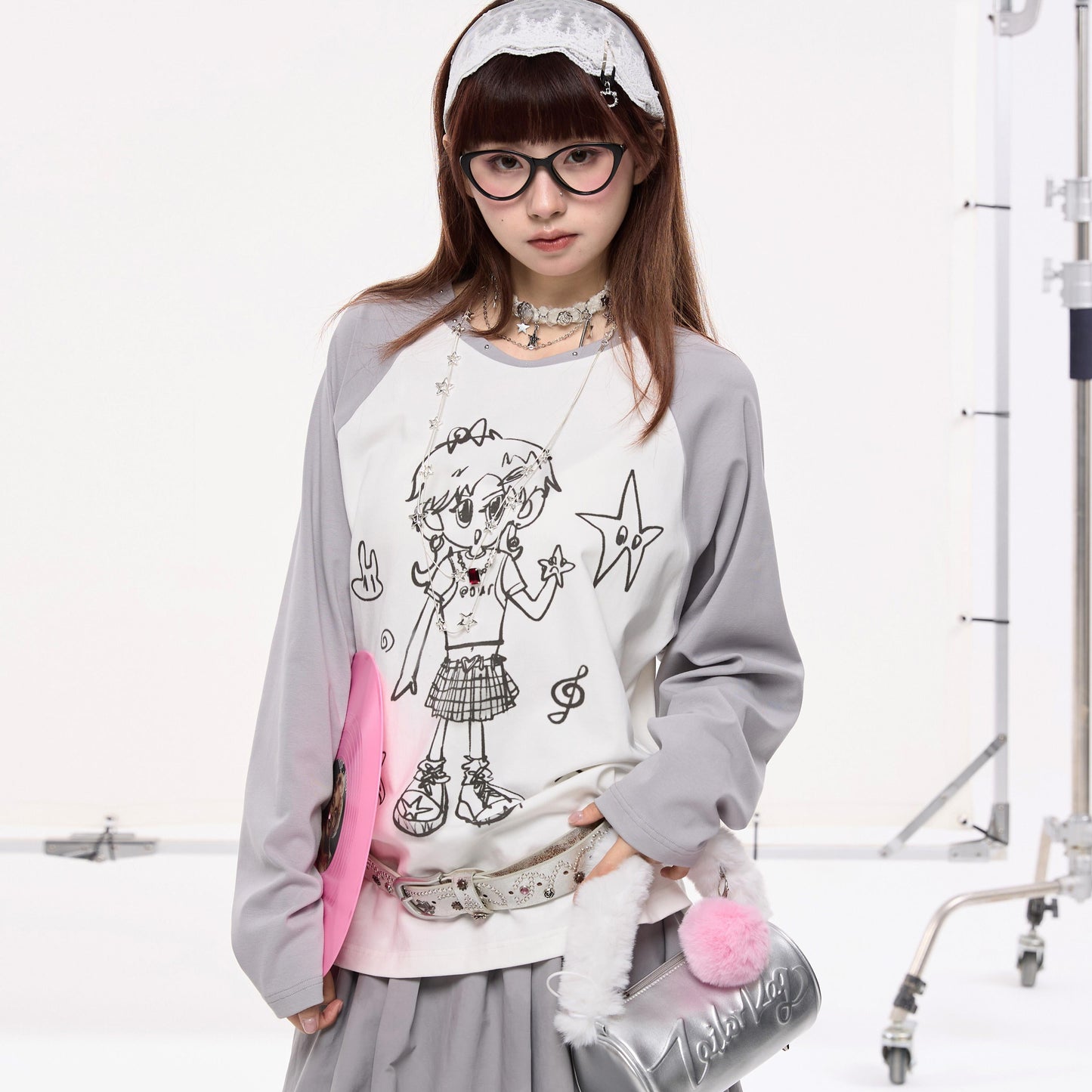 Hand-Drawn Girl Print Contrast Raglan Sleeve Oversize Long Sleeve T-Shirt NA8236