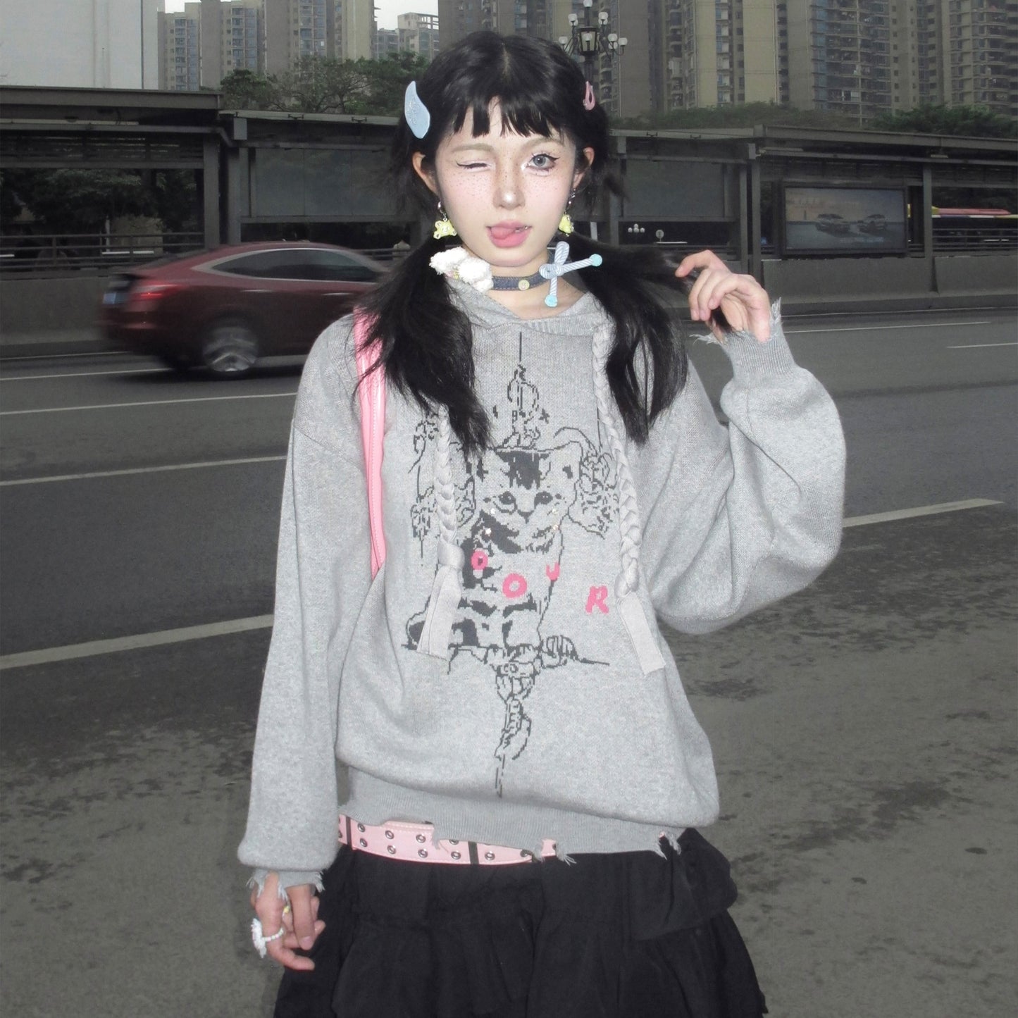 Heavy Jacquard Cat Damage Hooded Knit Sweater NA8238