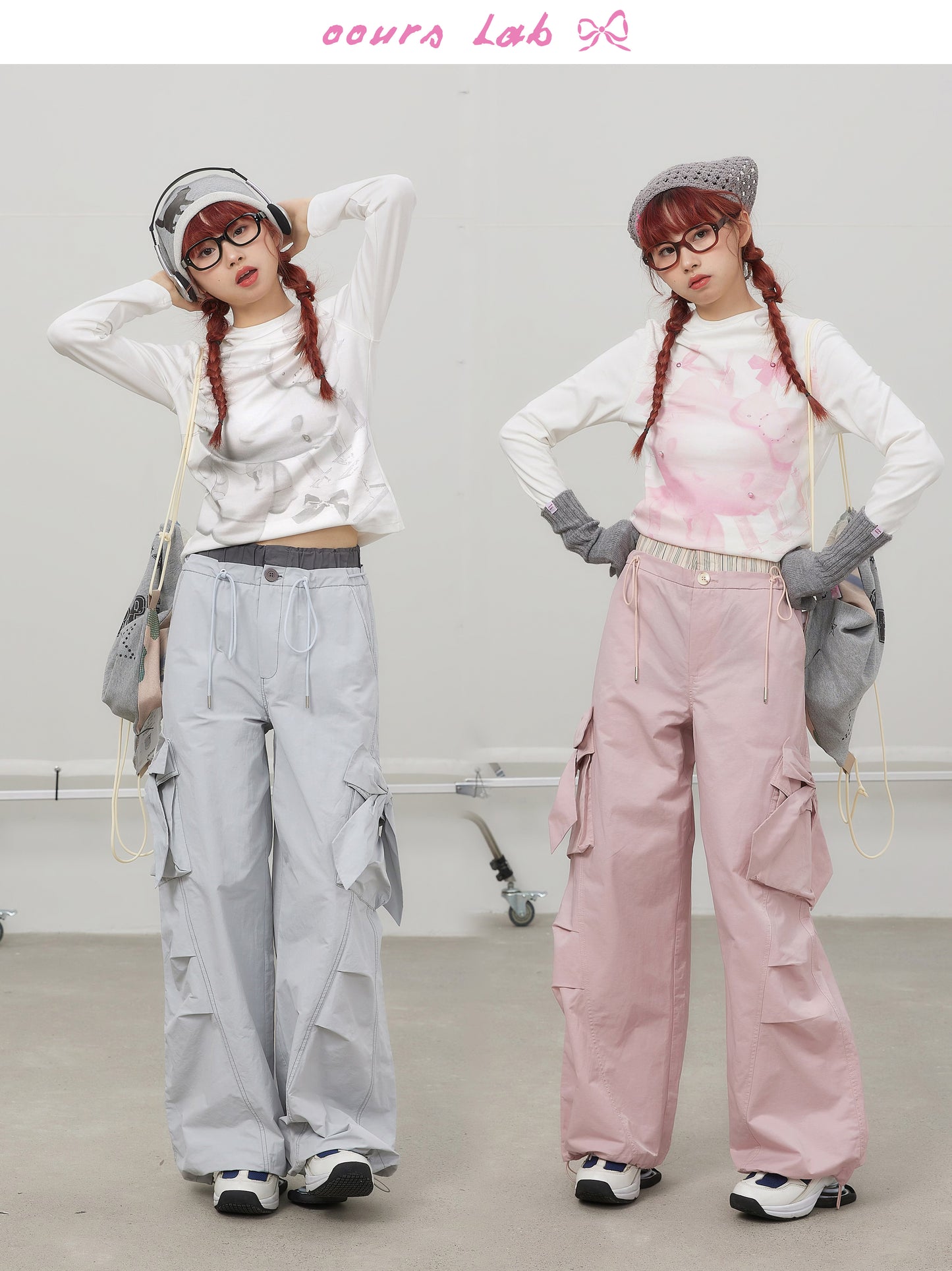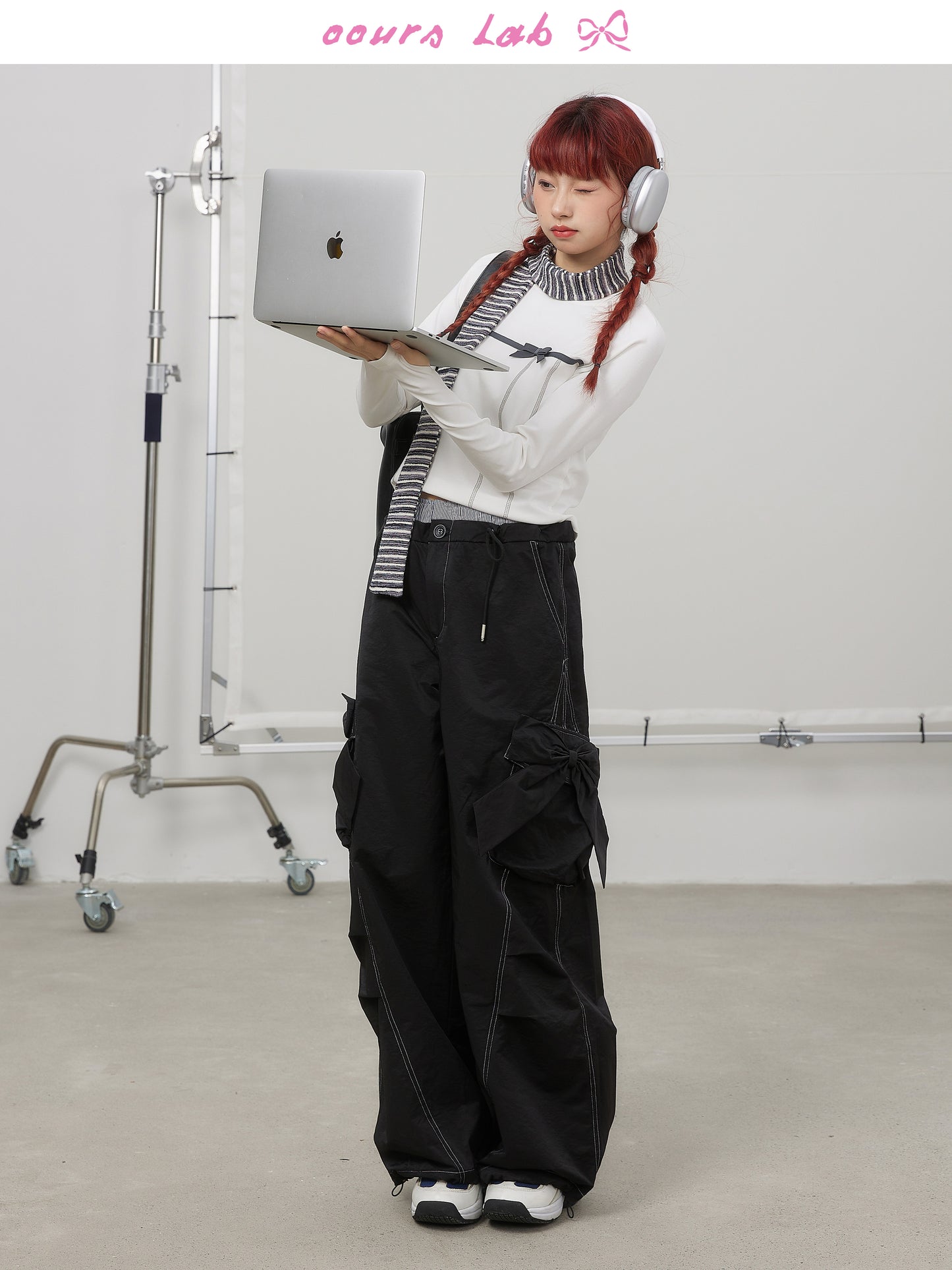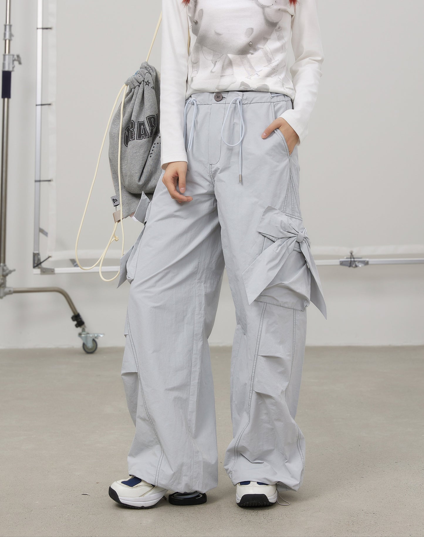 3D Bow Contrast Patch Pockets & Double Waistband Wide-Leg Pants NA8245