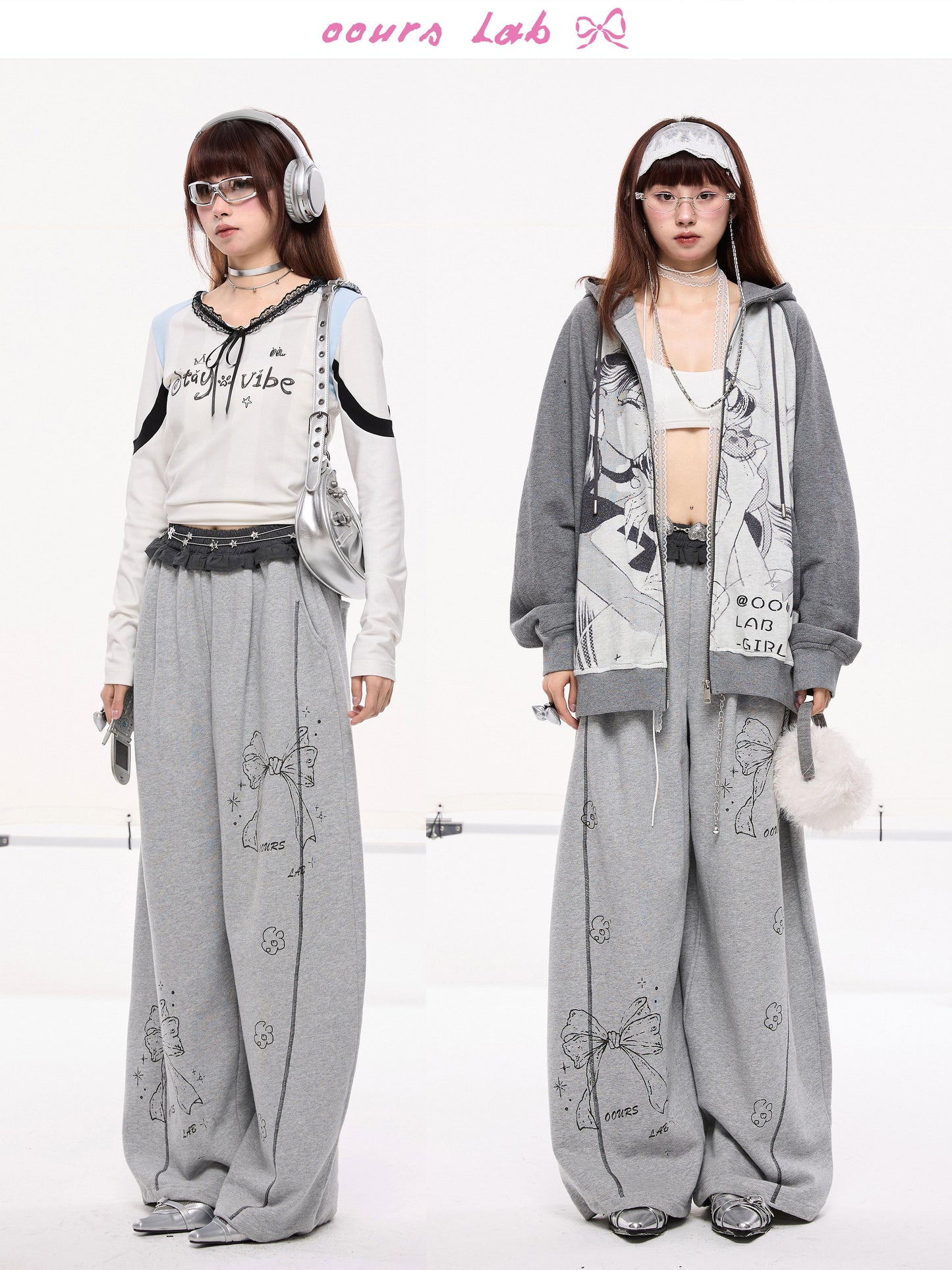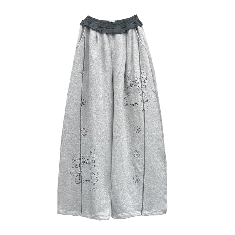 Bow Print Contrast Lace Trim Wide-Leg Sweatpants NA8254