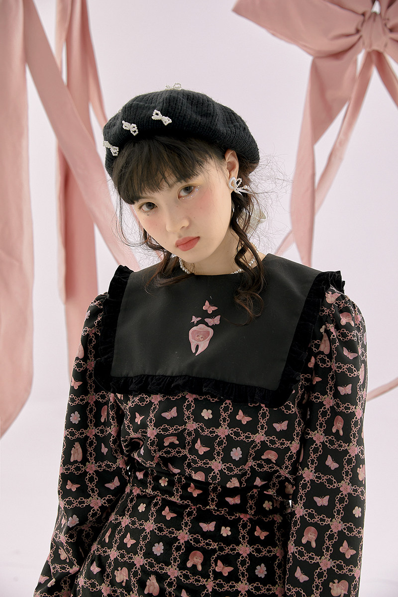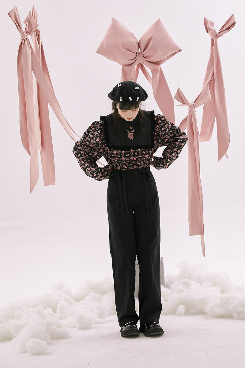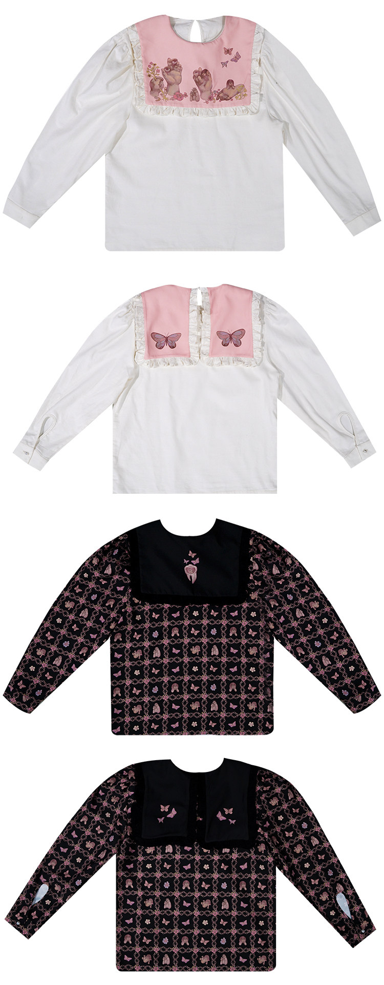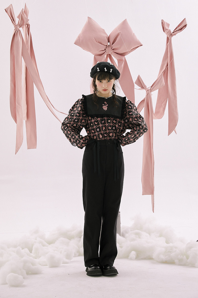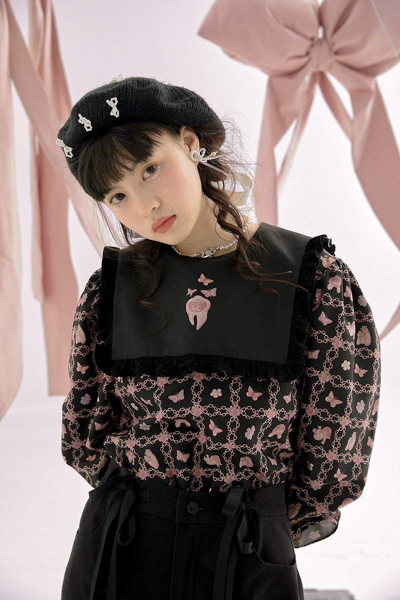 Quirky Print Bubble Sleeve Fake Layered Long Sleeve Blouse NA8294