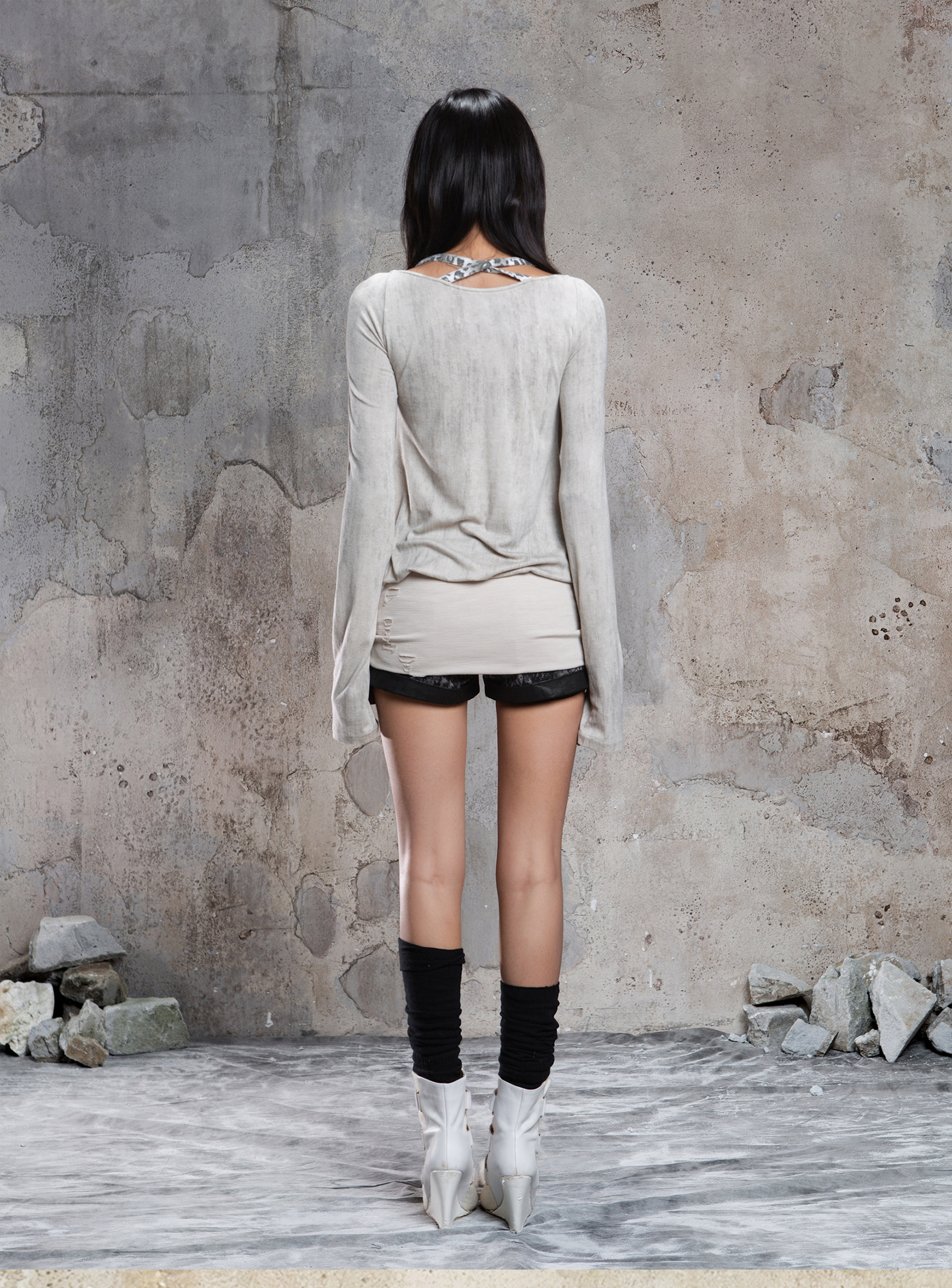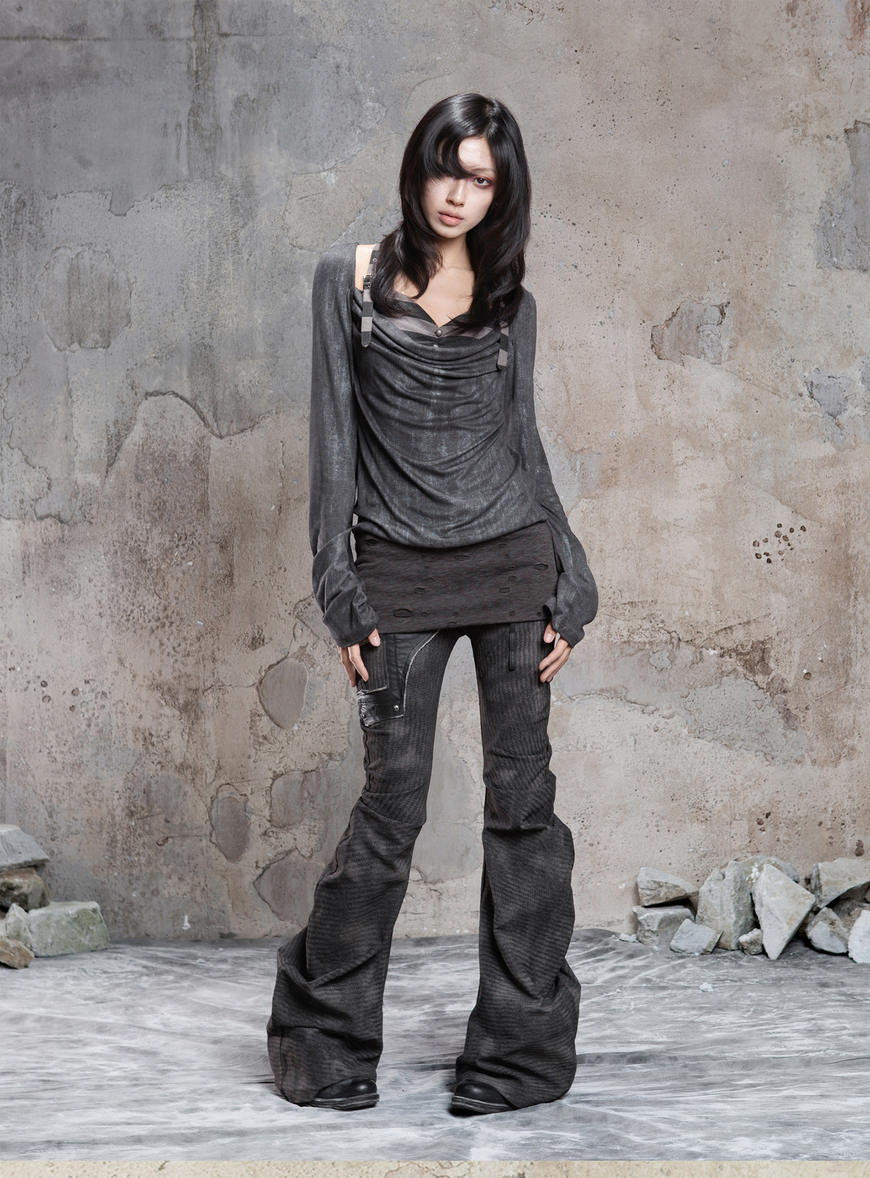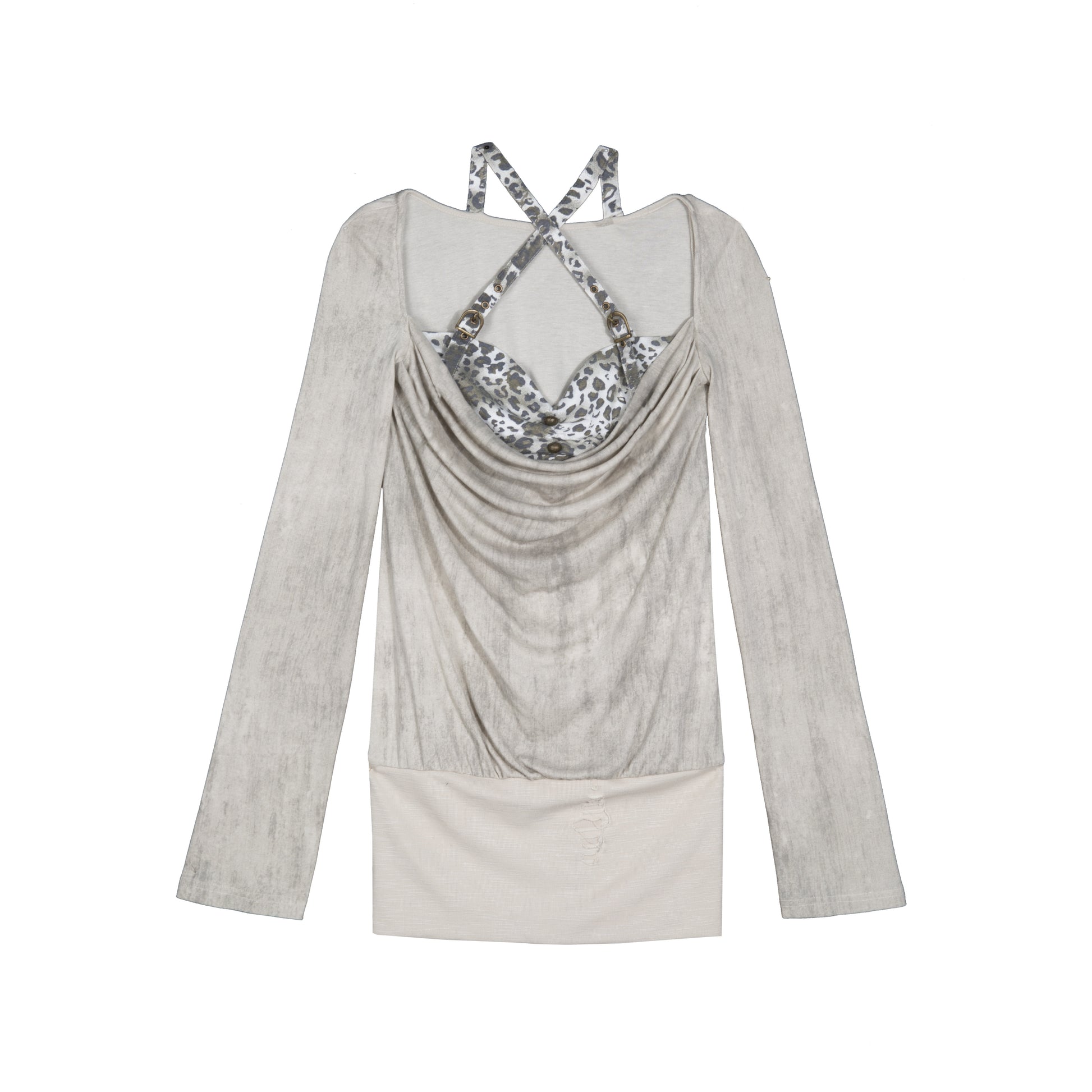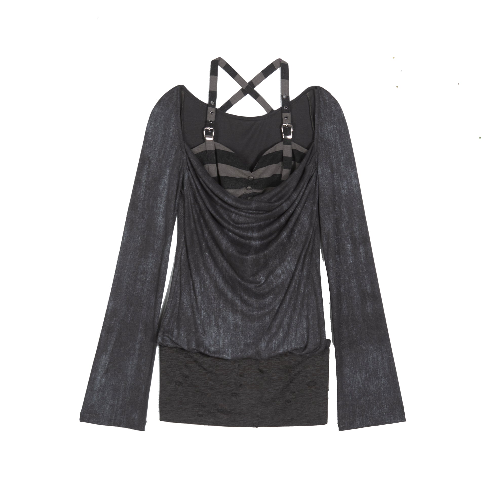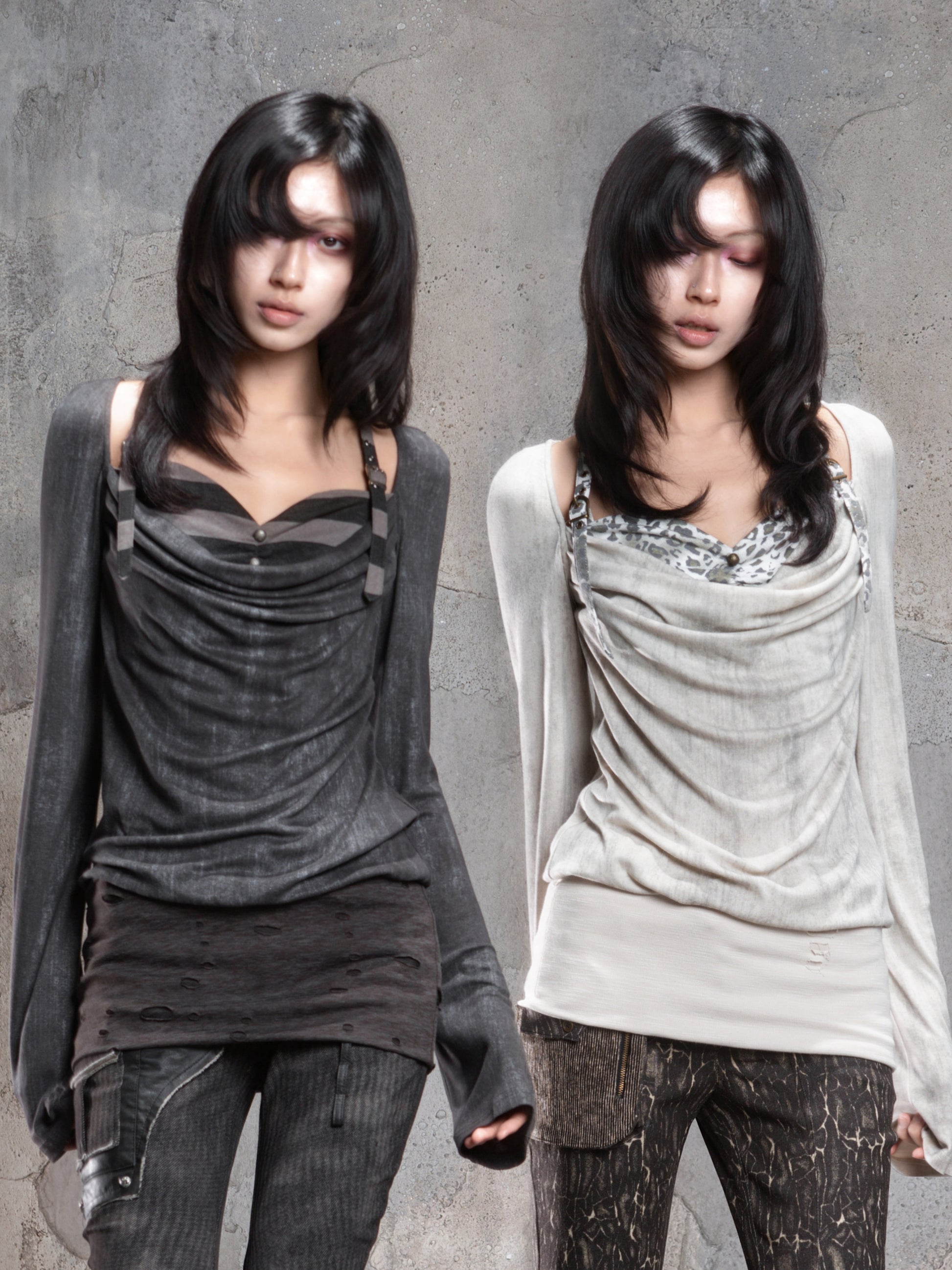 Fake Two-Piece Draped Pleated Mid- Length Slimming Long Sleeve T-Shirts NA8357