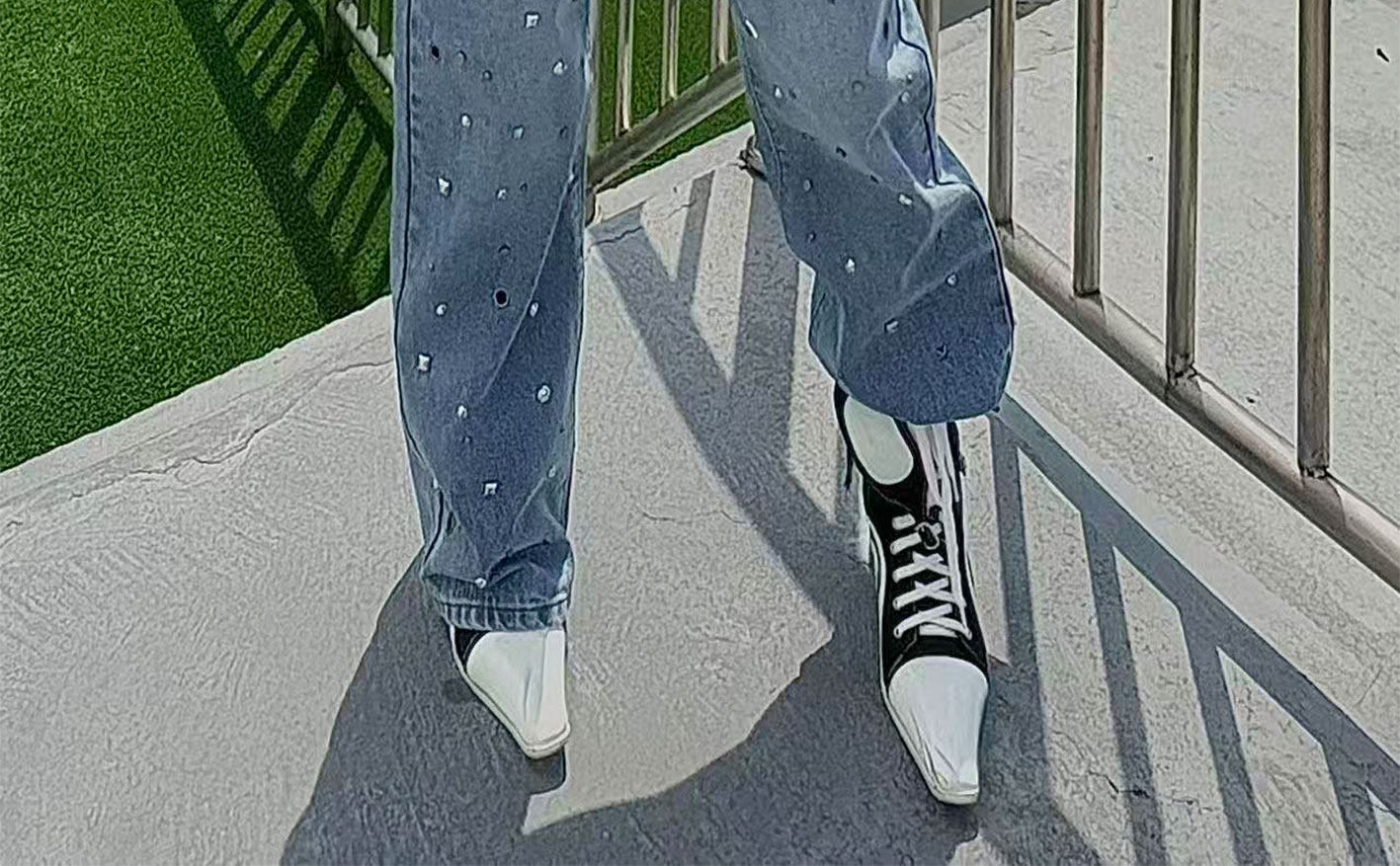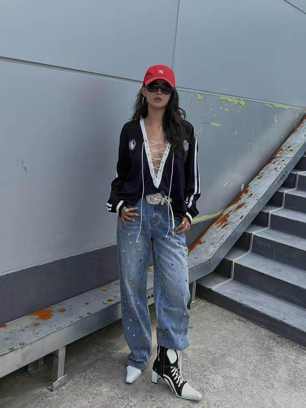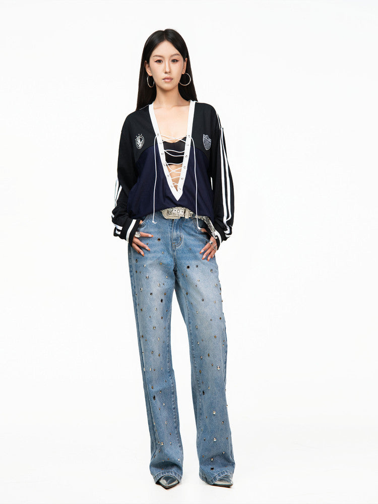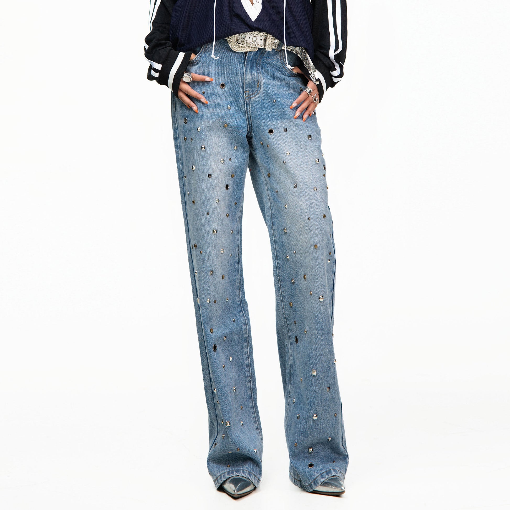 Washed Wide Leg Studded Denim Jeans NA8369