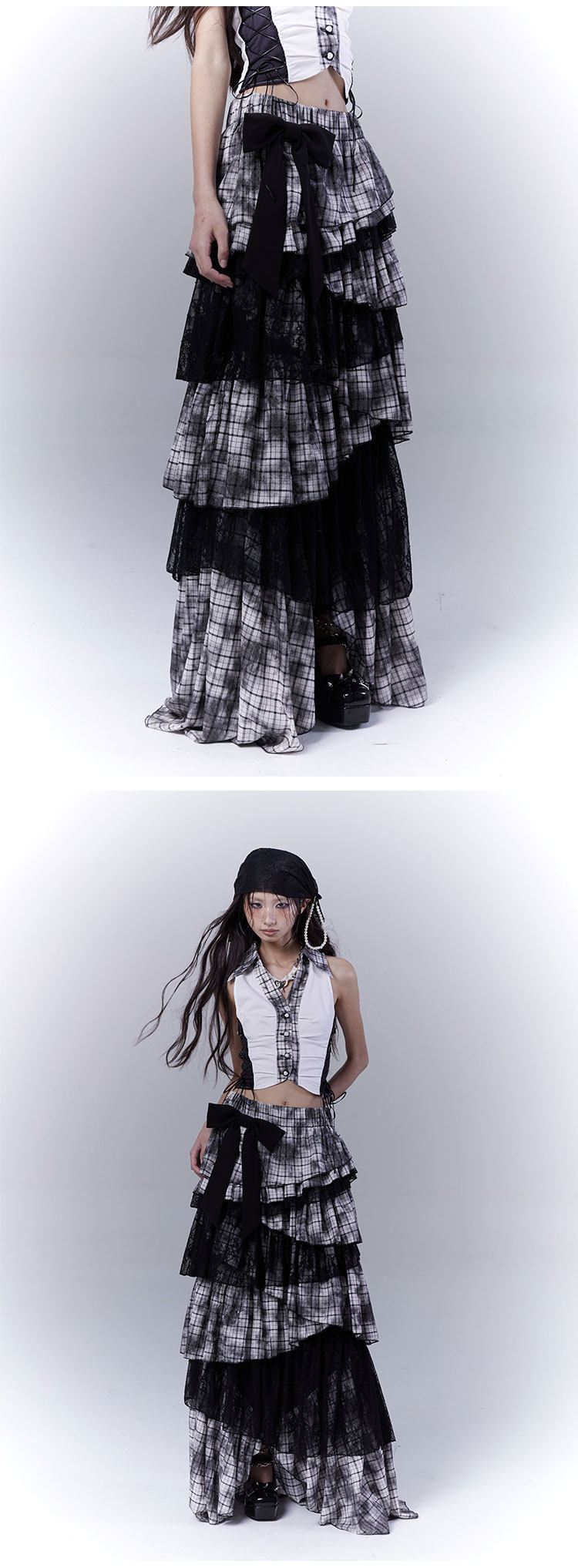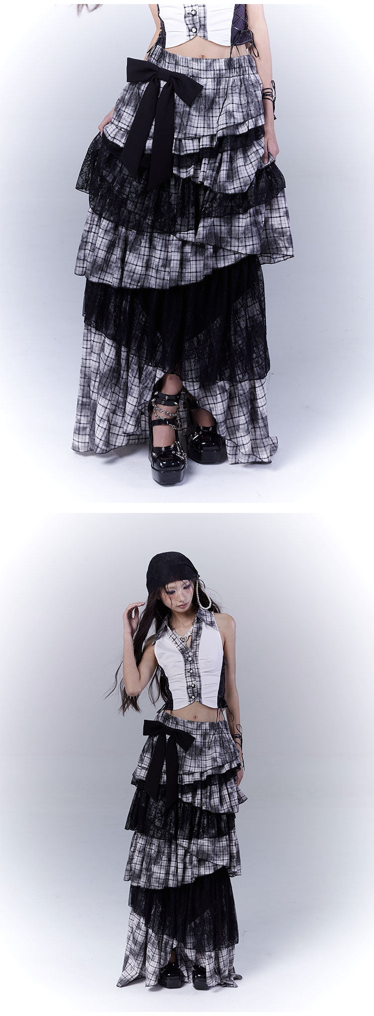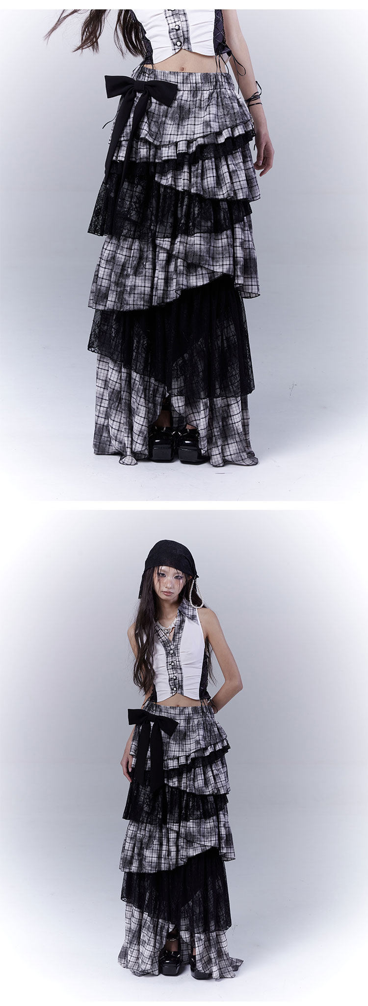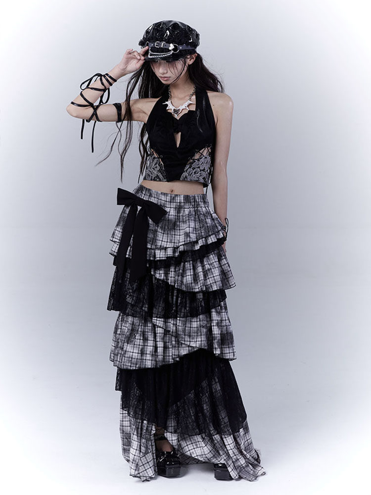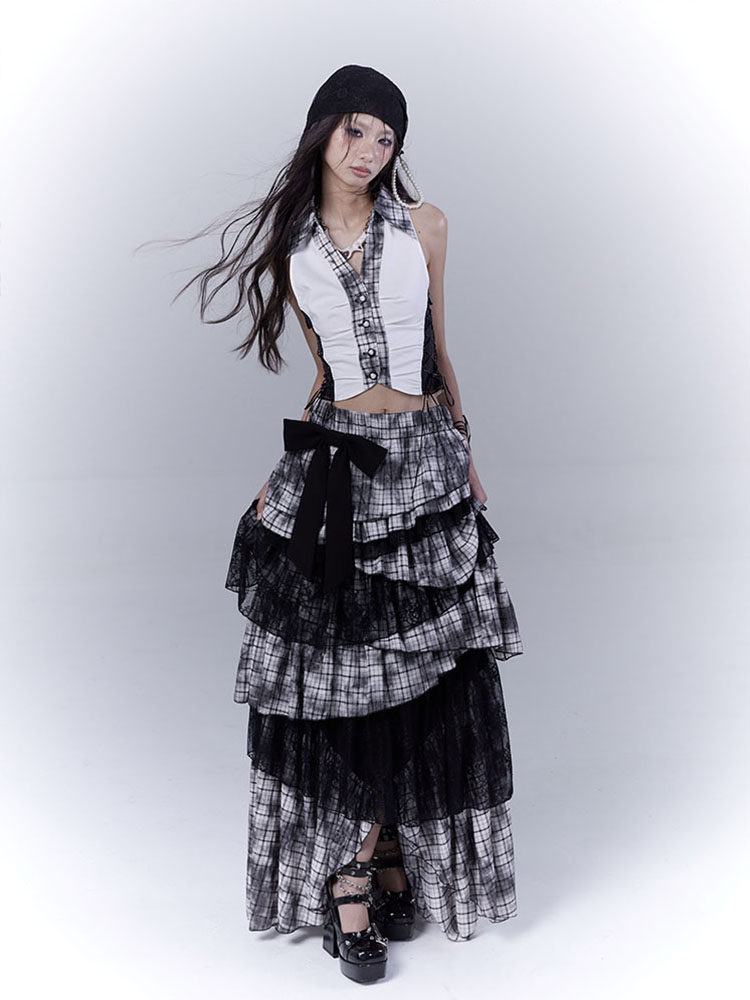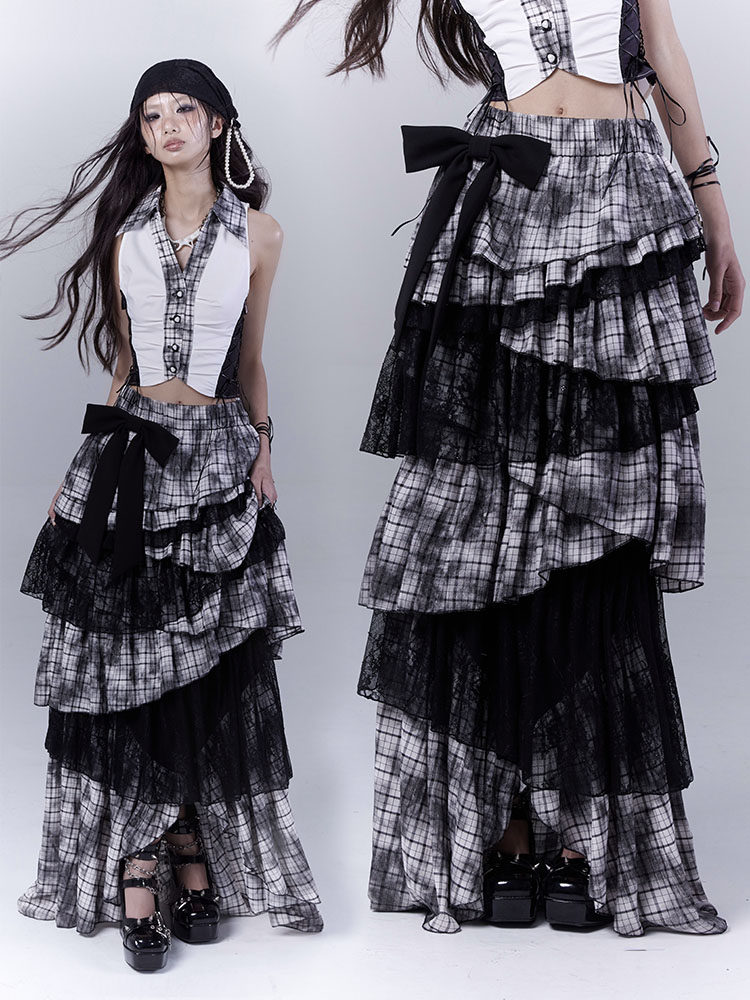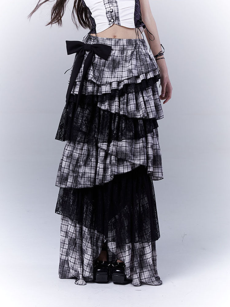 Lace Plaid Tiered Asymmetric Skirt NA8533