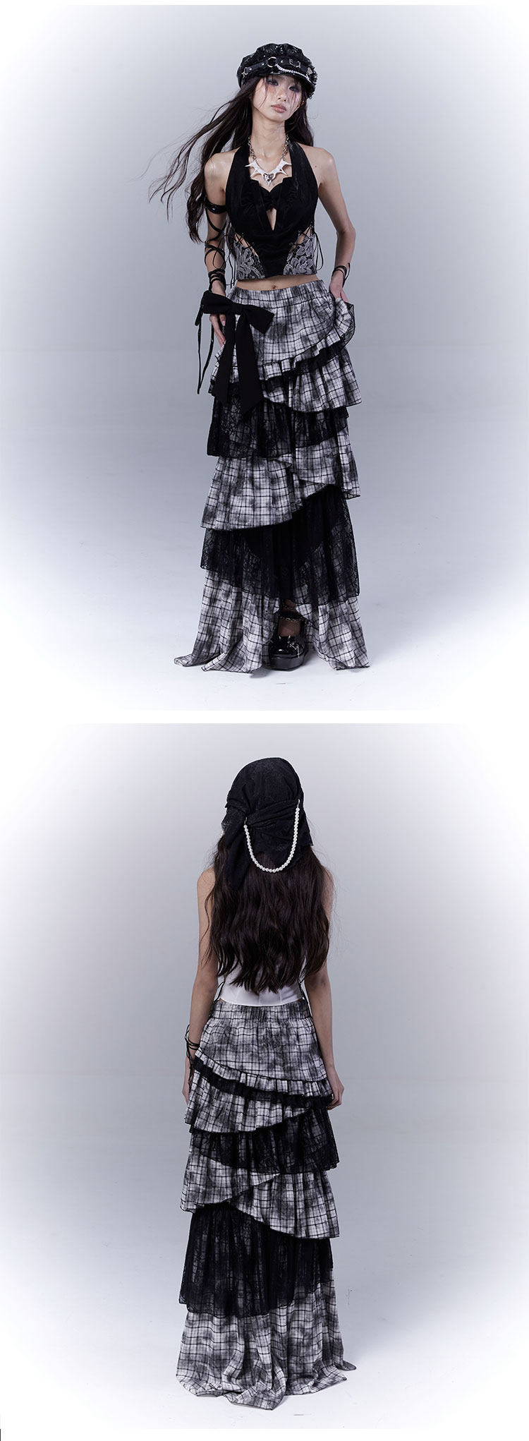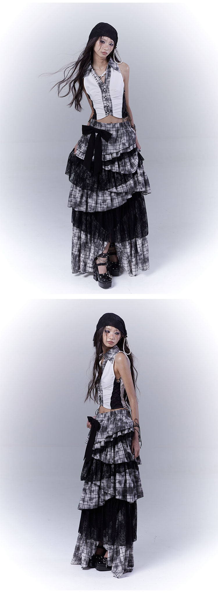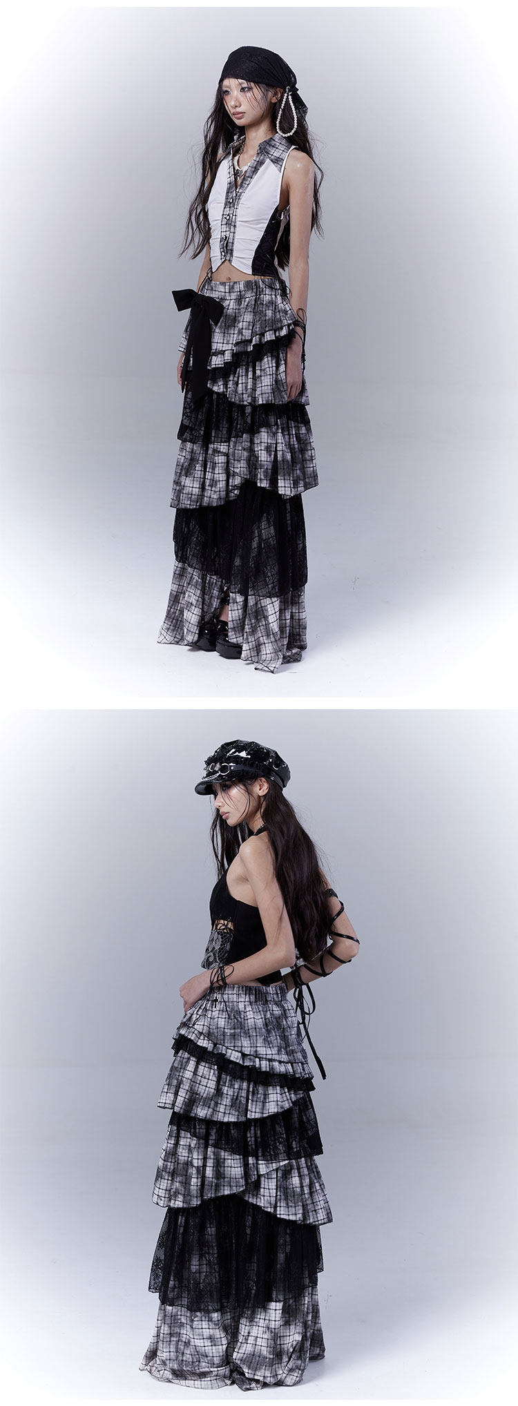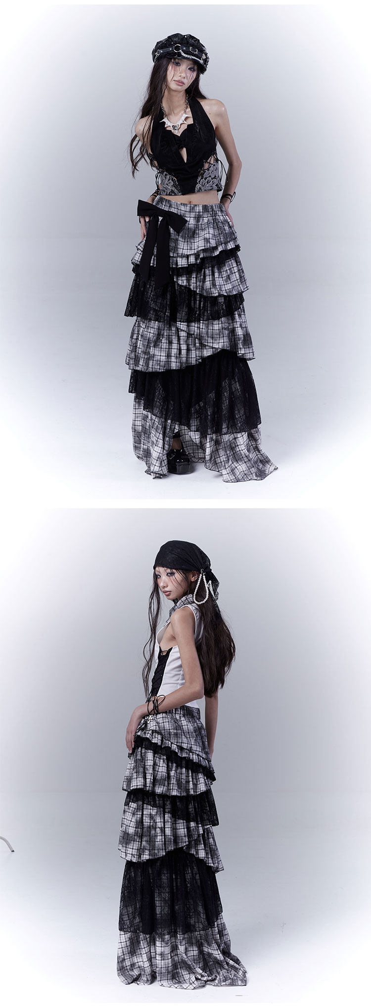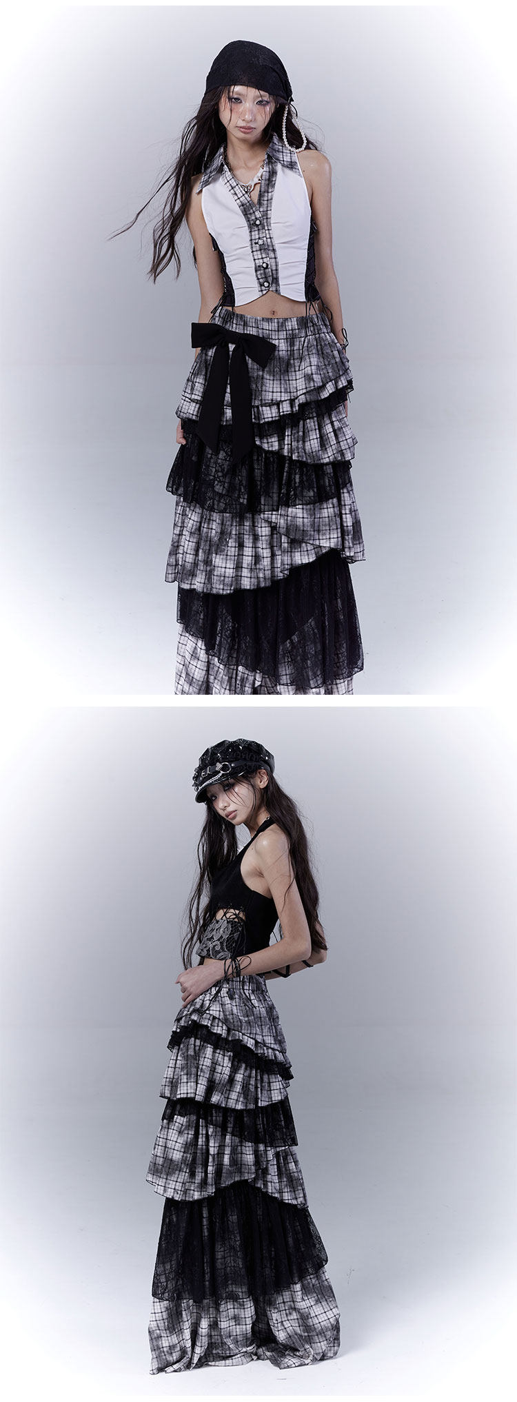 Lace Plaid Tiered Asymmetric Skirt NA8533