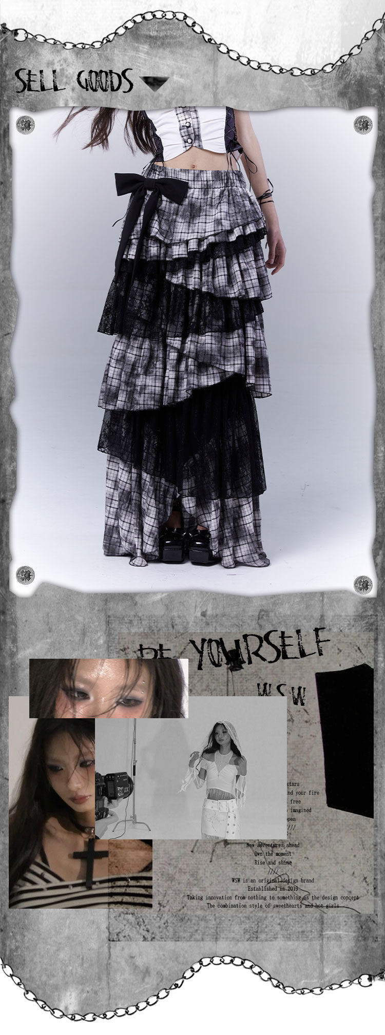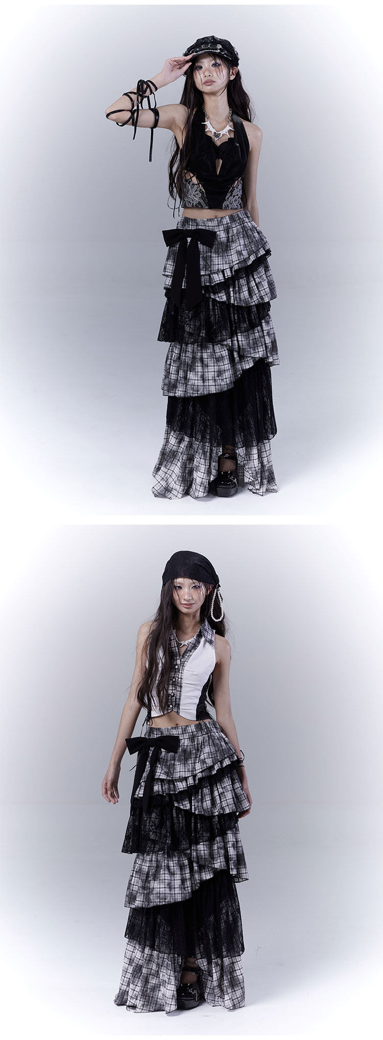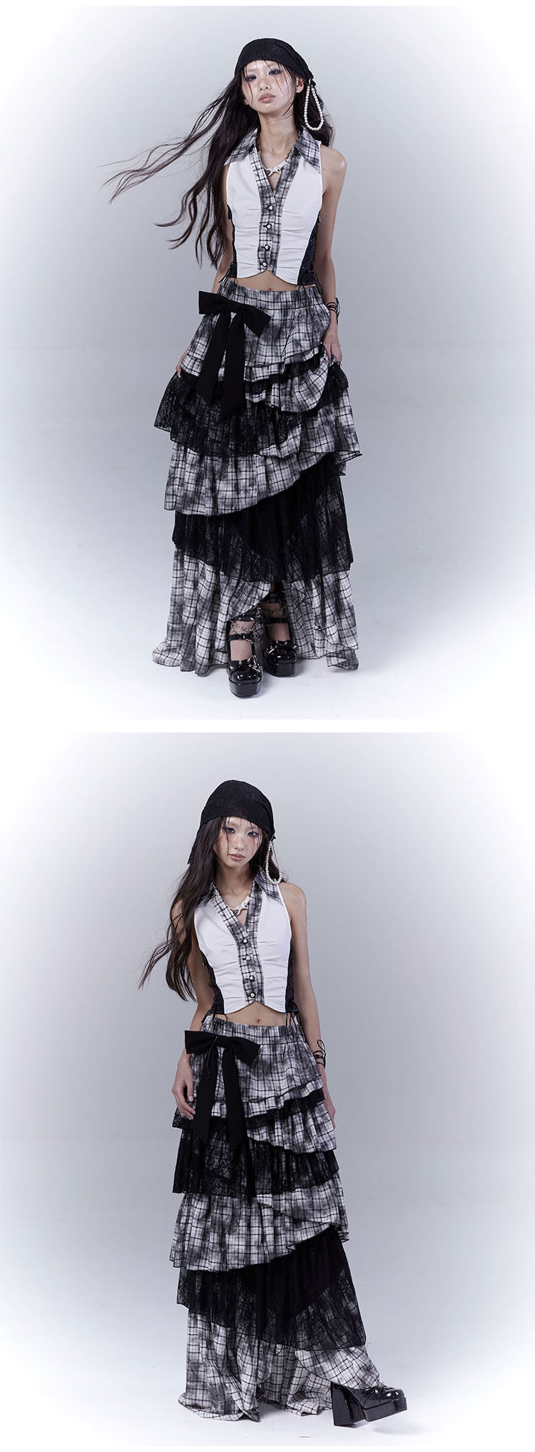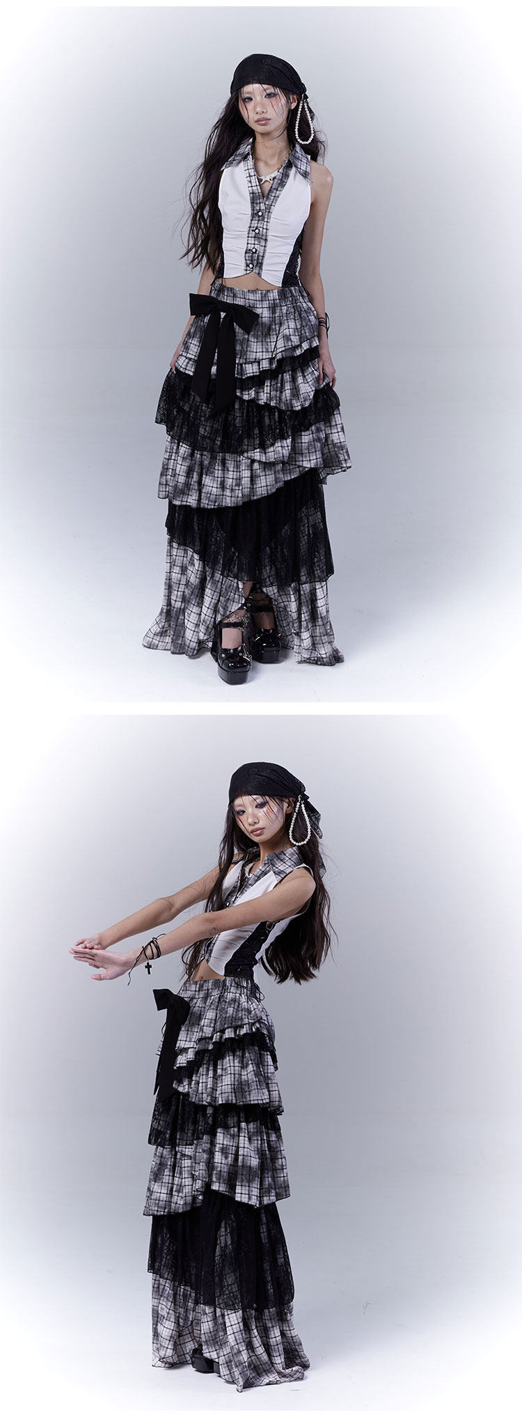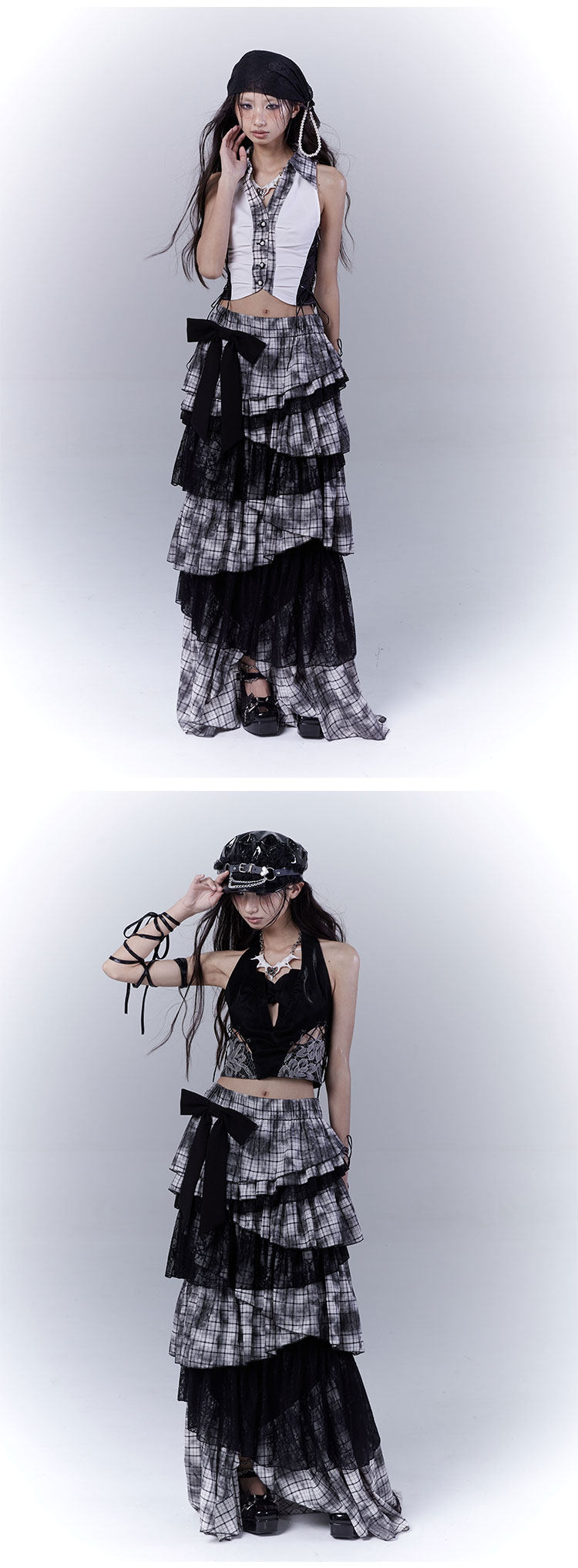 Lace Plaid Tiered Asymmetric Skirt NA8533