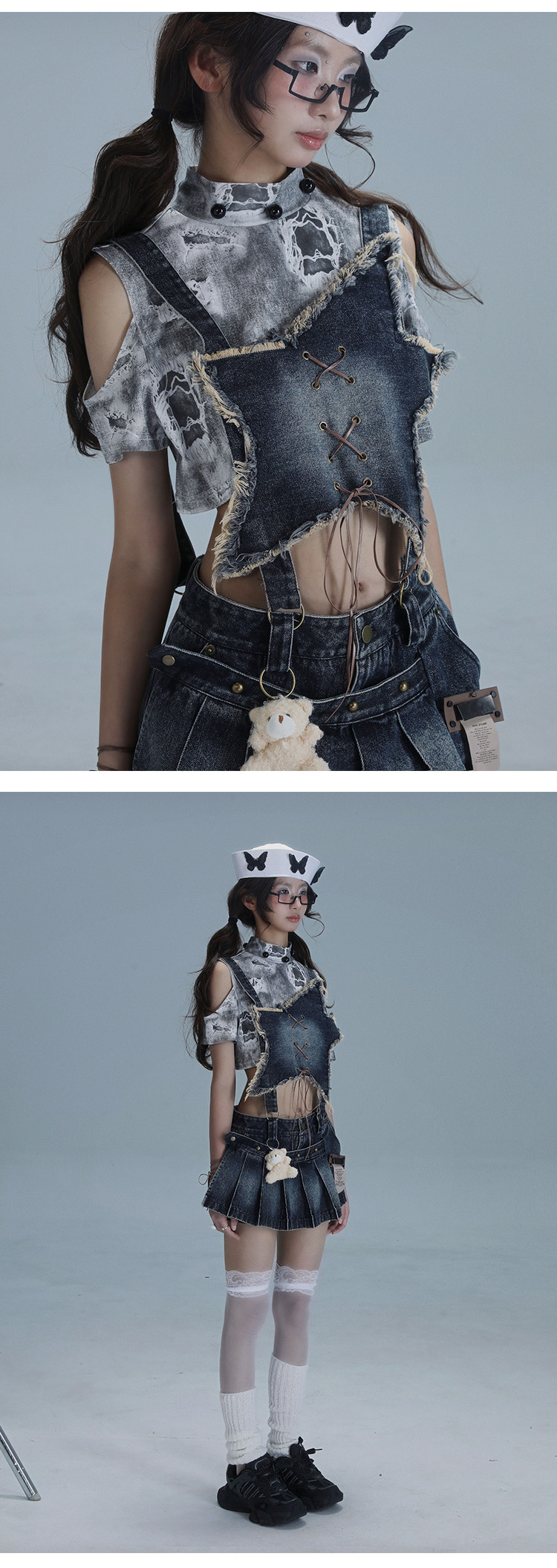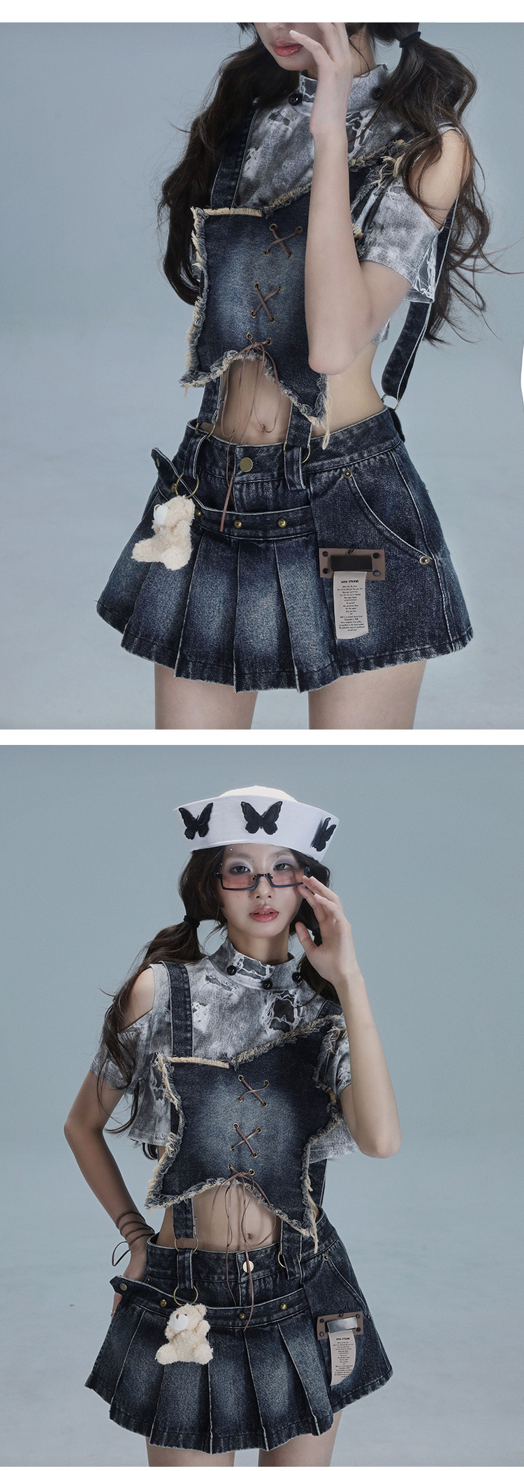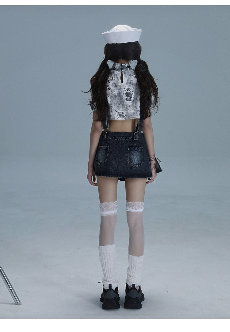 Detachable Washed Suspender Denim Short Skirt & Inner Shirts Set NA8554