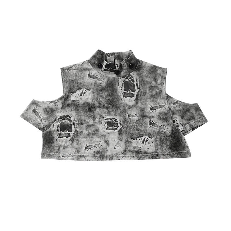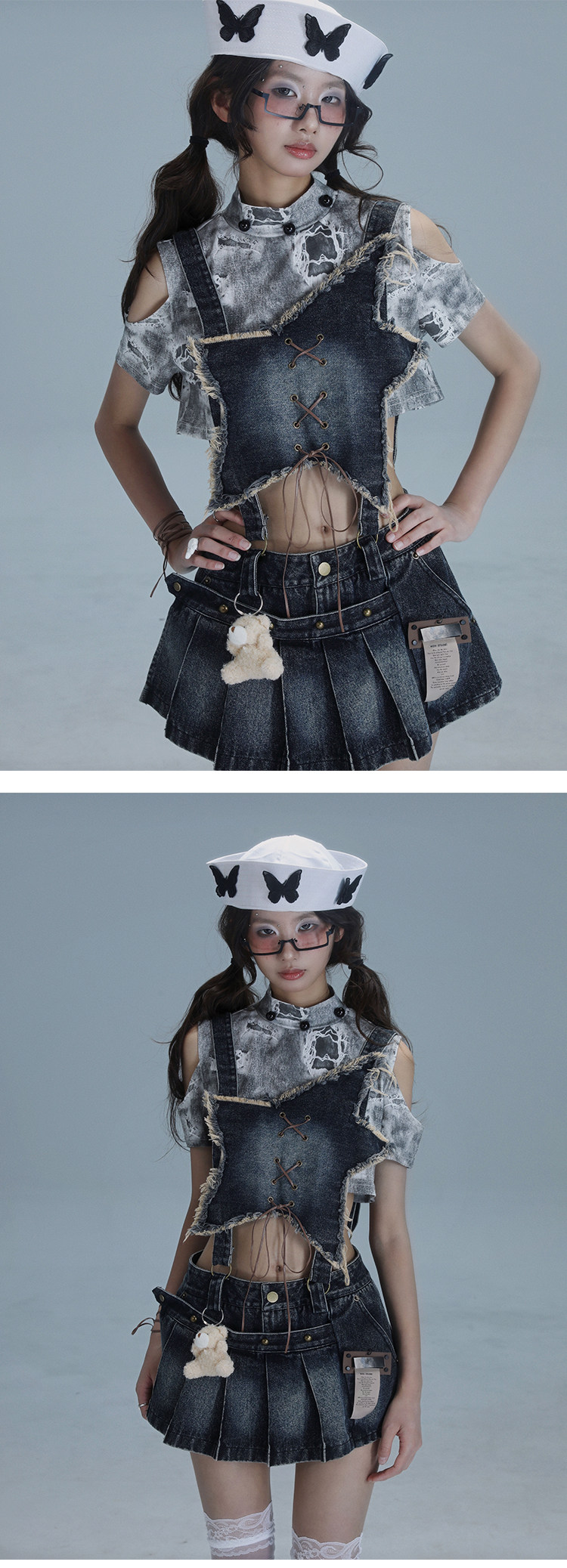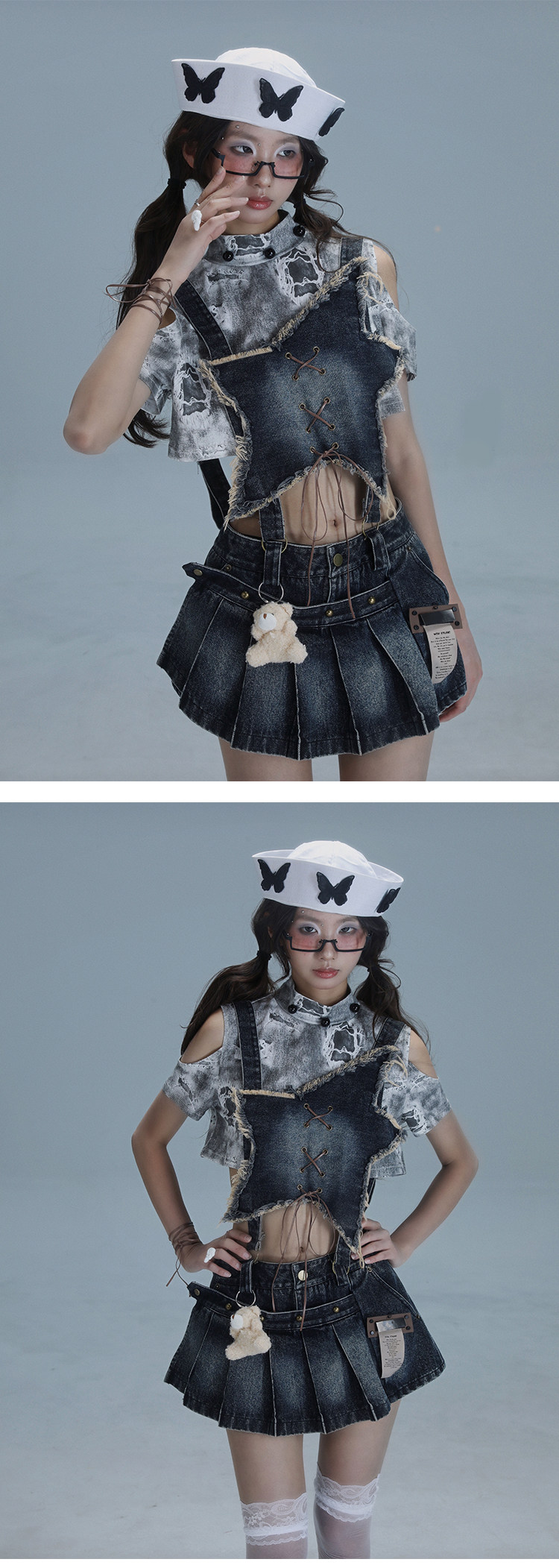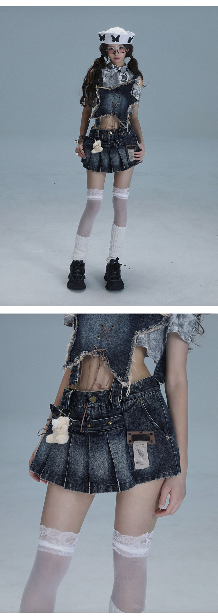 Detachable Washed Suspender Denim Short Skirt & Inner Shirts Set NA8554