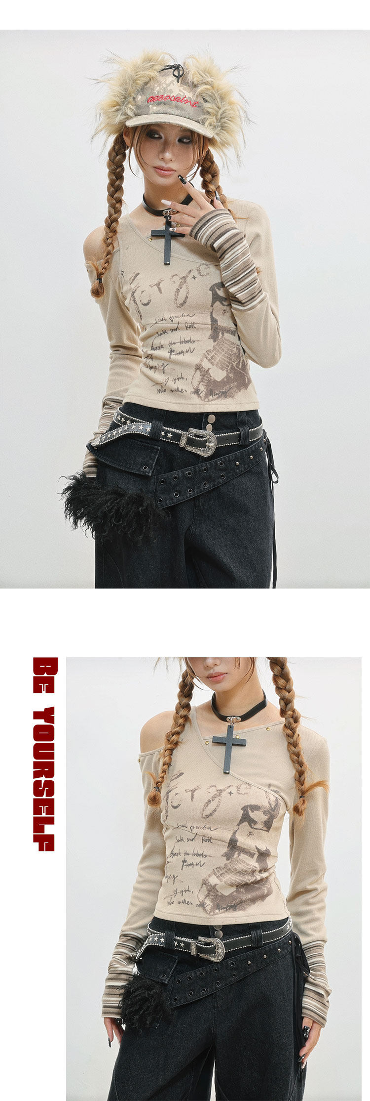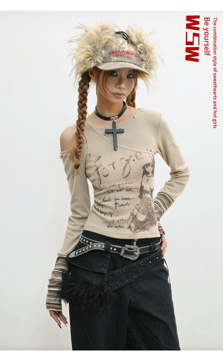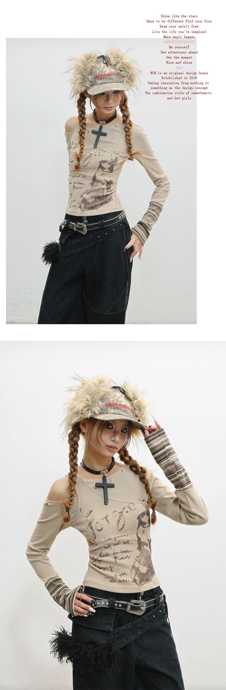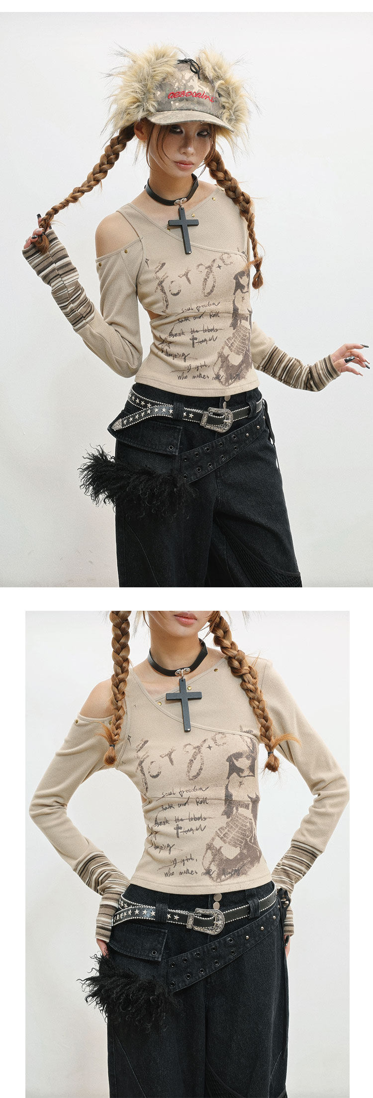 Off-Shoulder Patchwork Print Long Sleeve Knit T-Shirt NA8557