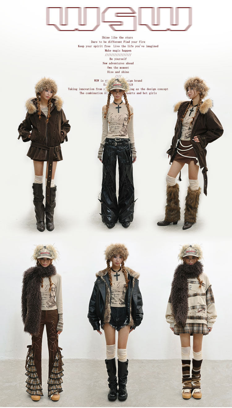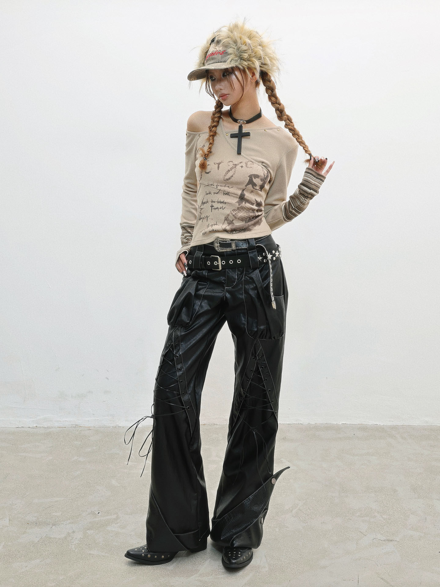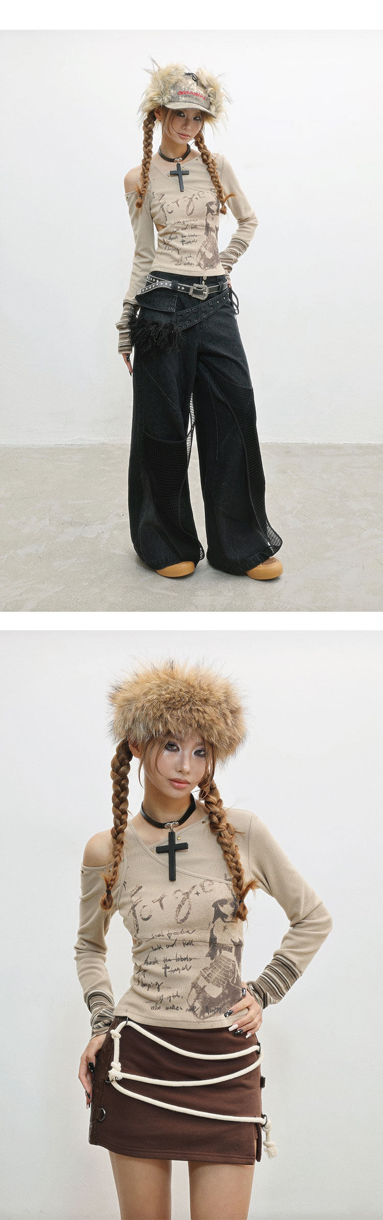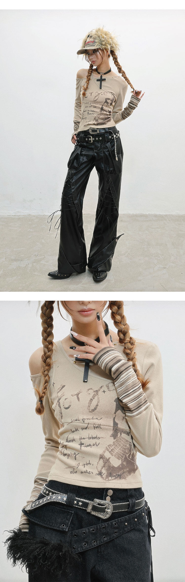 Off-Shoulder Patchwork Print Long Sleeve Knit T-Shirt NA8557