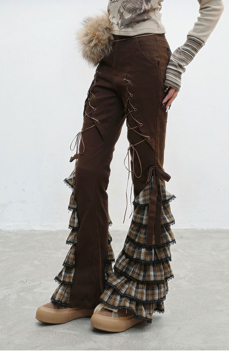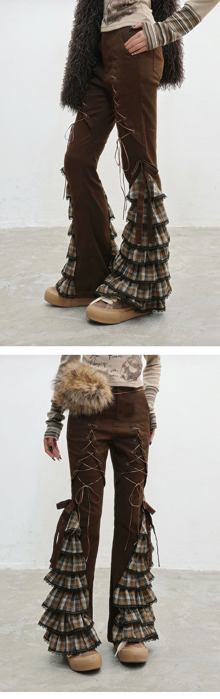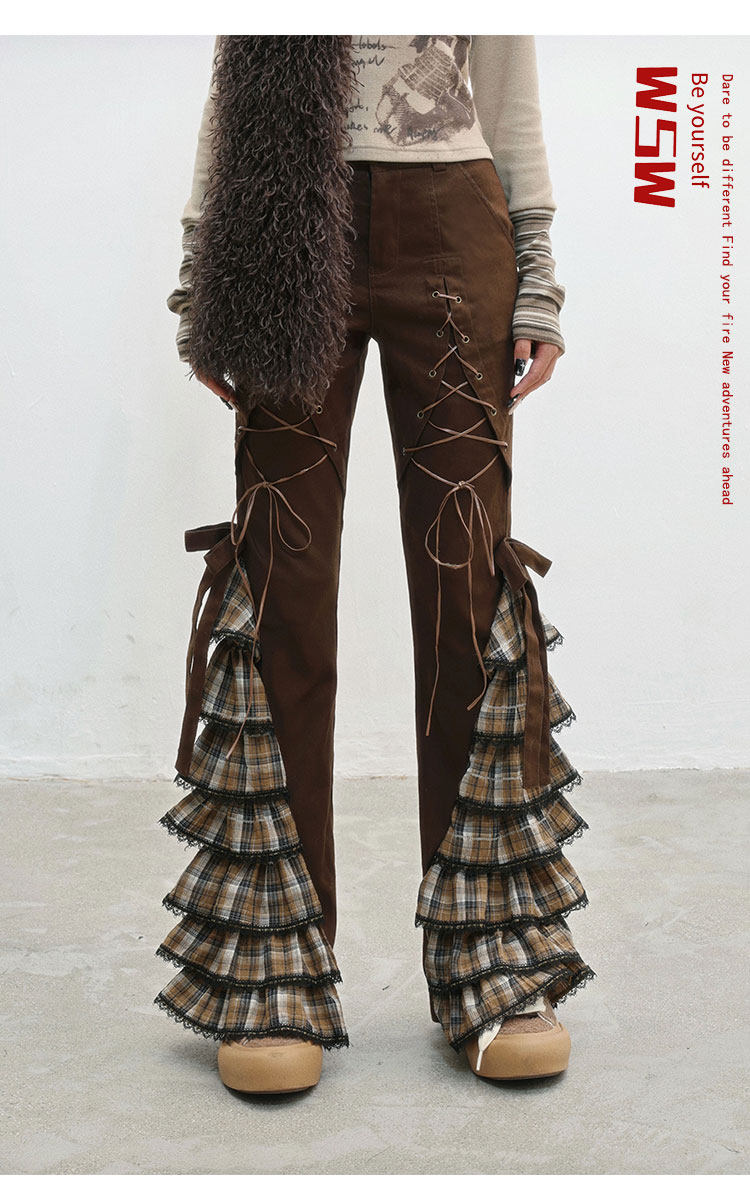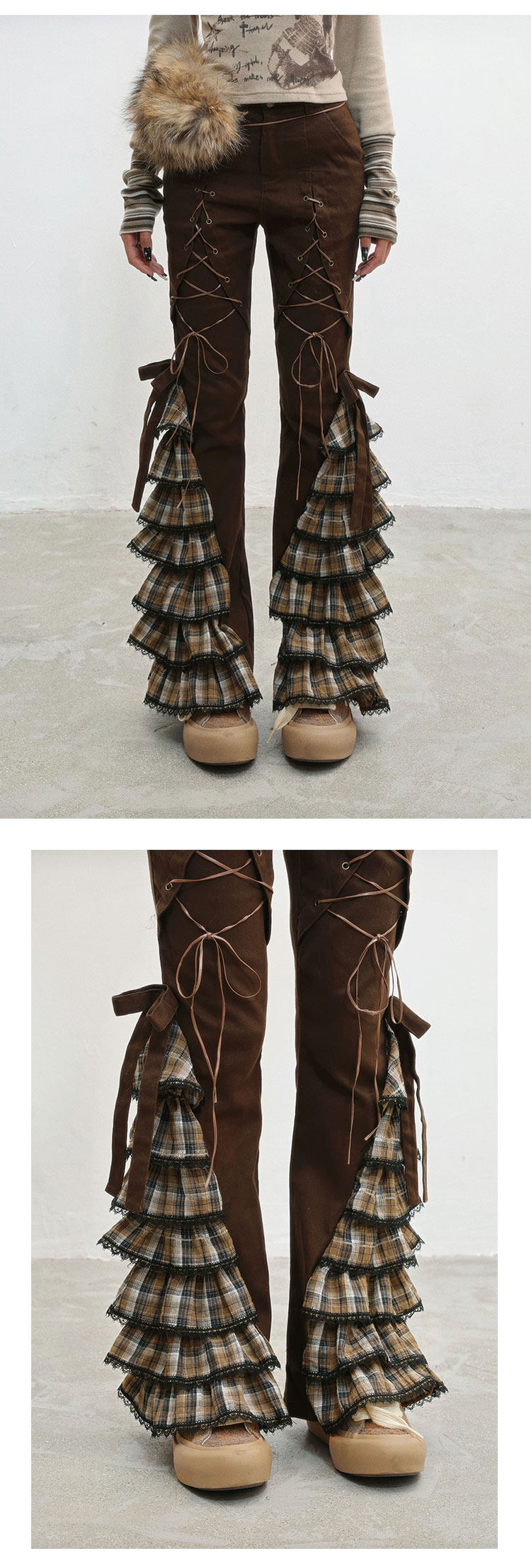 Plaid Lace-Up Ruffle Slimming Pants NA8559