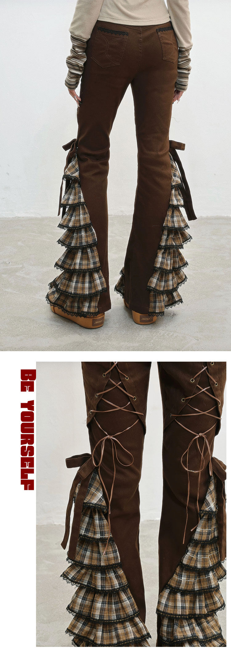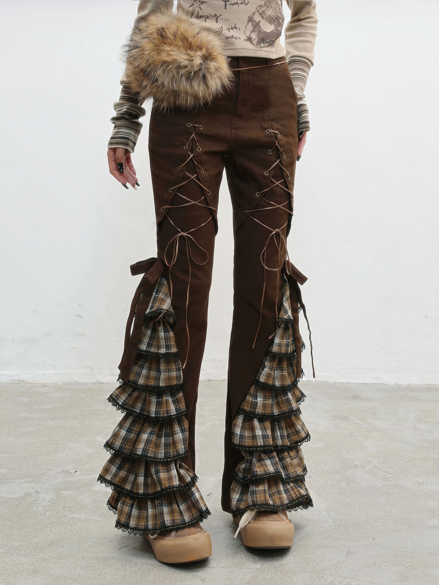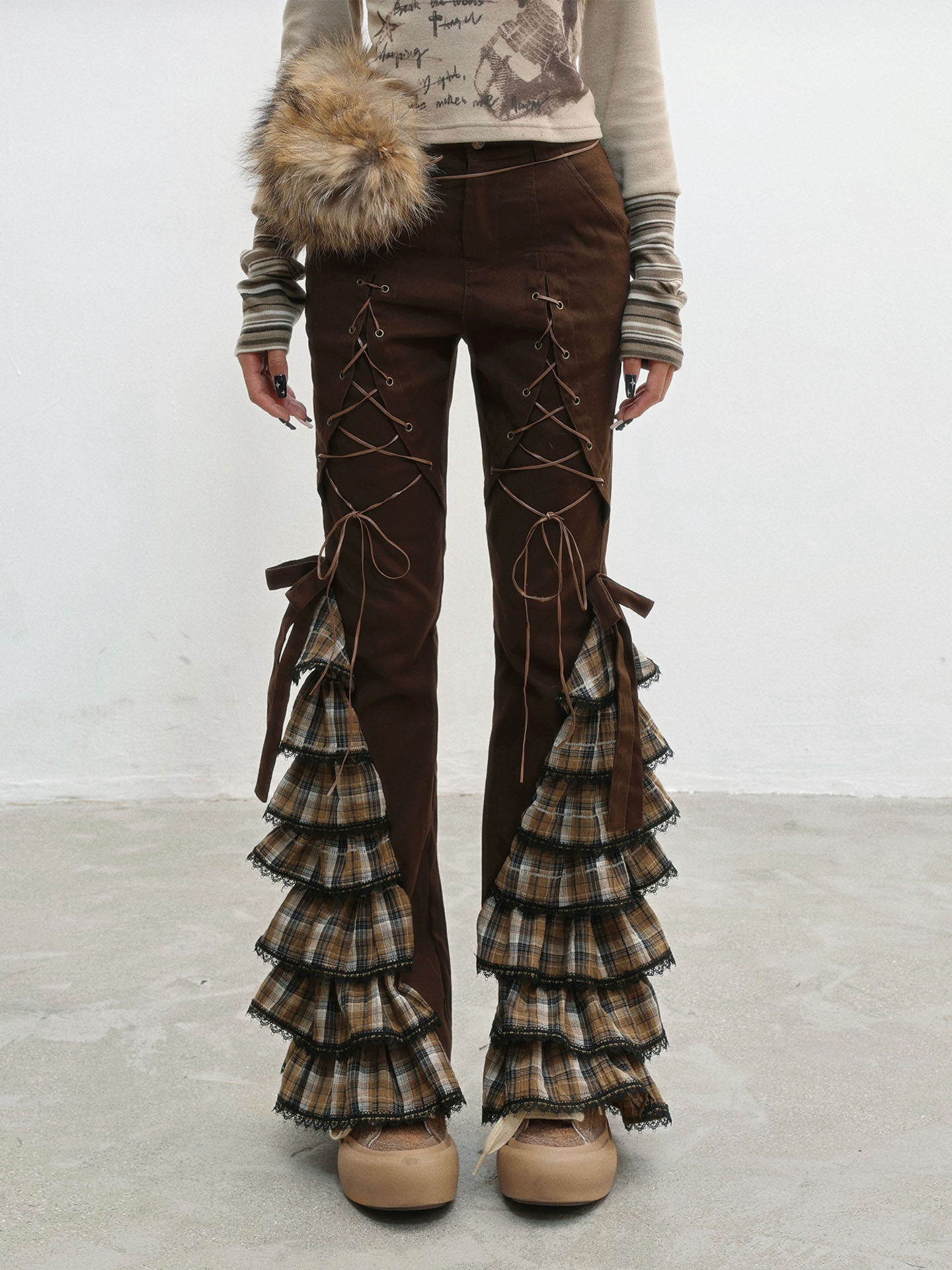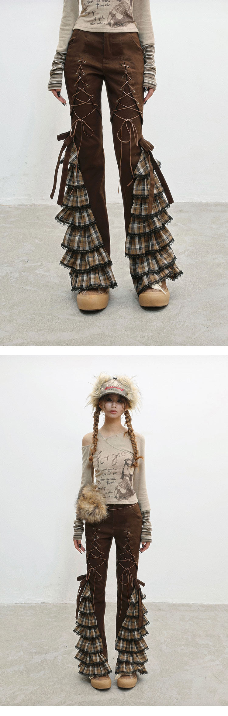 Plaid Lace-Up Ruffle Slimming Pants NA8559