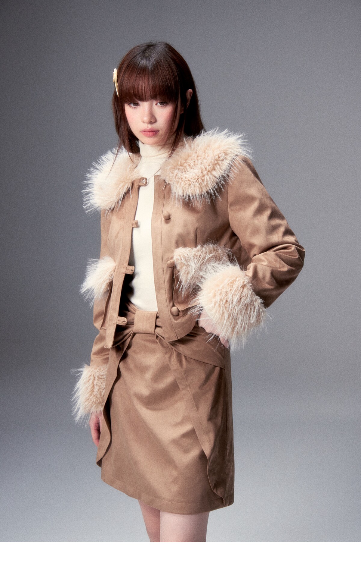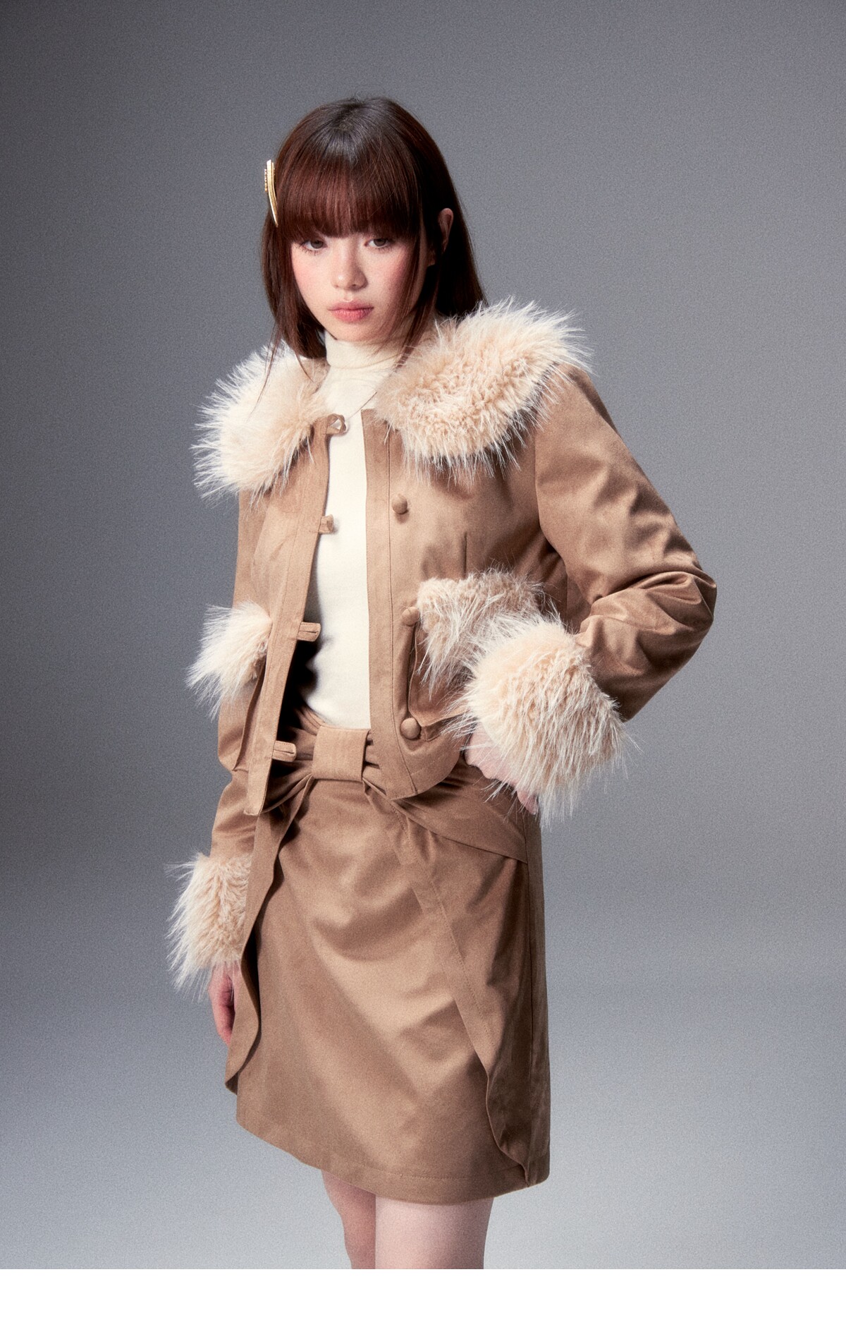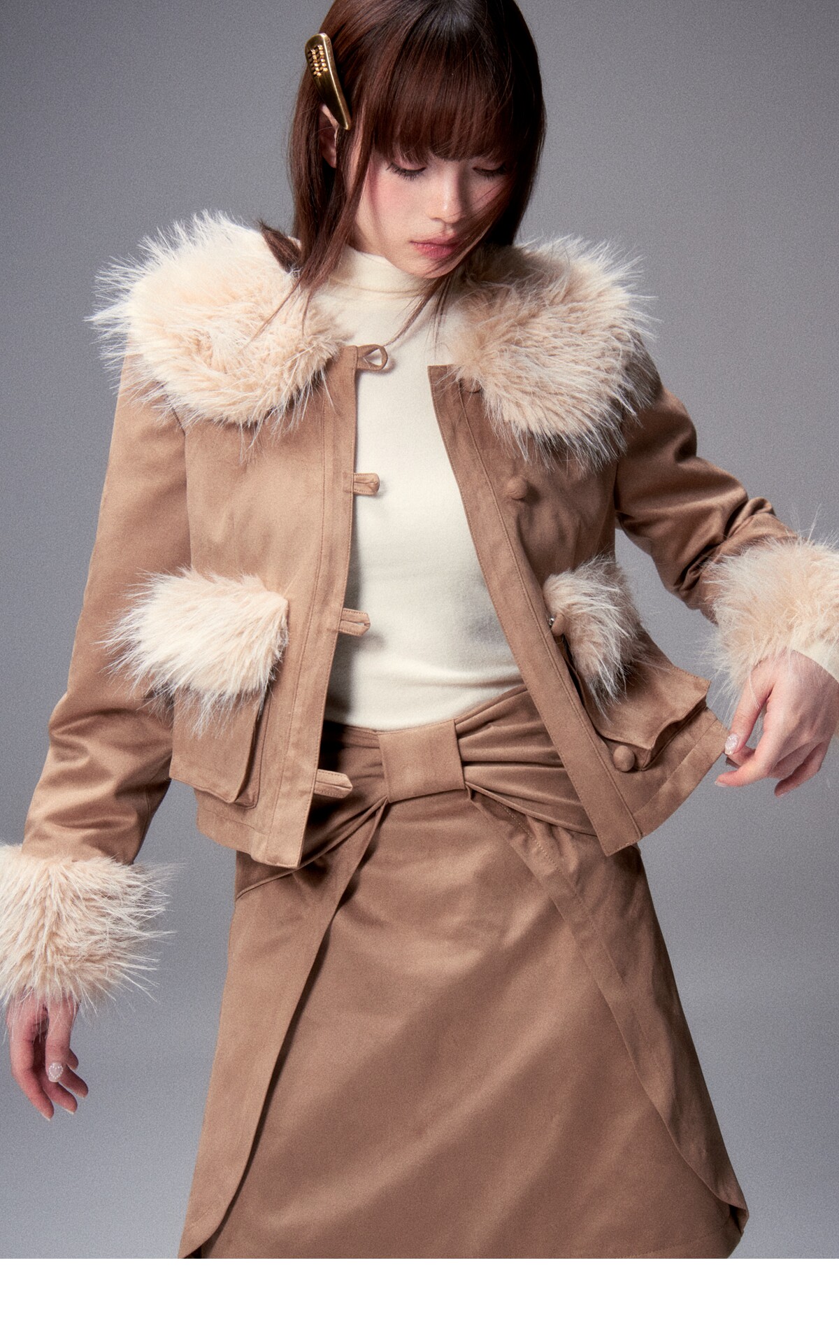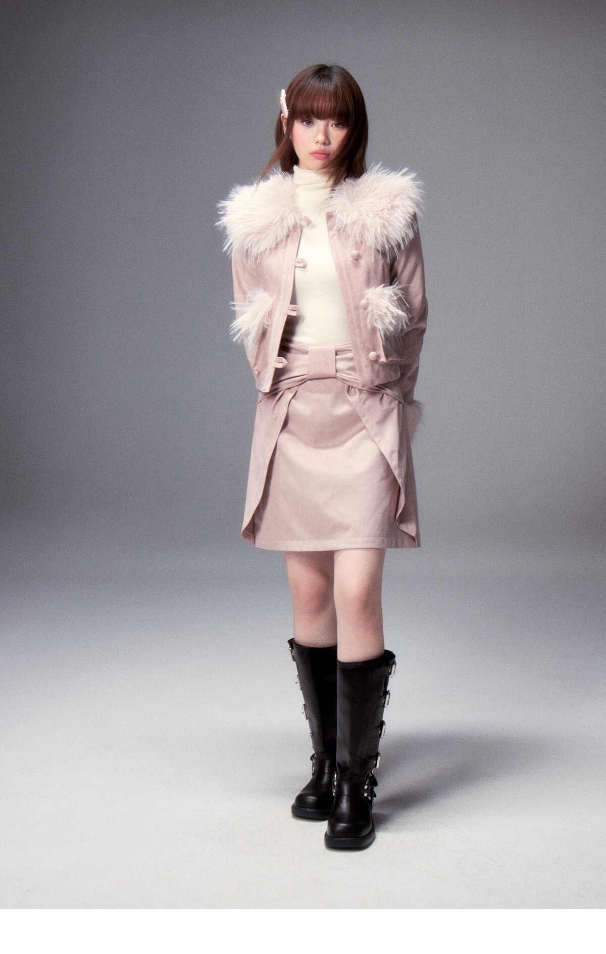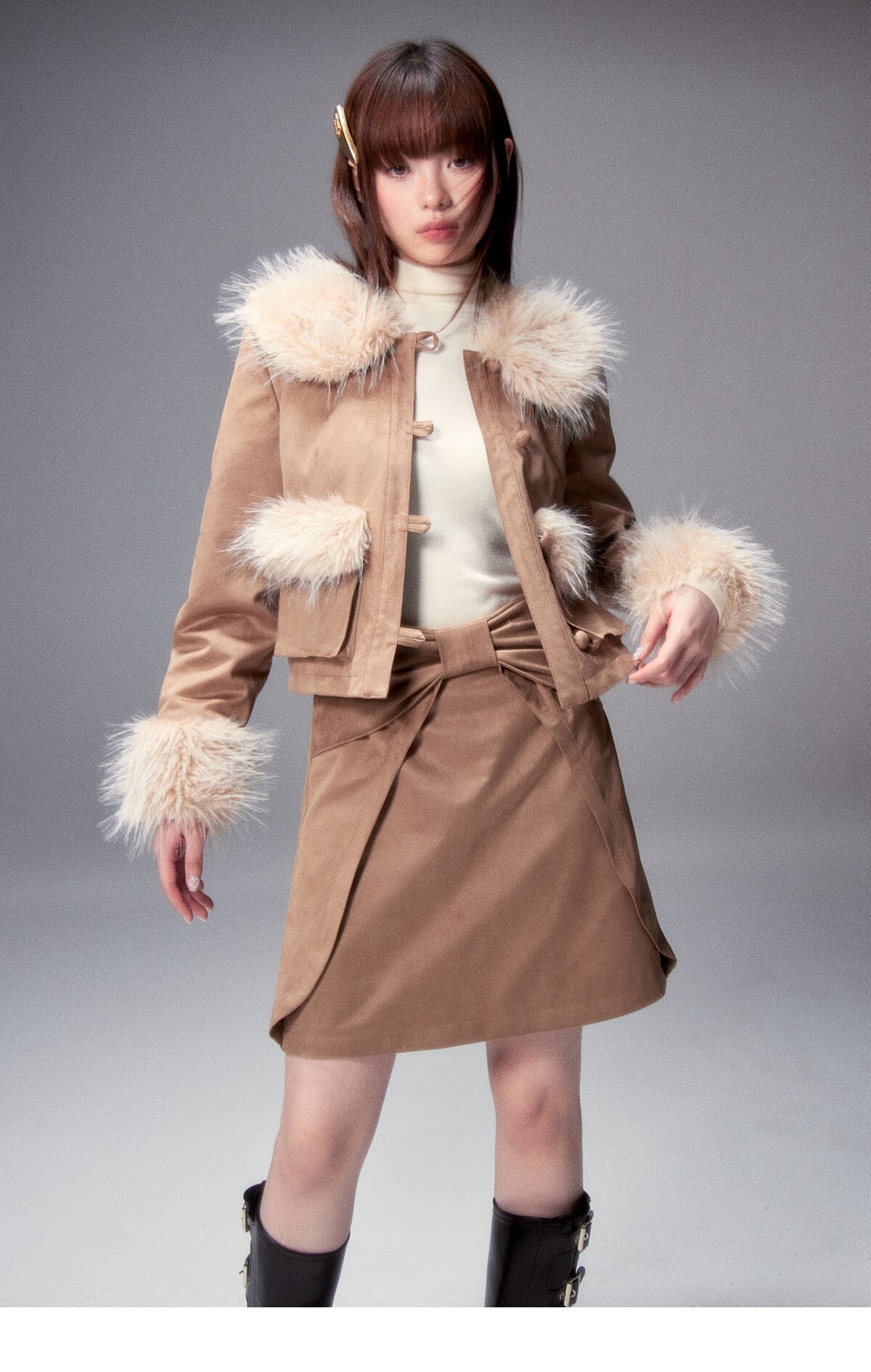 Fur Collar Bow Jacket & Bow Suede Skirt Setup NA8800