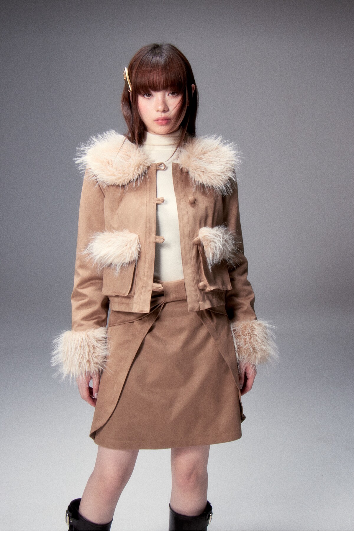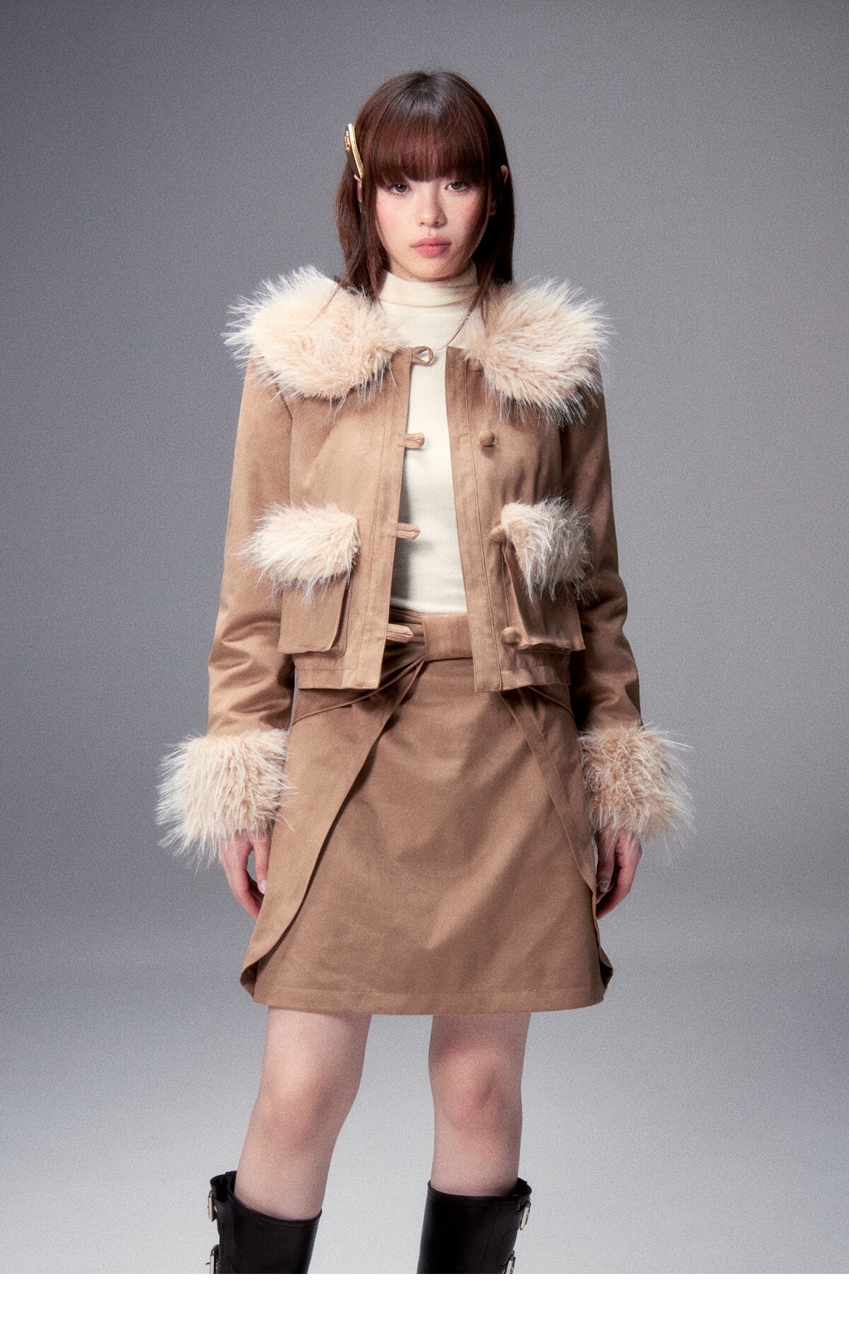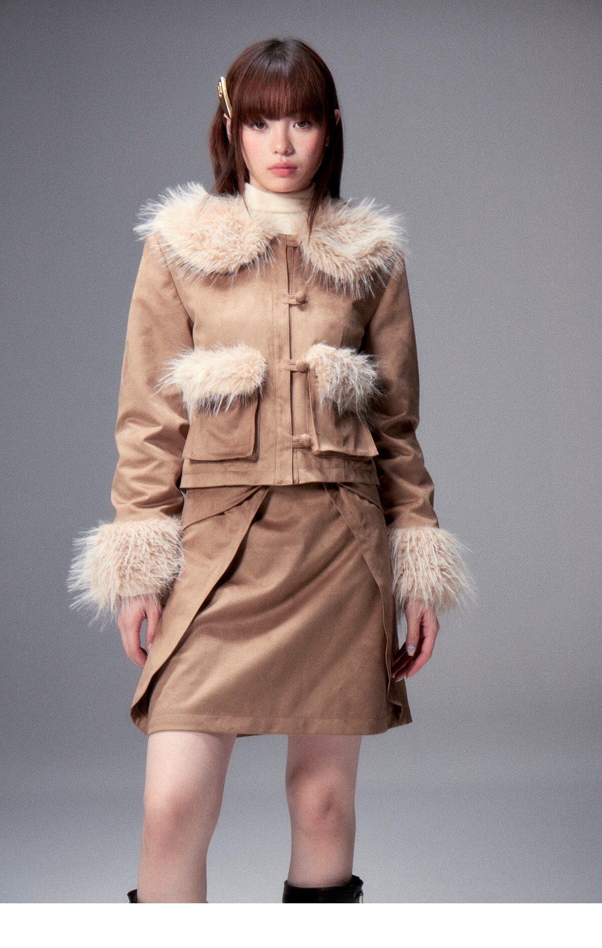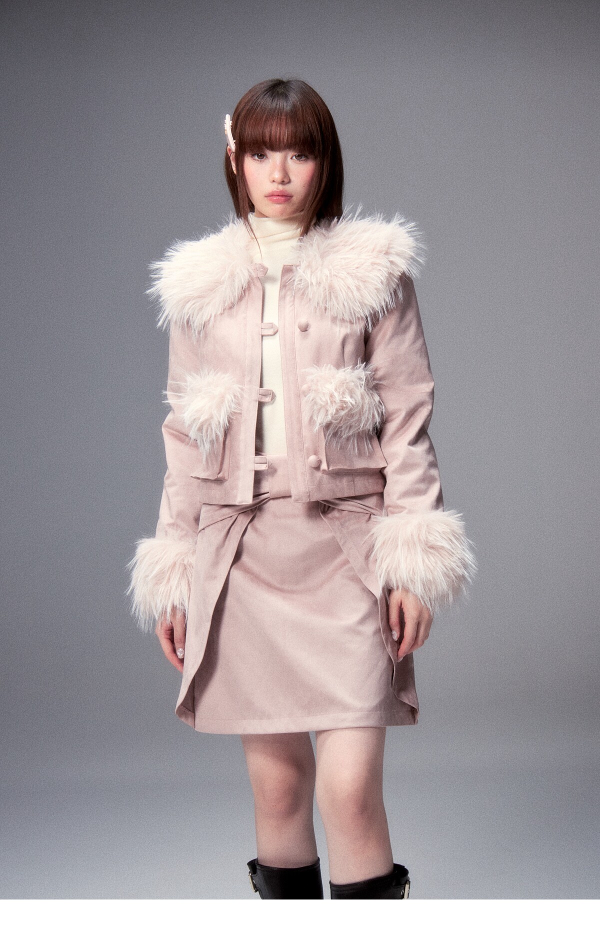 Fur Collar Bow Jacket & Bow Suede Skirt Setup NA8800