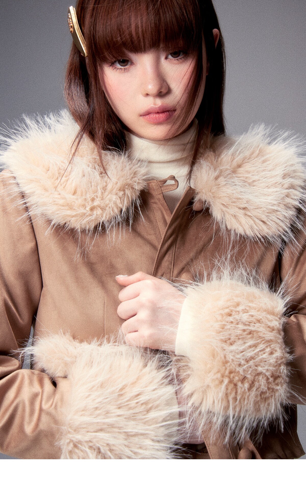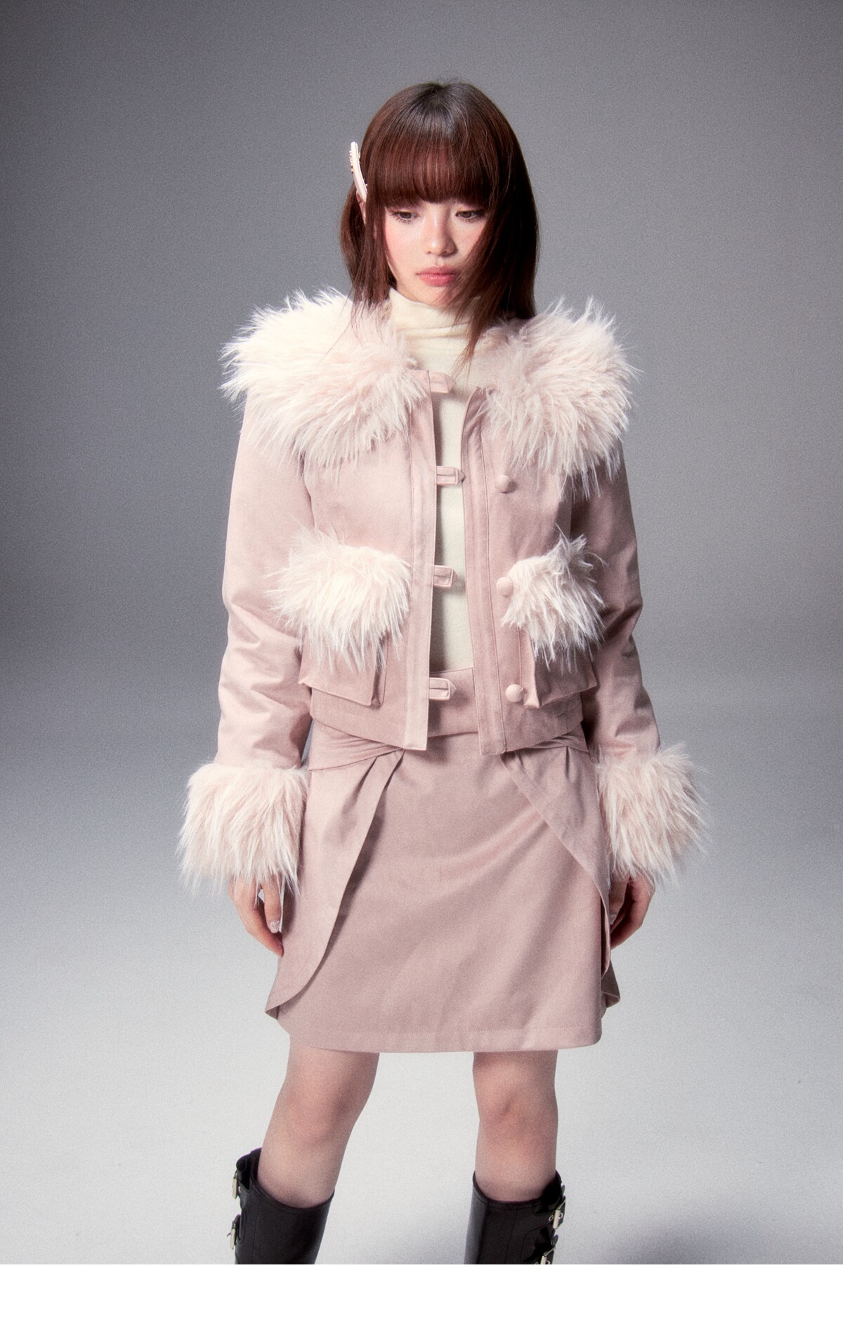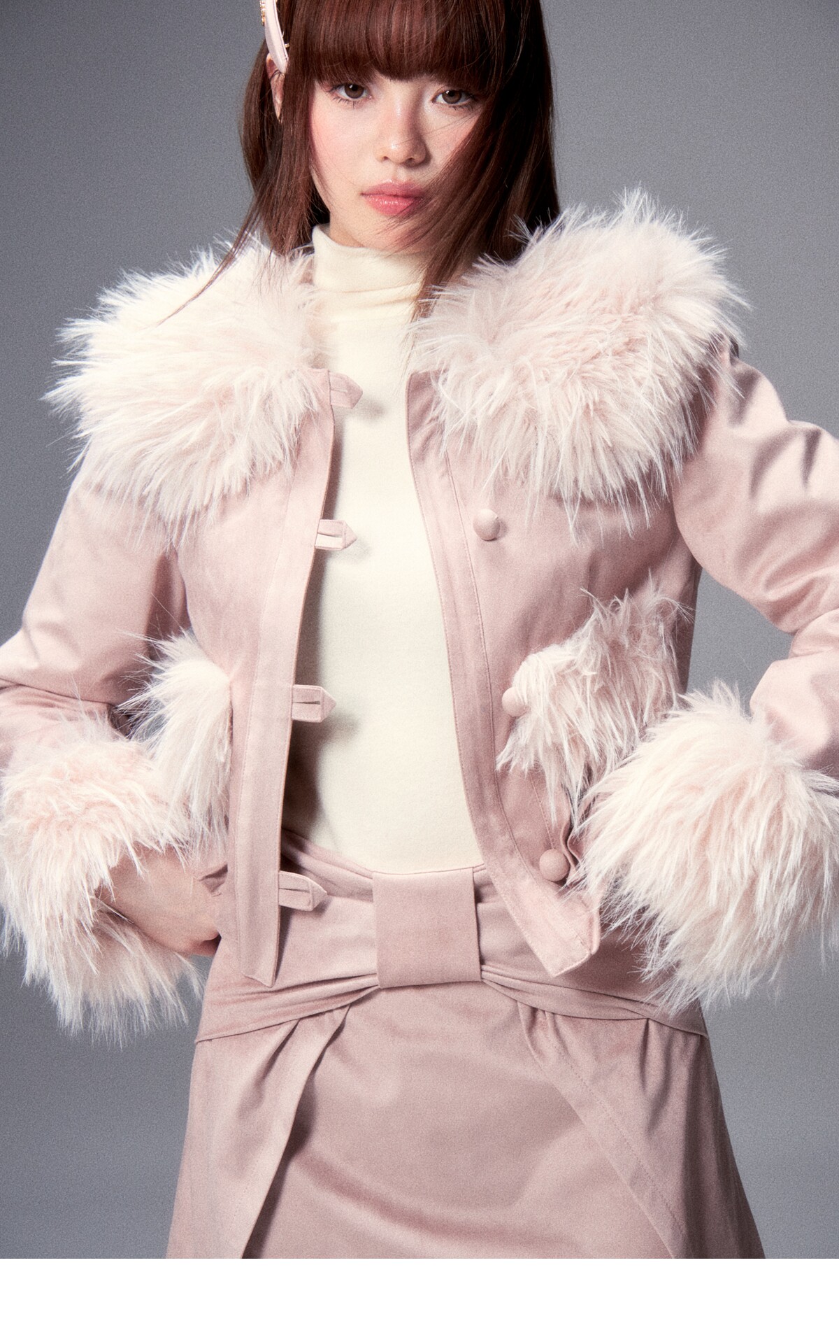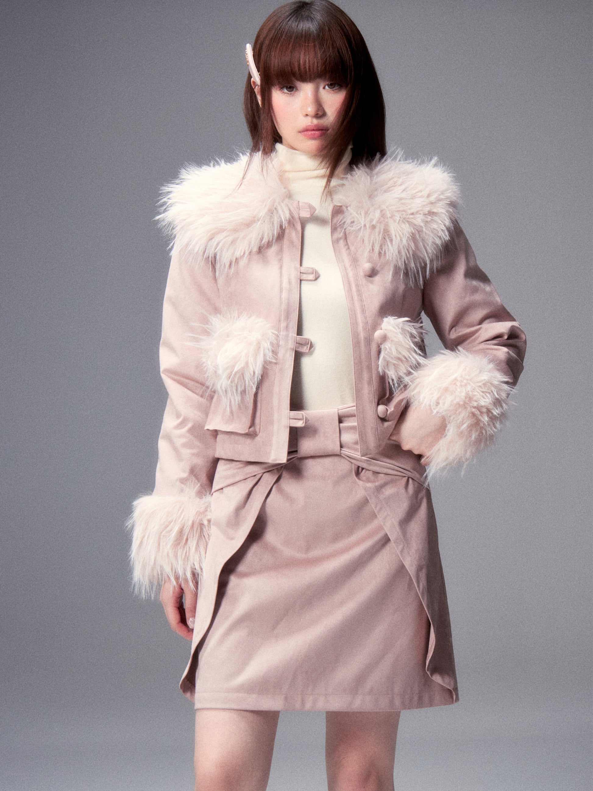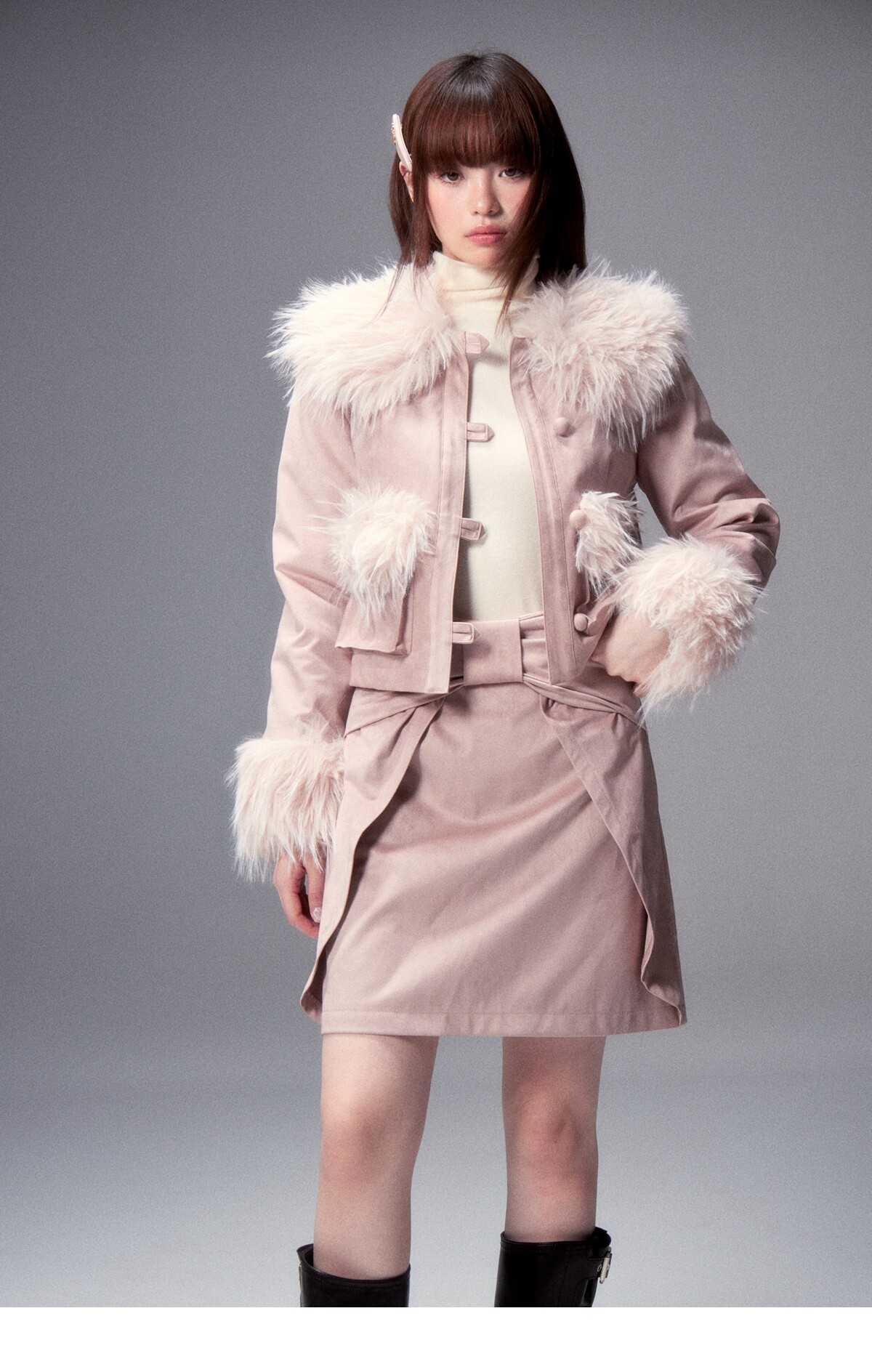 Fur Collar Bow Jacket & Bow Suede Skirt Setup NA8800