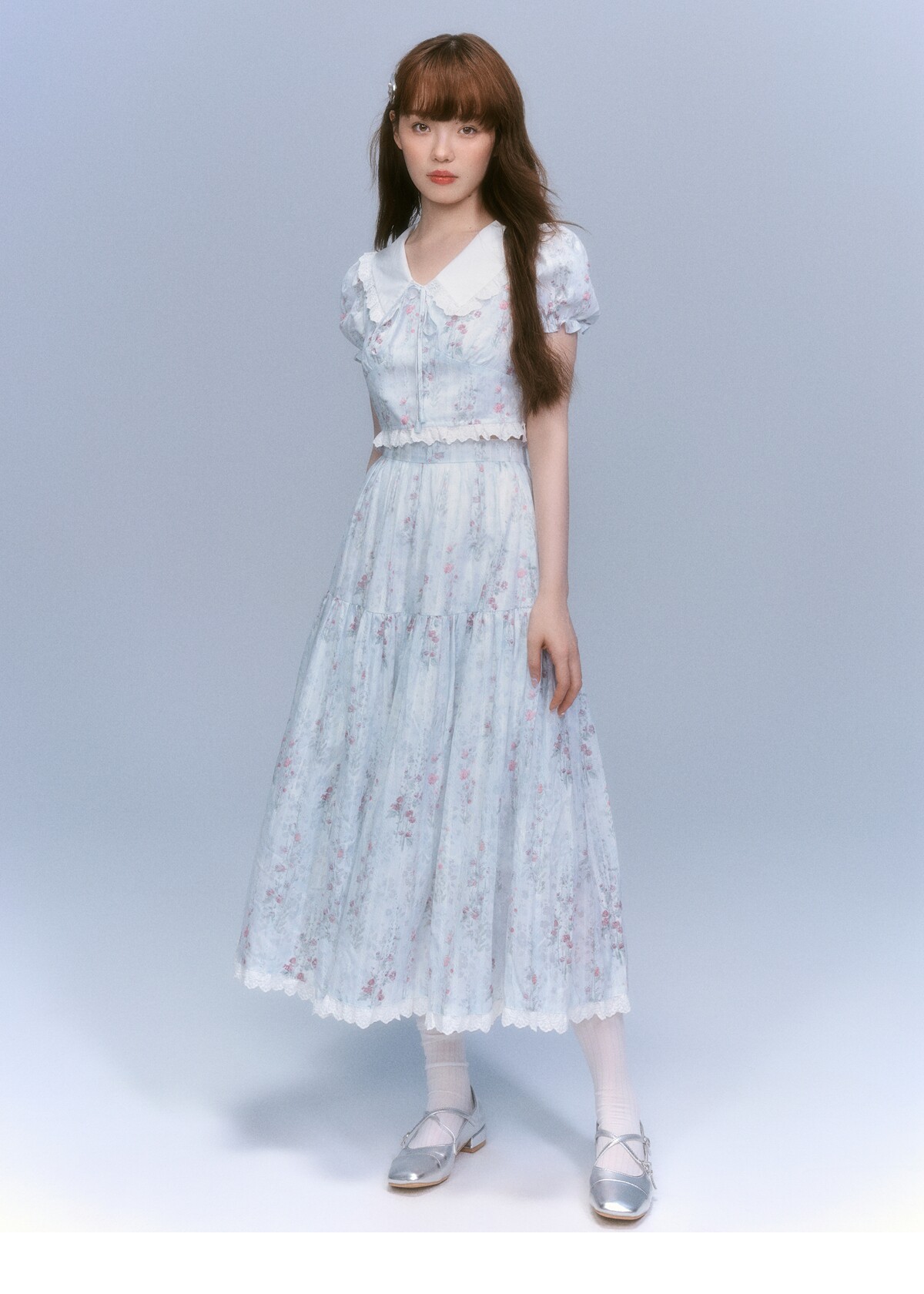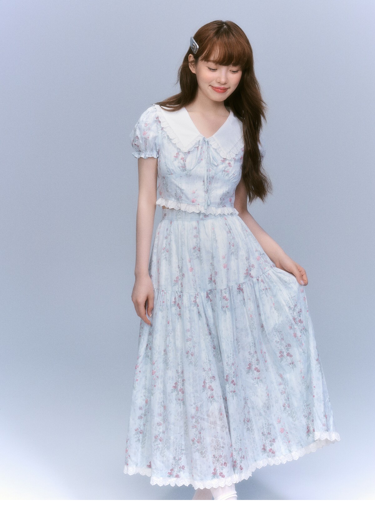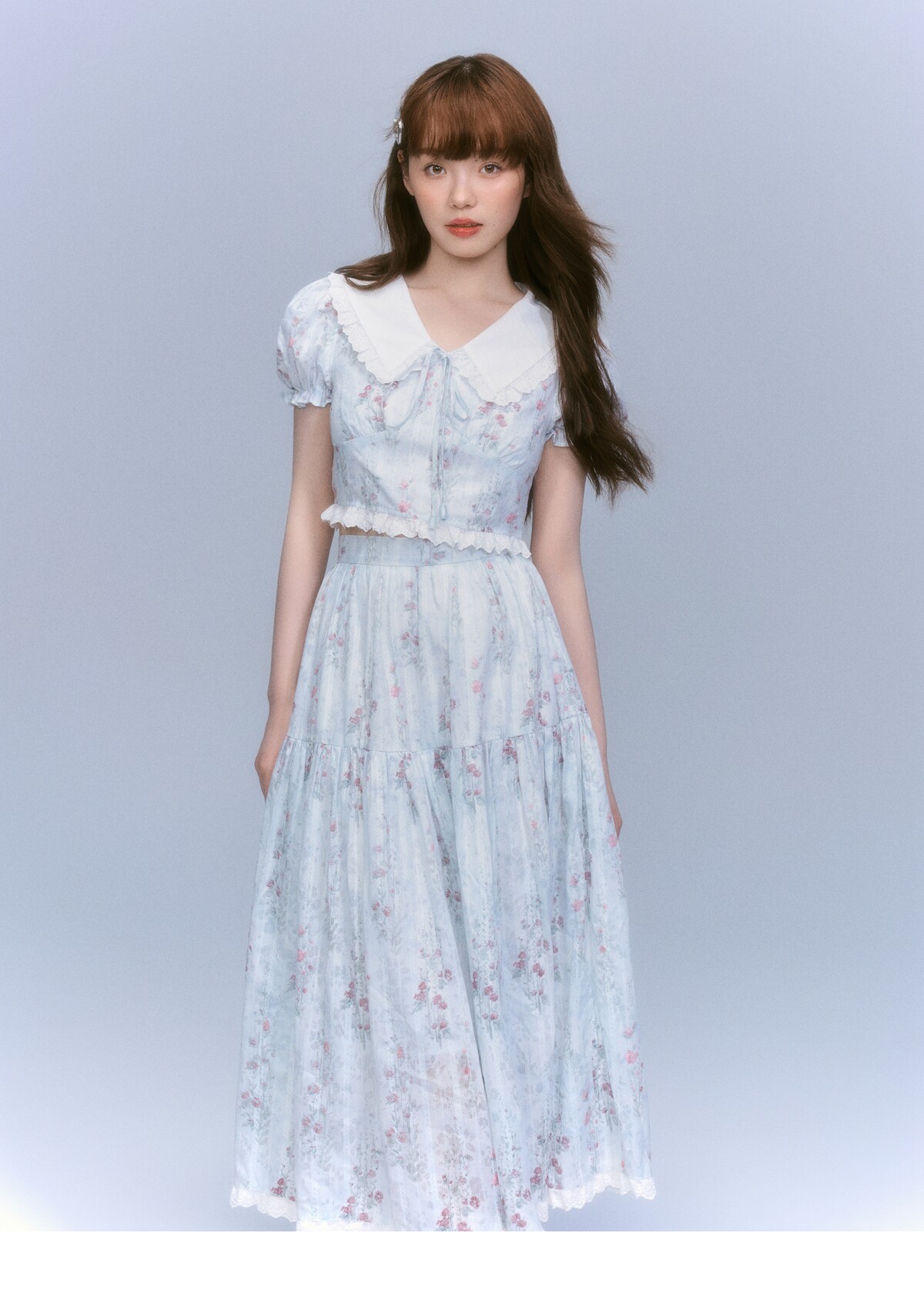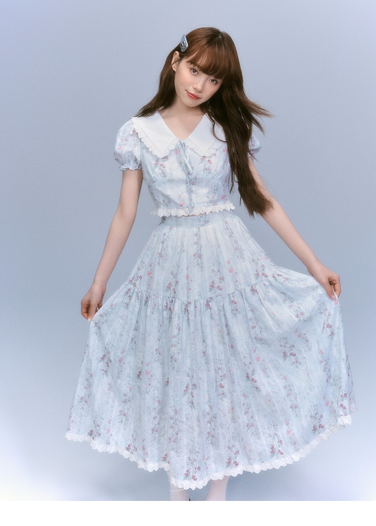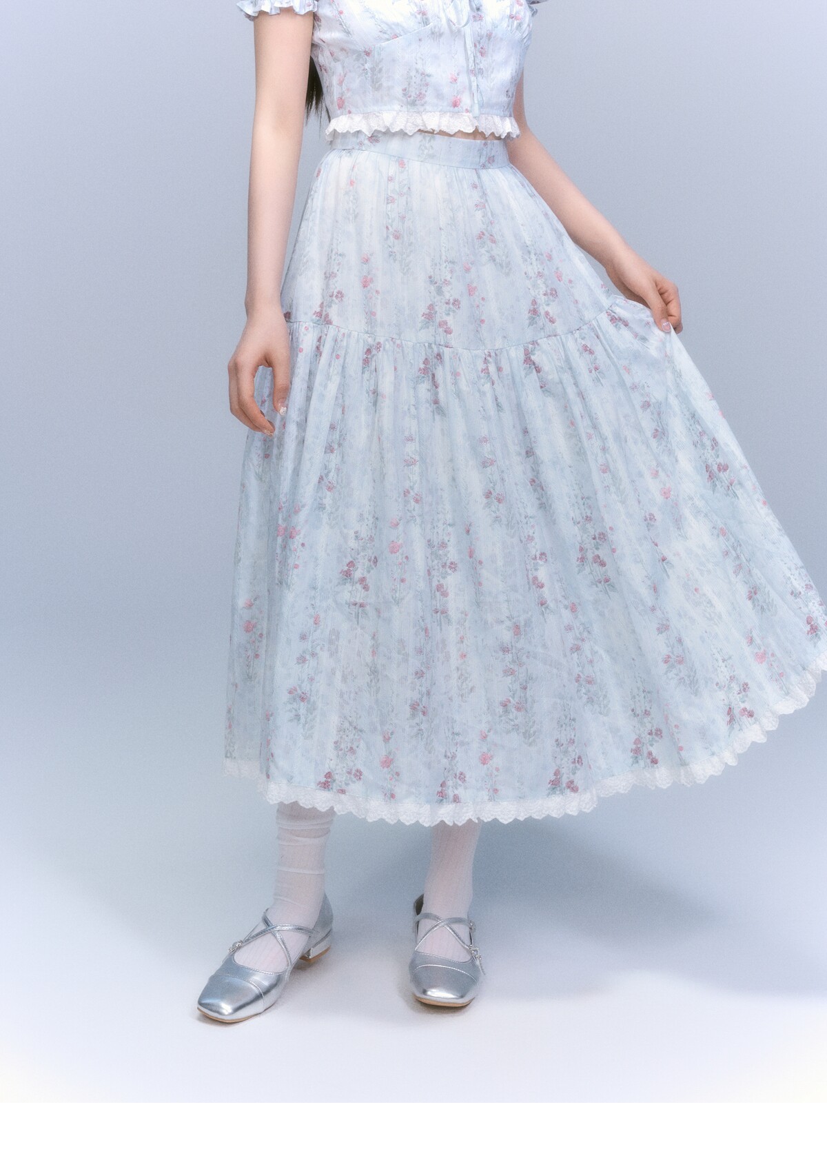 Floral-Print Blouse & Lace Trim Flared Skirt Setup NA8827