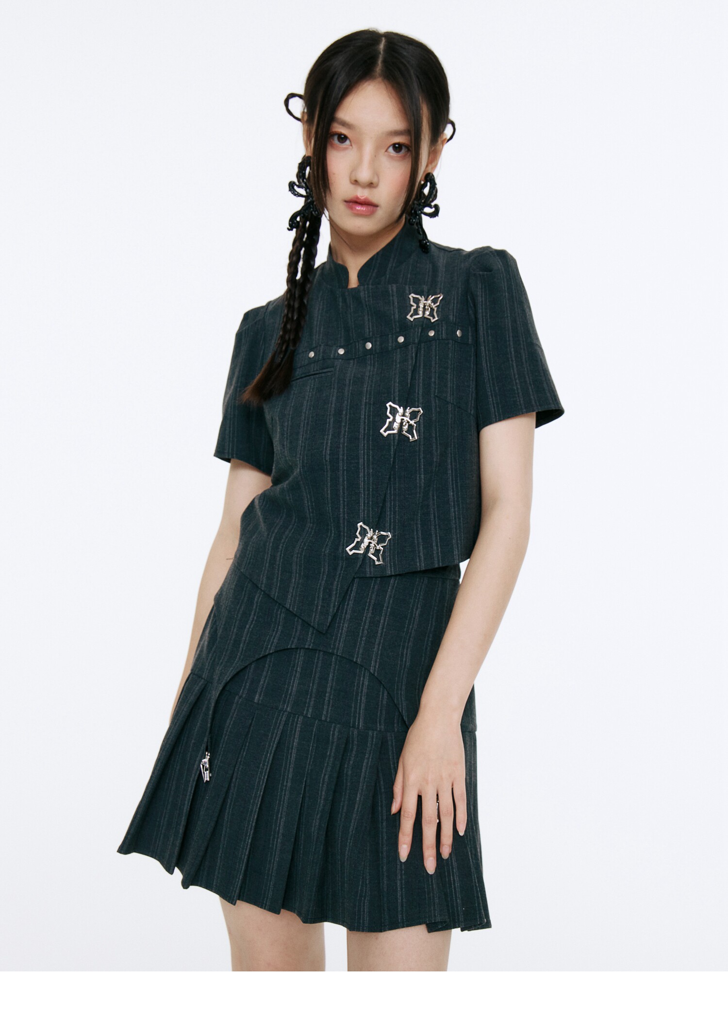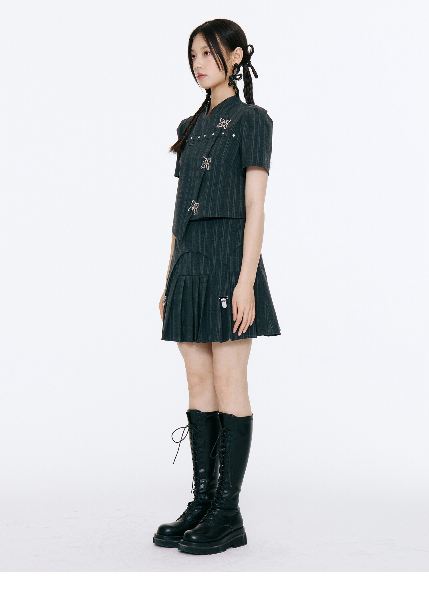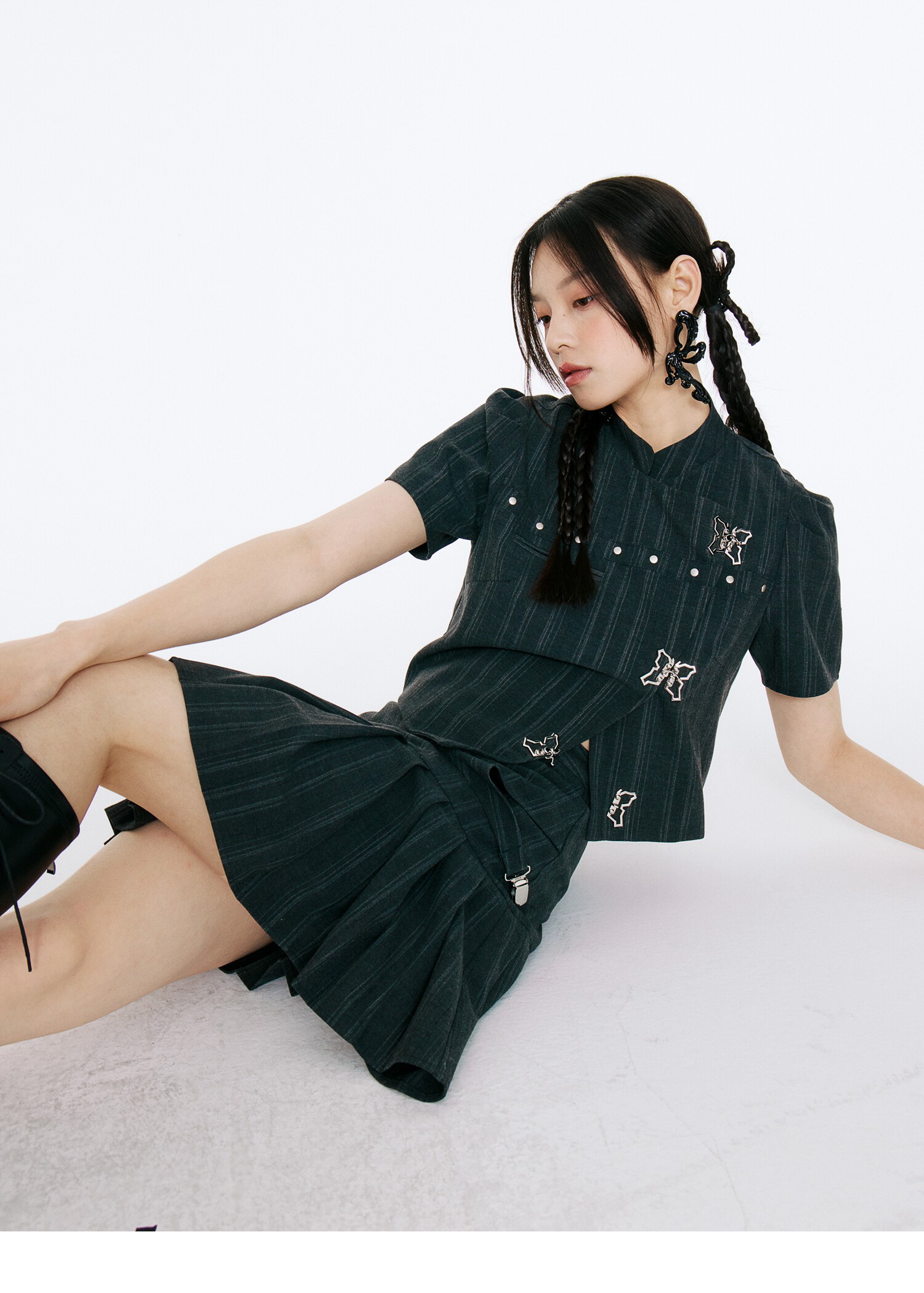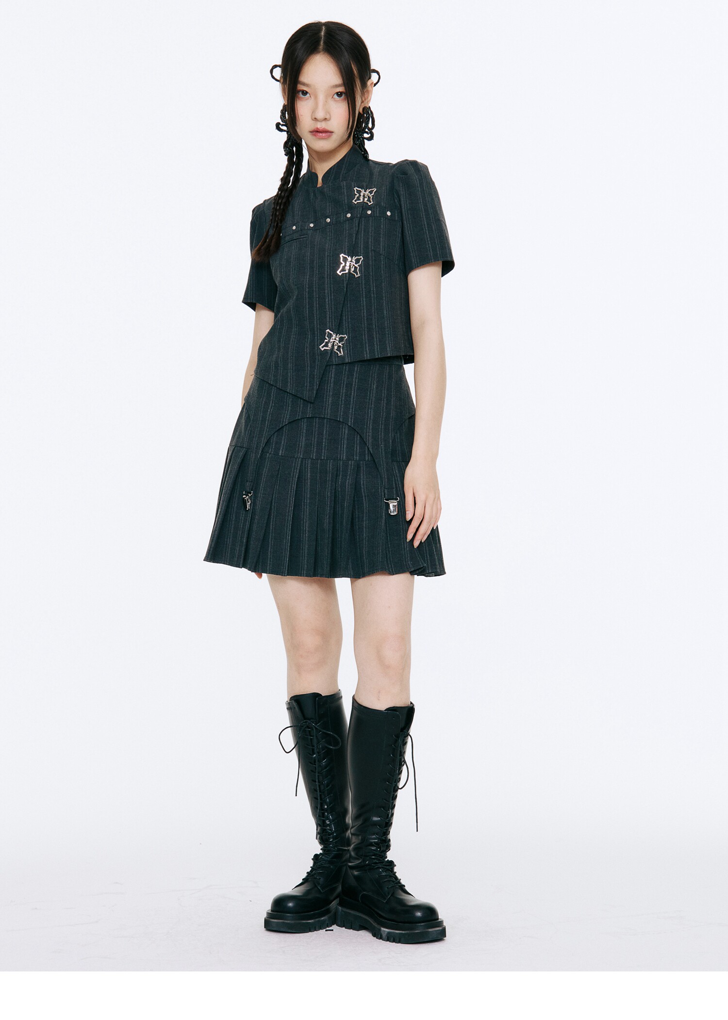 Bow Detail Pinstripe Cropped Shirt & Pleated Skirt Setup NA8838
