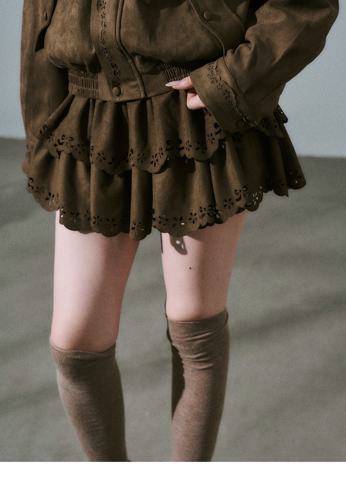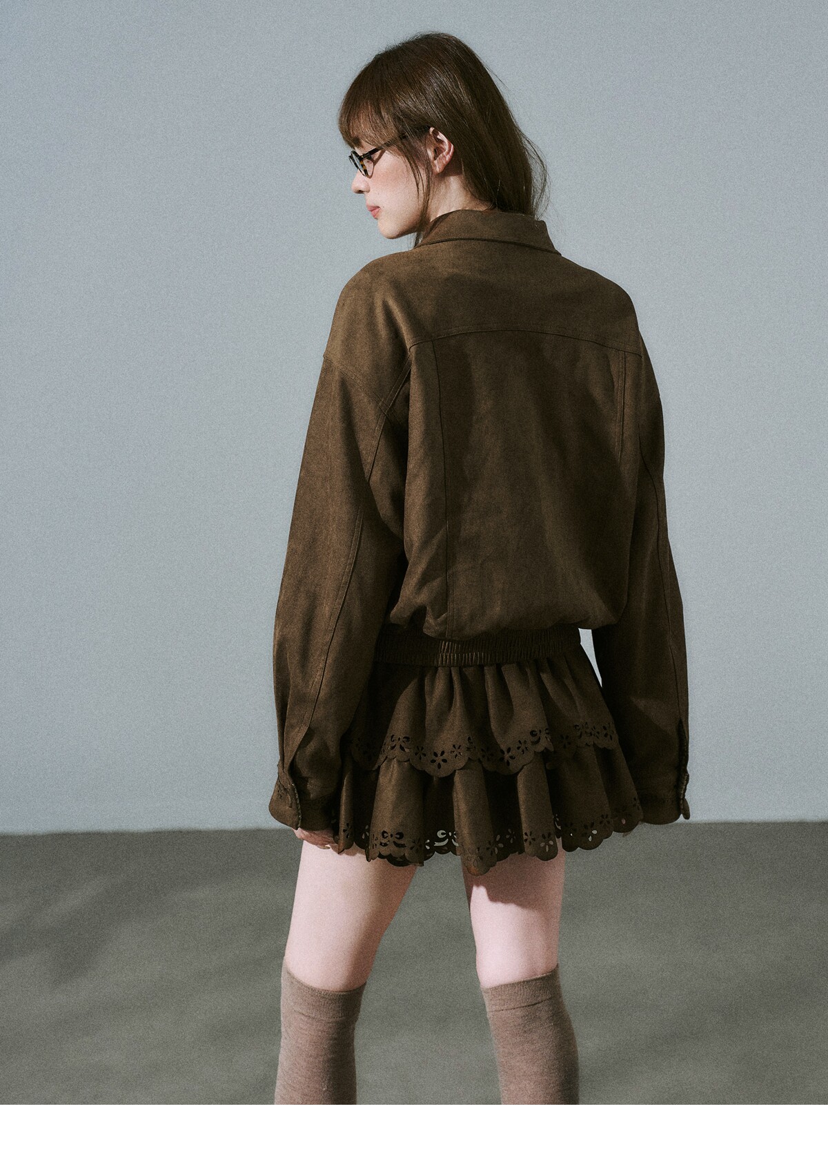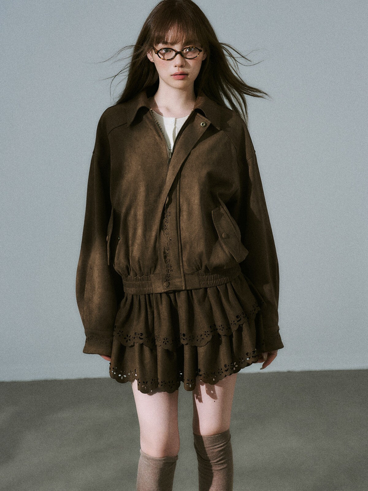 Suede Zipper Jacket & Scalloped Skirt Setup NA8854