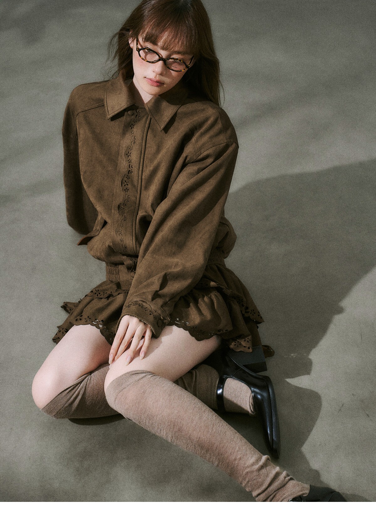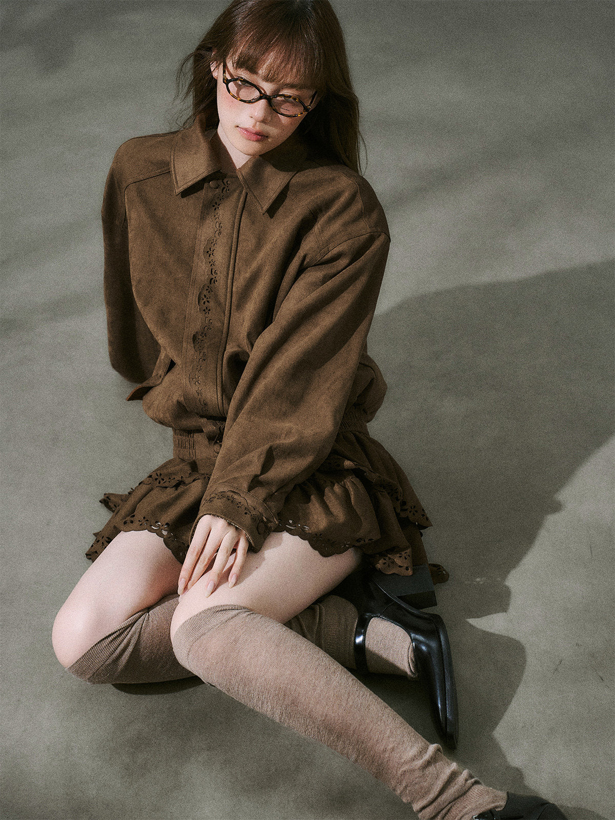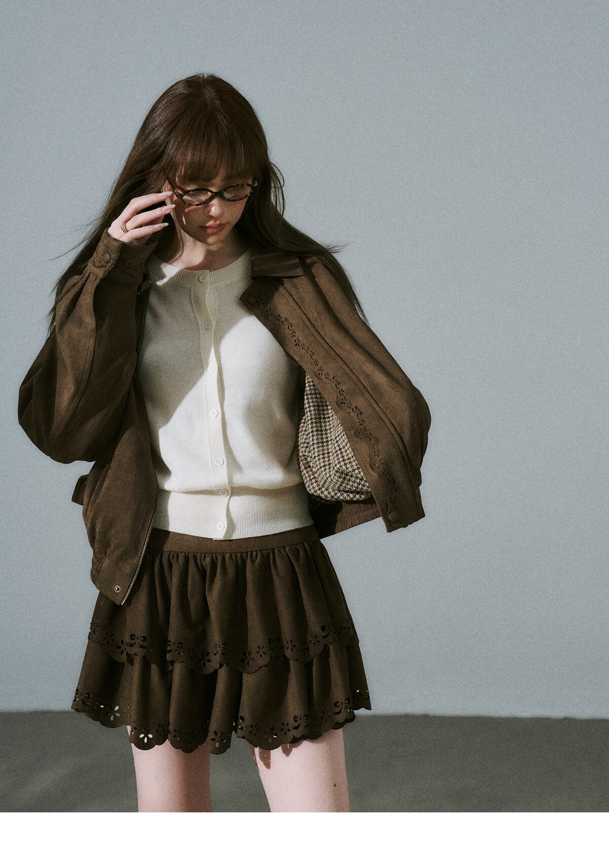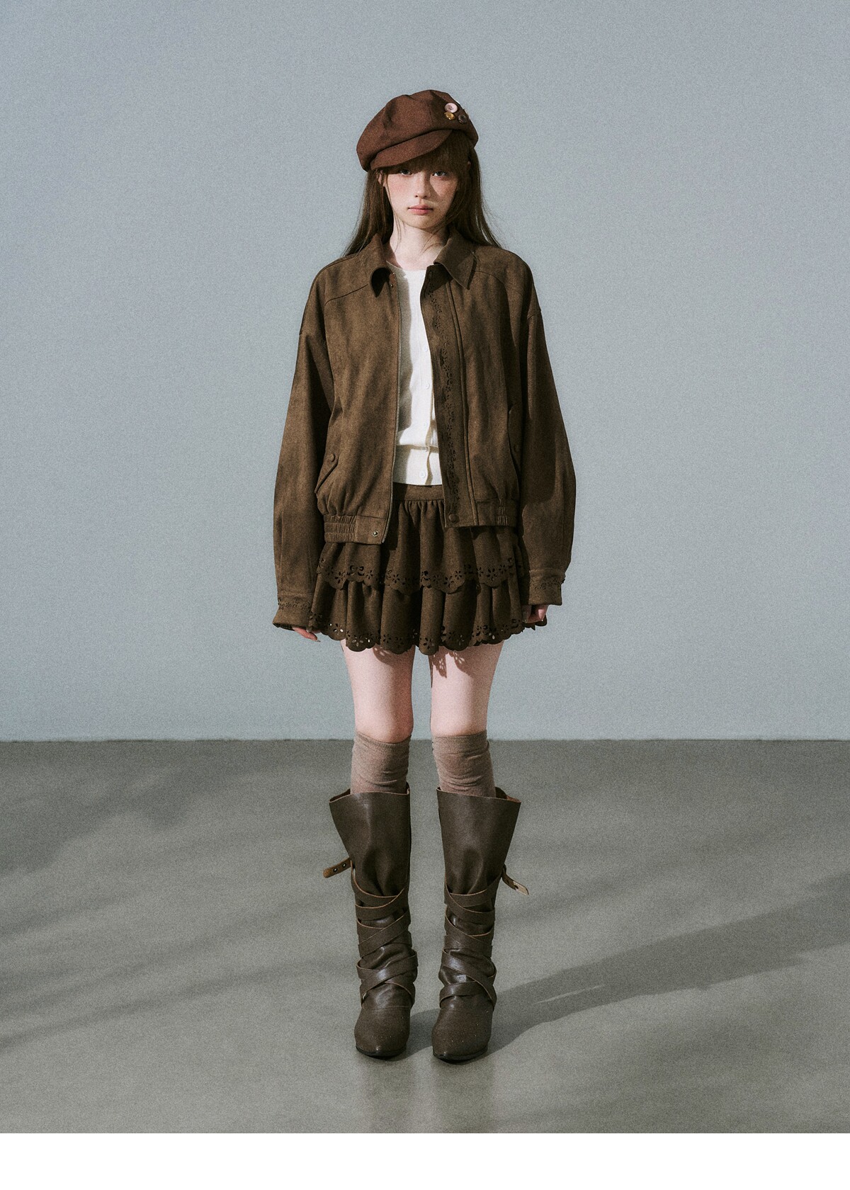 Suede Zipper Jacket & Scalloped Skirt Setup NA8854
